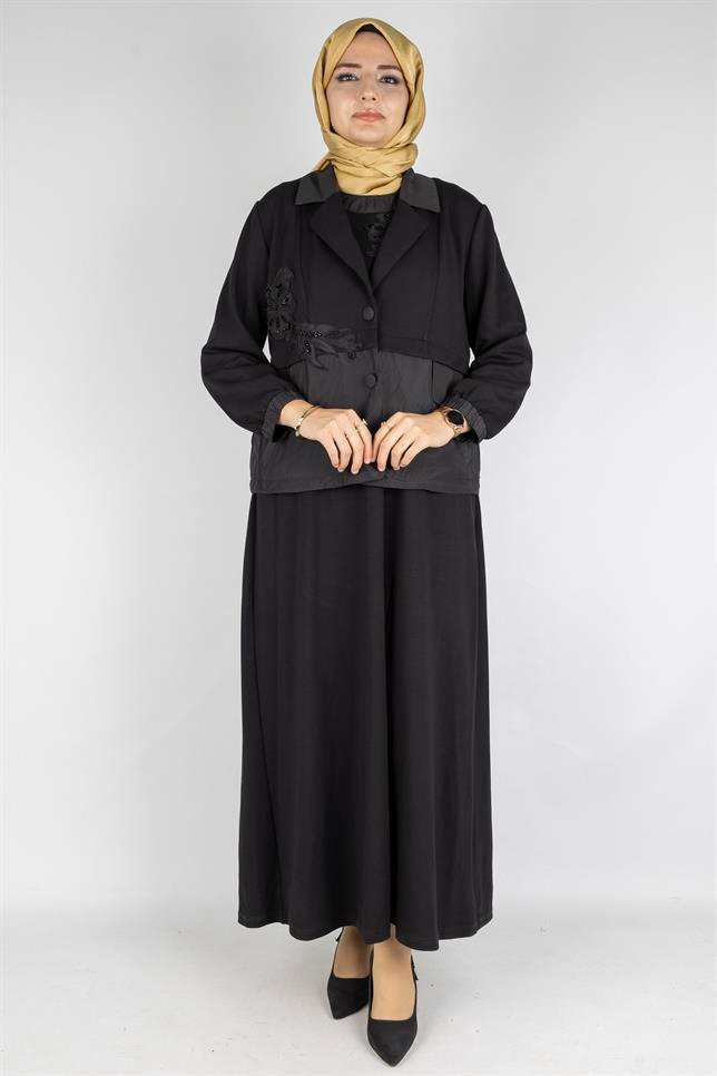İç kısmındaki uzun kollu elbise, vücuda oturmadan dökülen yumuşak yapısıyla konfor sağlarken, dışındaki kısa boy ceket modern bir katman etkisi oluşturur. Mat saten parlaklığına sahip çelik örme kumaş formunu korur, kırışma yapmaz ve dört mevsim rahatlıkla kullanılabilir.