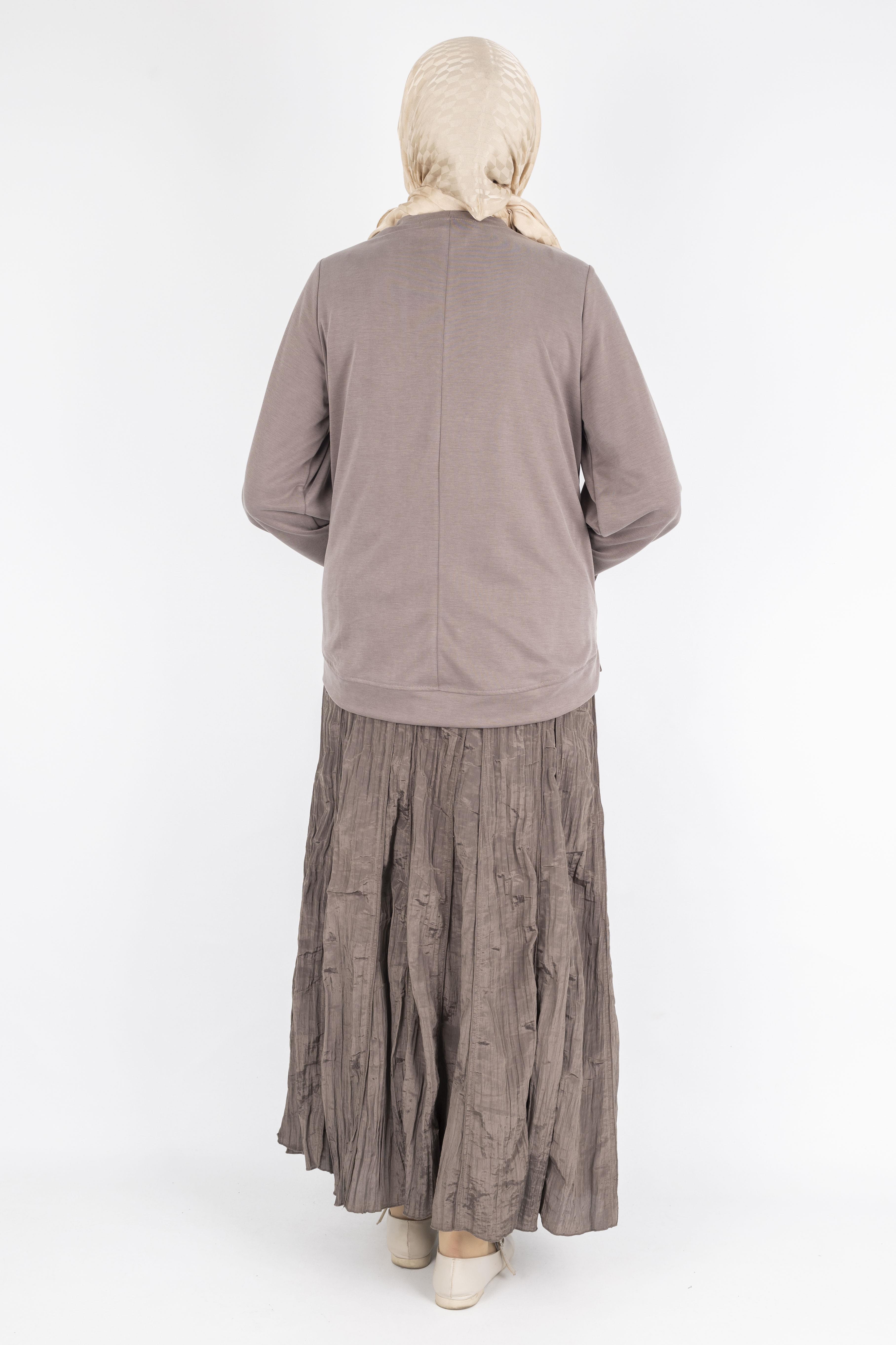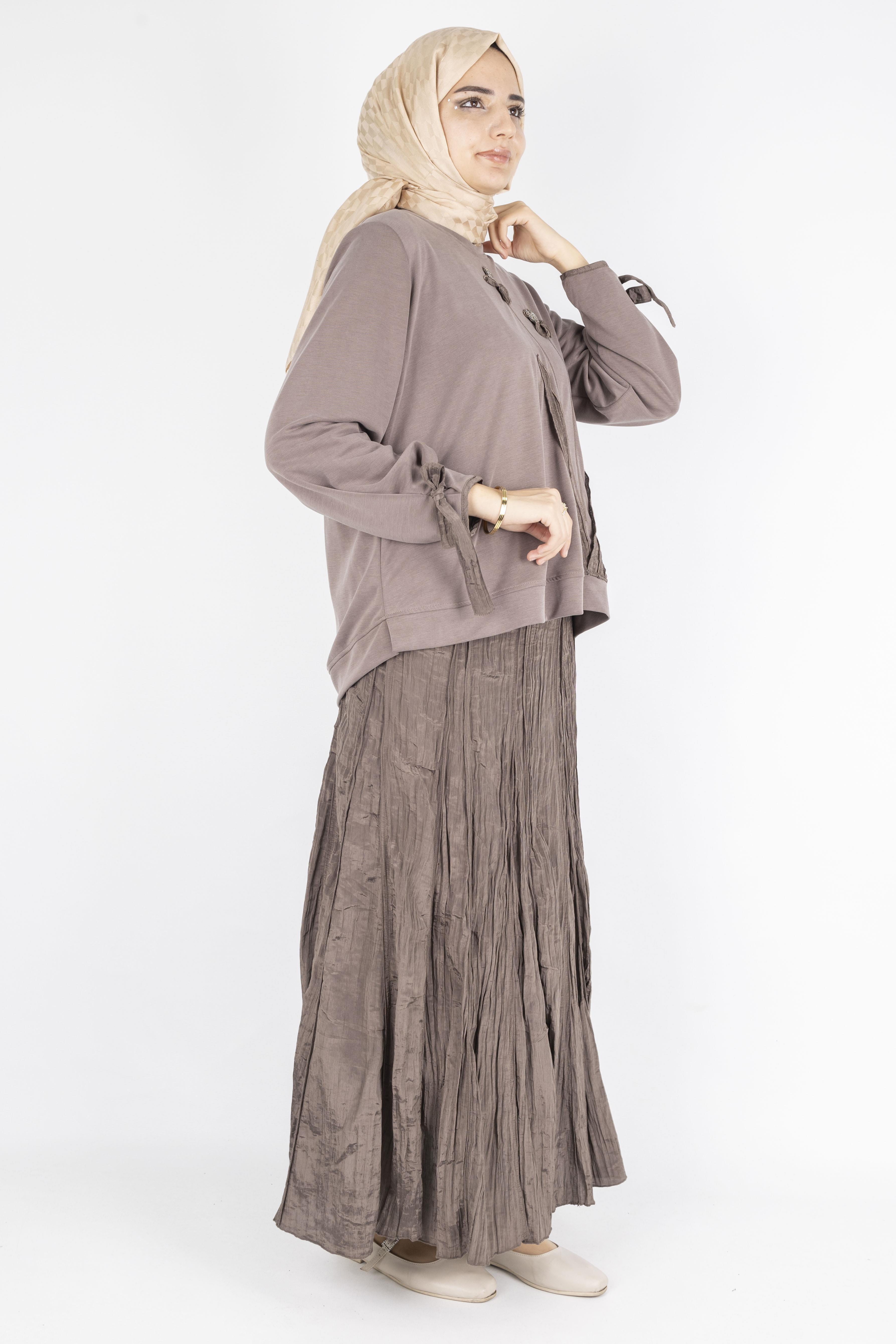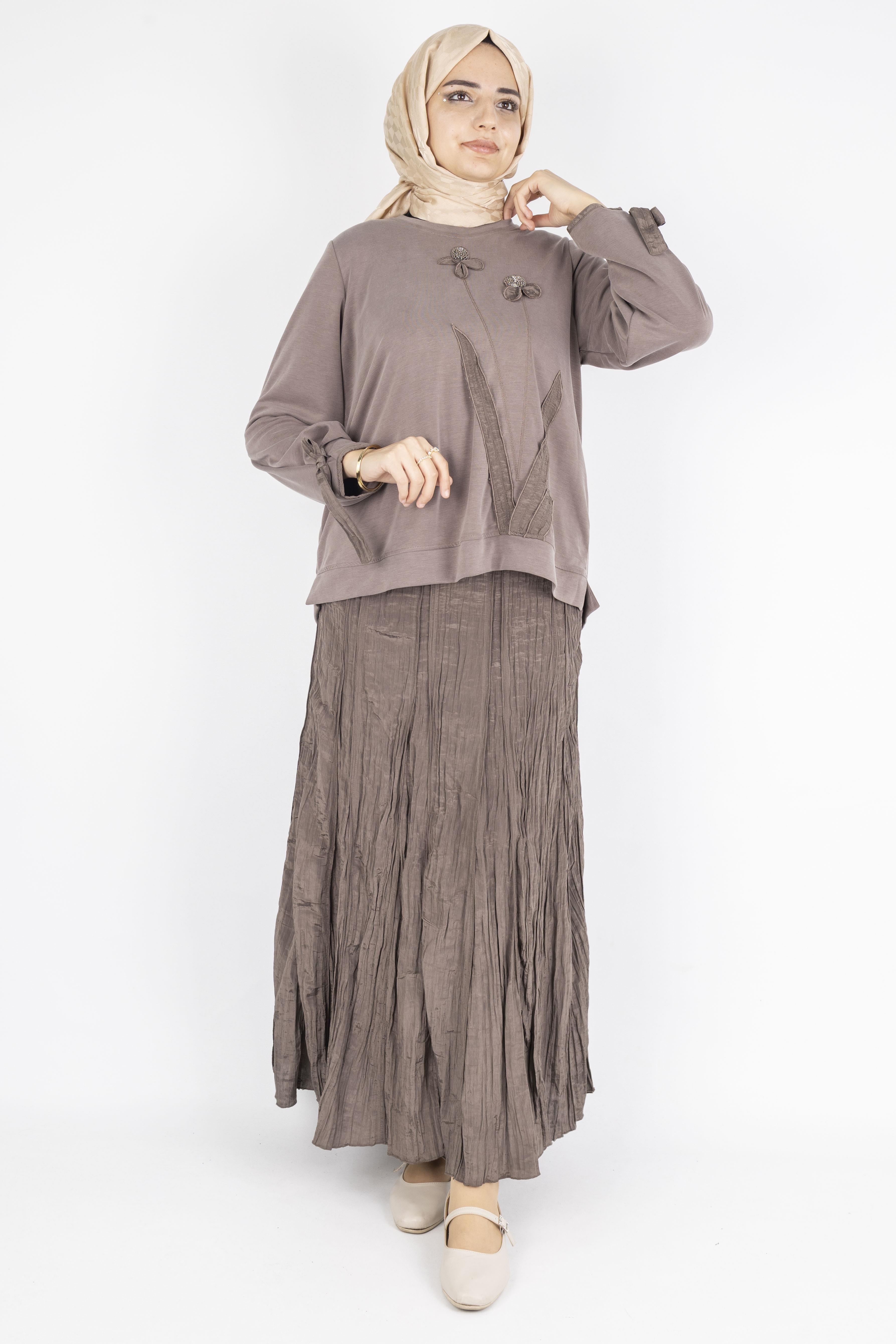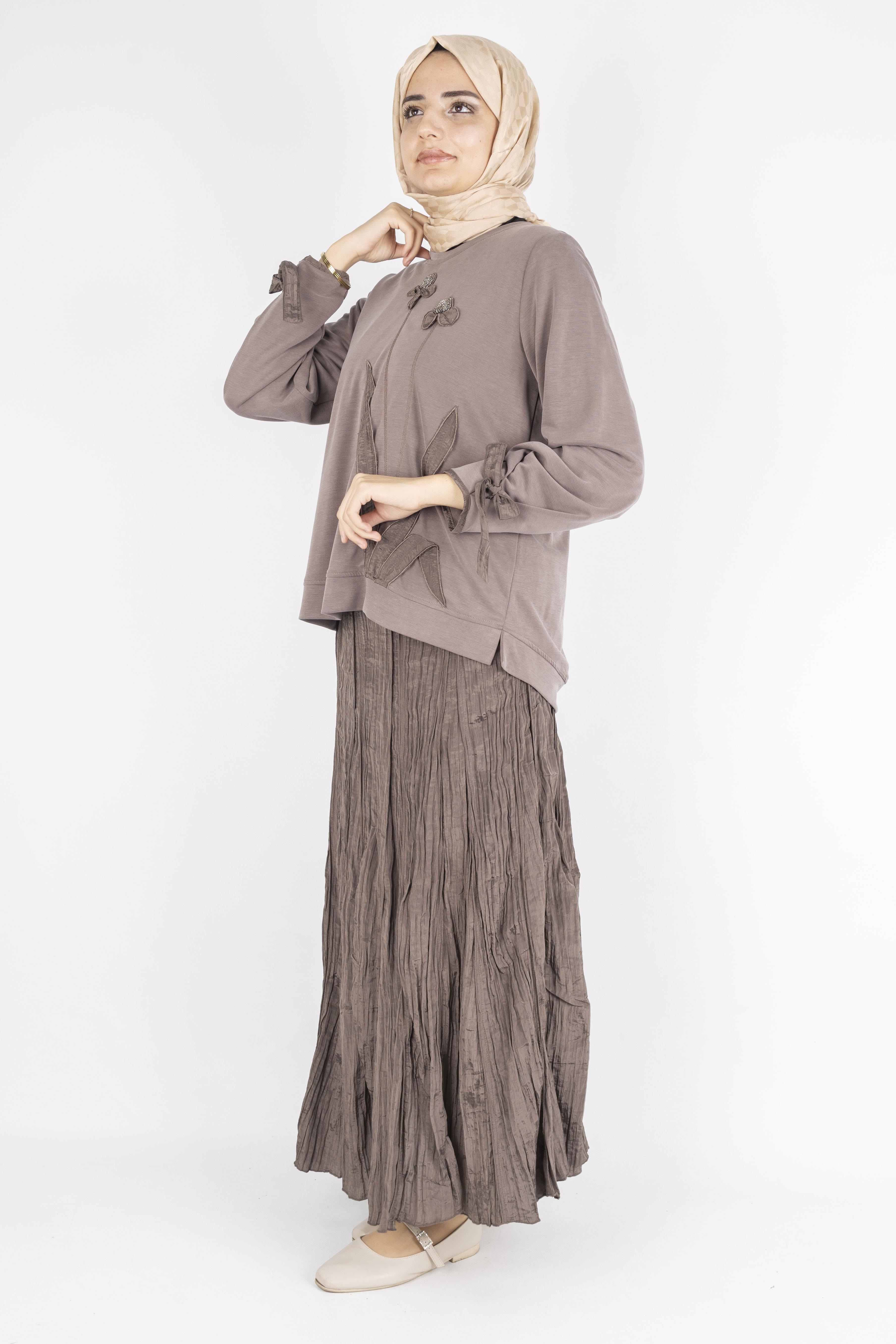 Aplike Detaylı Üst Pileli Crinkle Etek Takımı Kahve OTW5959