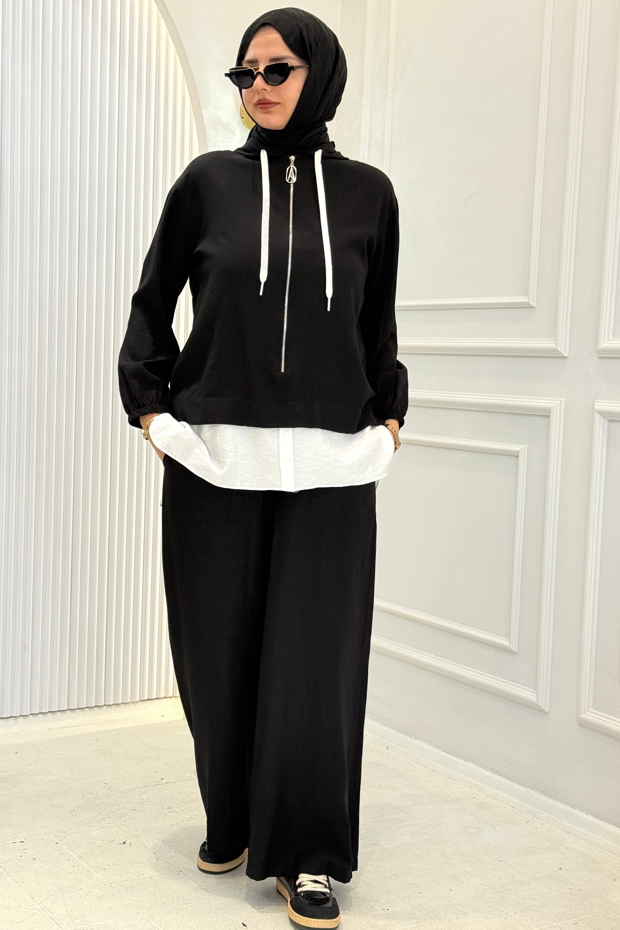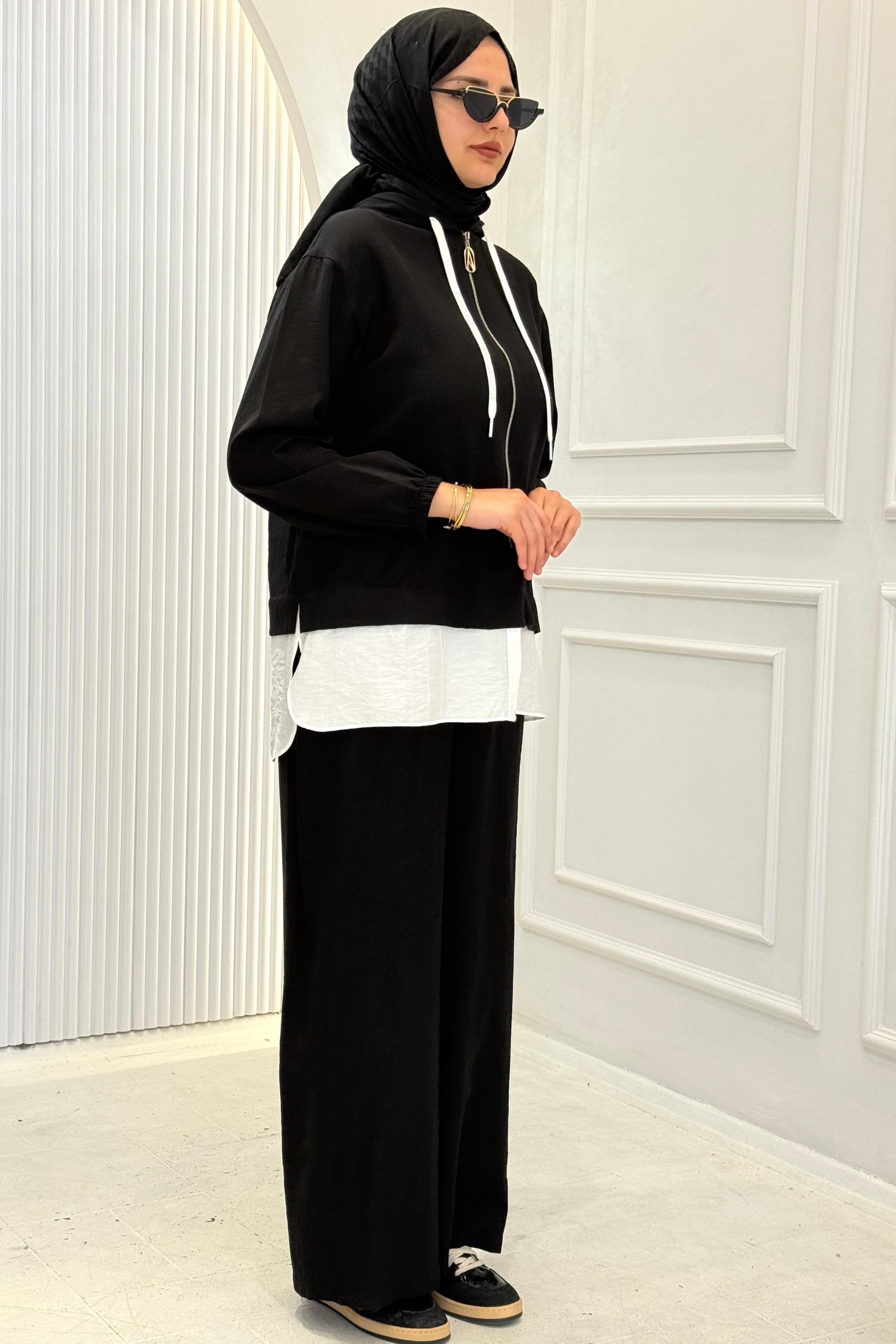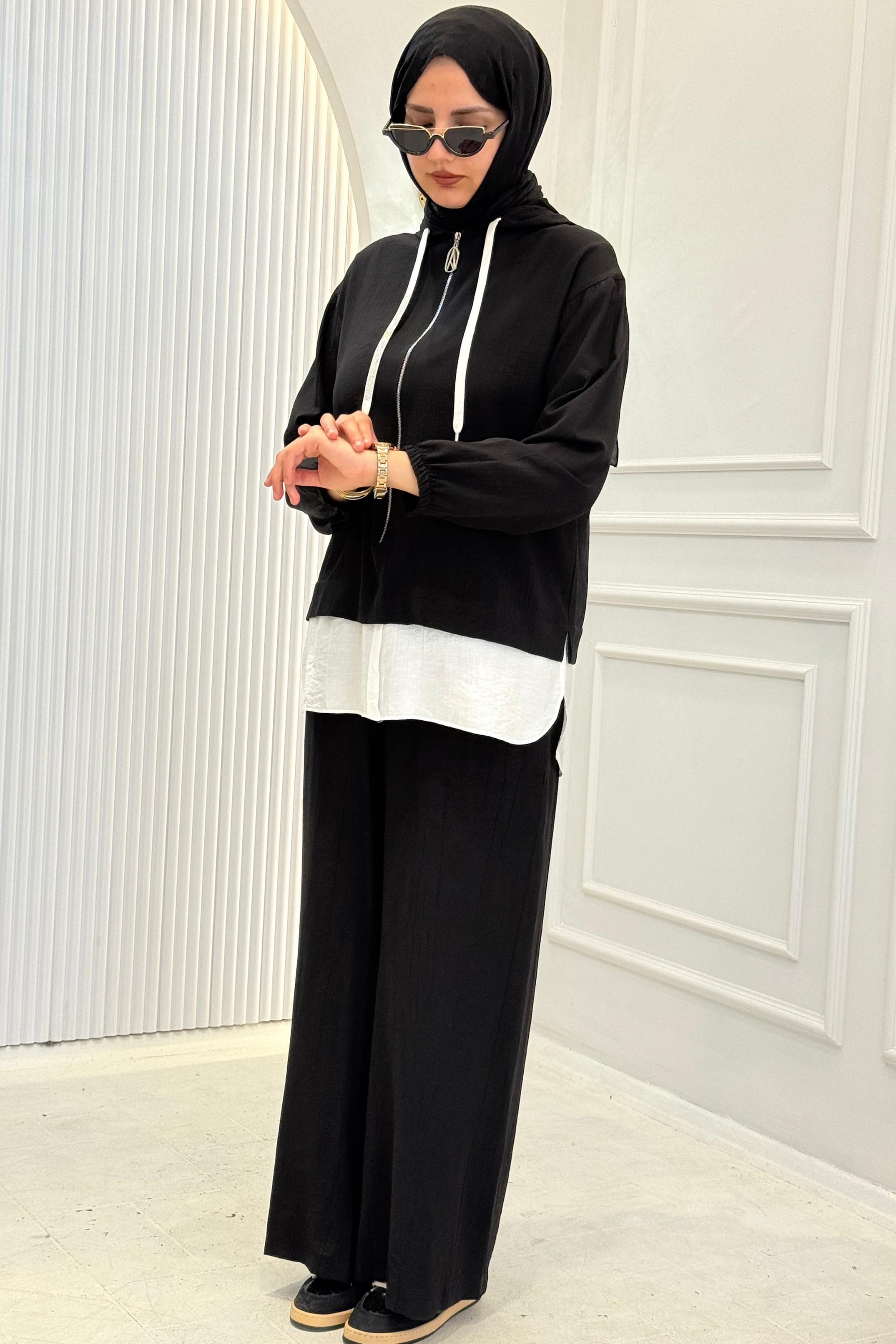 Çilek kumaş yapısı sayesinde konforlu bir kullanım sunar.Kapüşonlu tunik ve bağcık detayı modele sportif bir hava katar.Dökümlü pantolonu ile rahat hareket imkanı sağlar.Gün boyu rahatlık isteyenler için ideal bir takımdır.