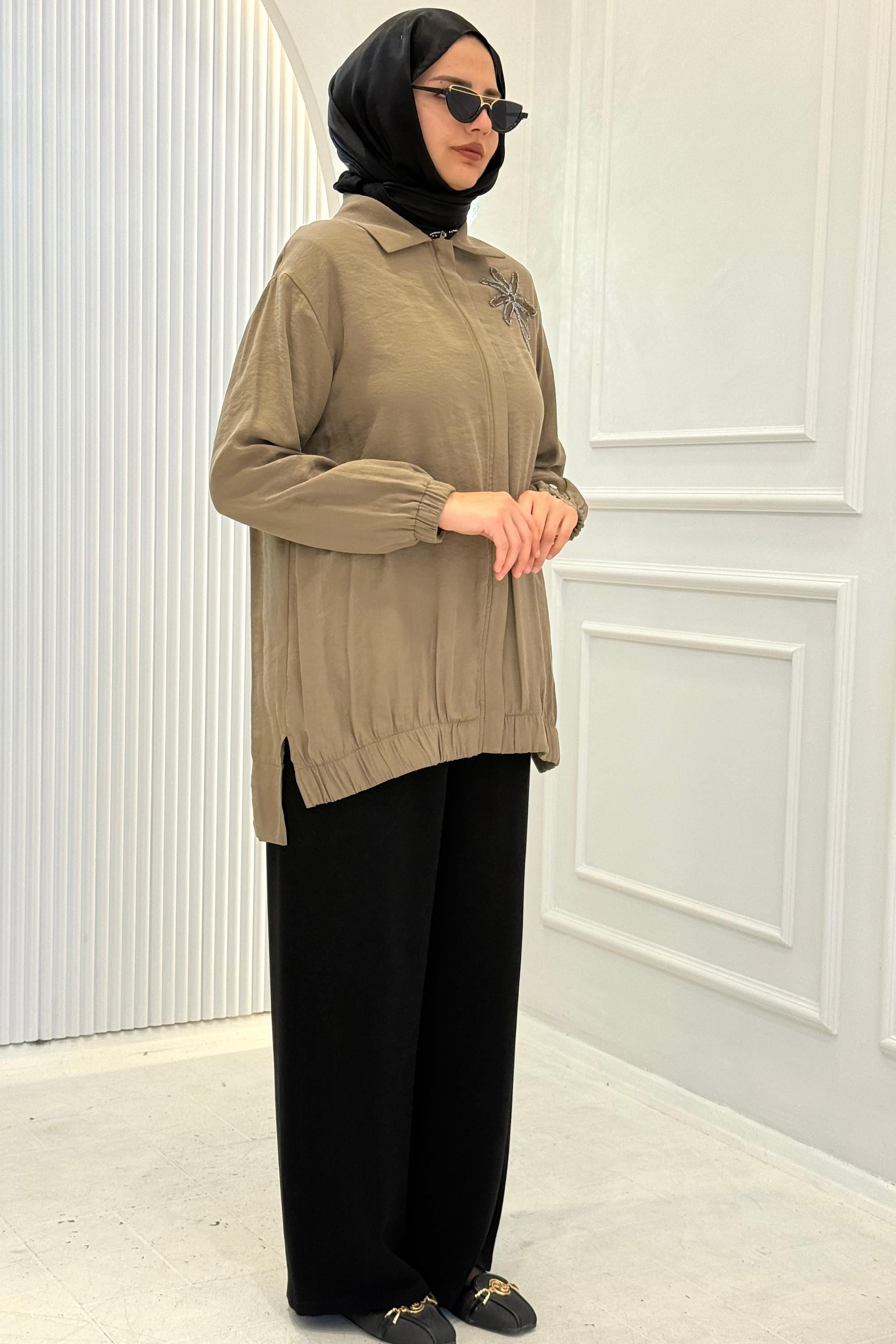 Armine Trend Taş Detaylı Tesettür Gömlek Tunik Yağ Yeşili OTW405