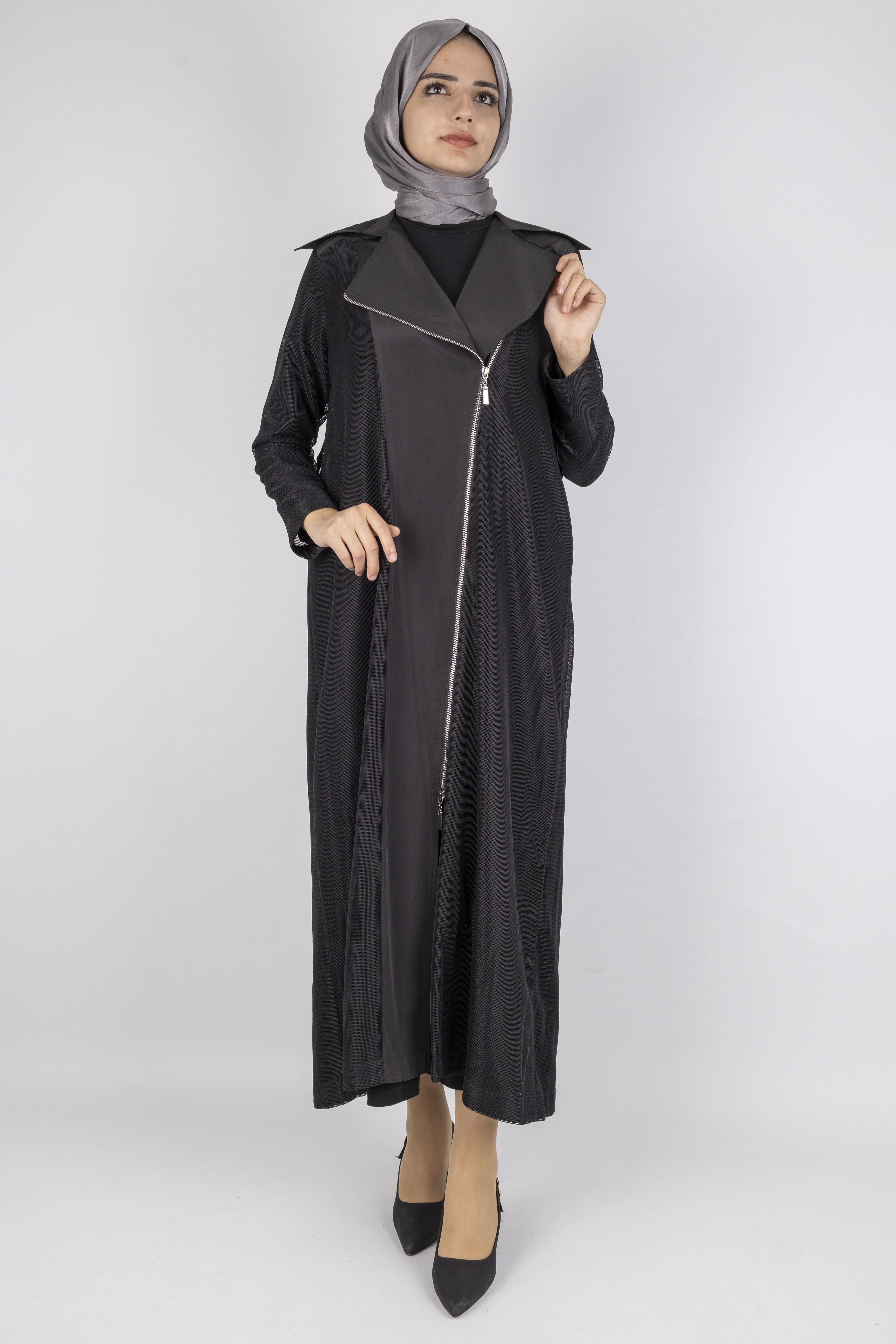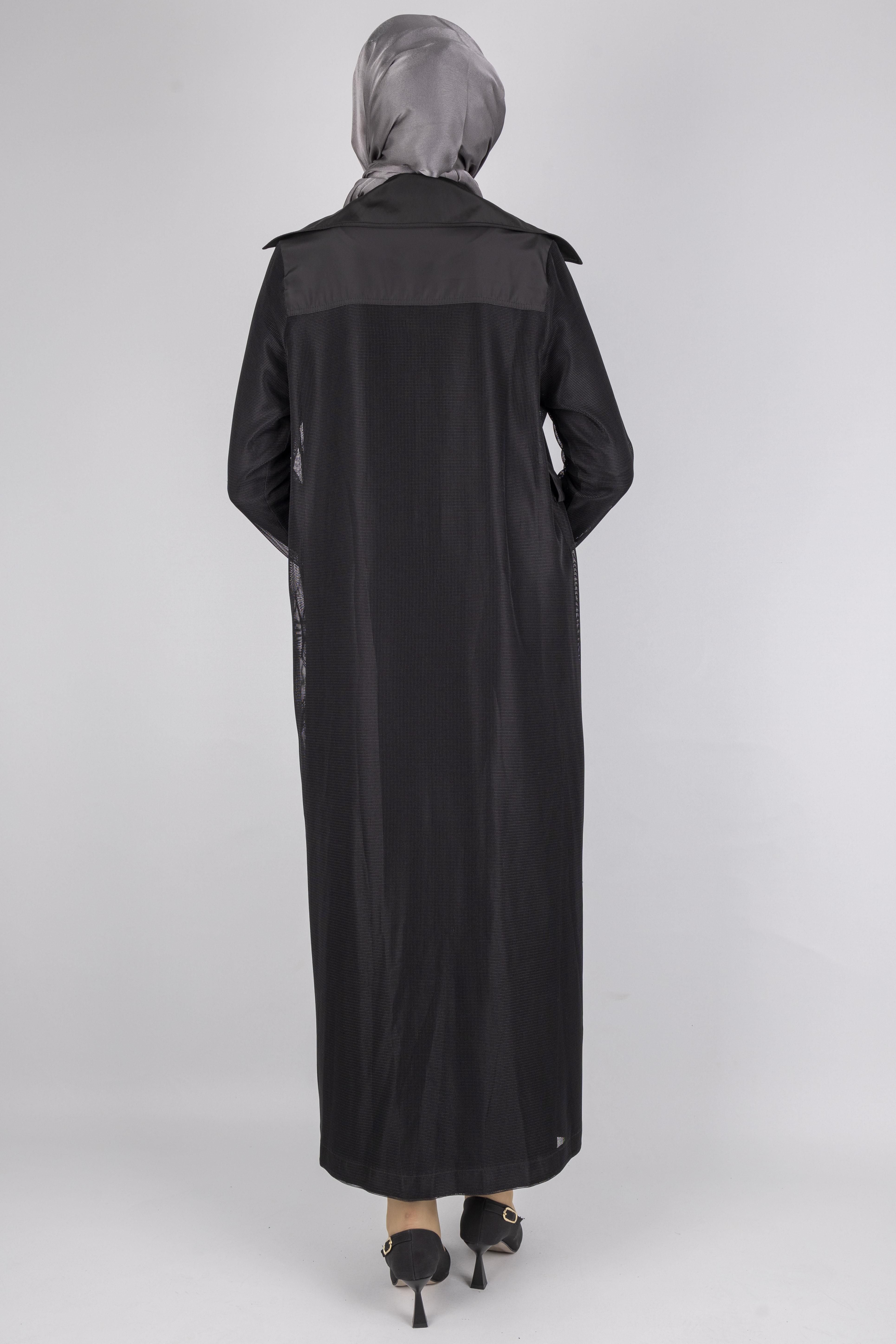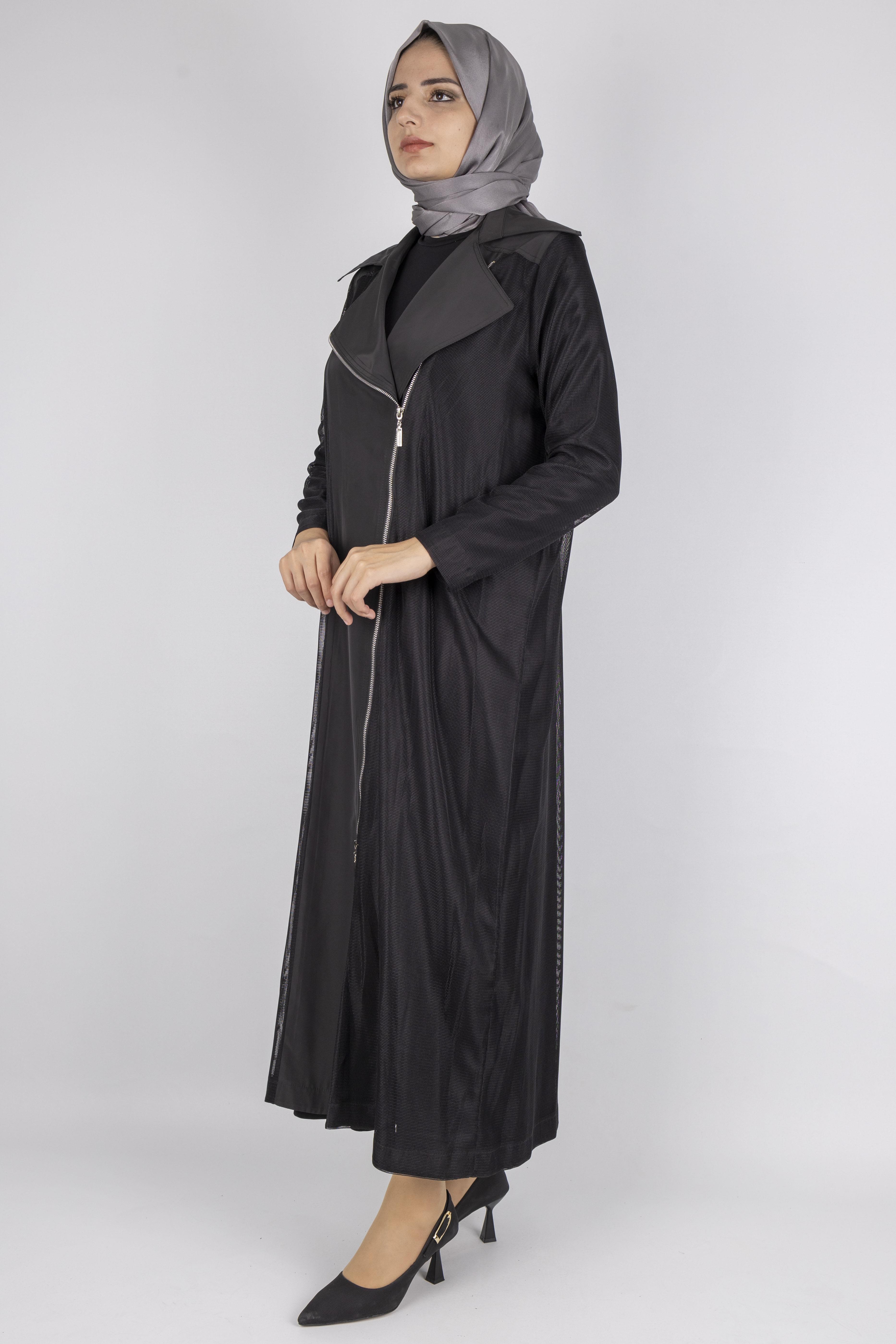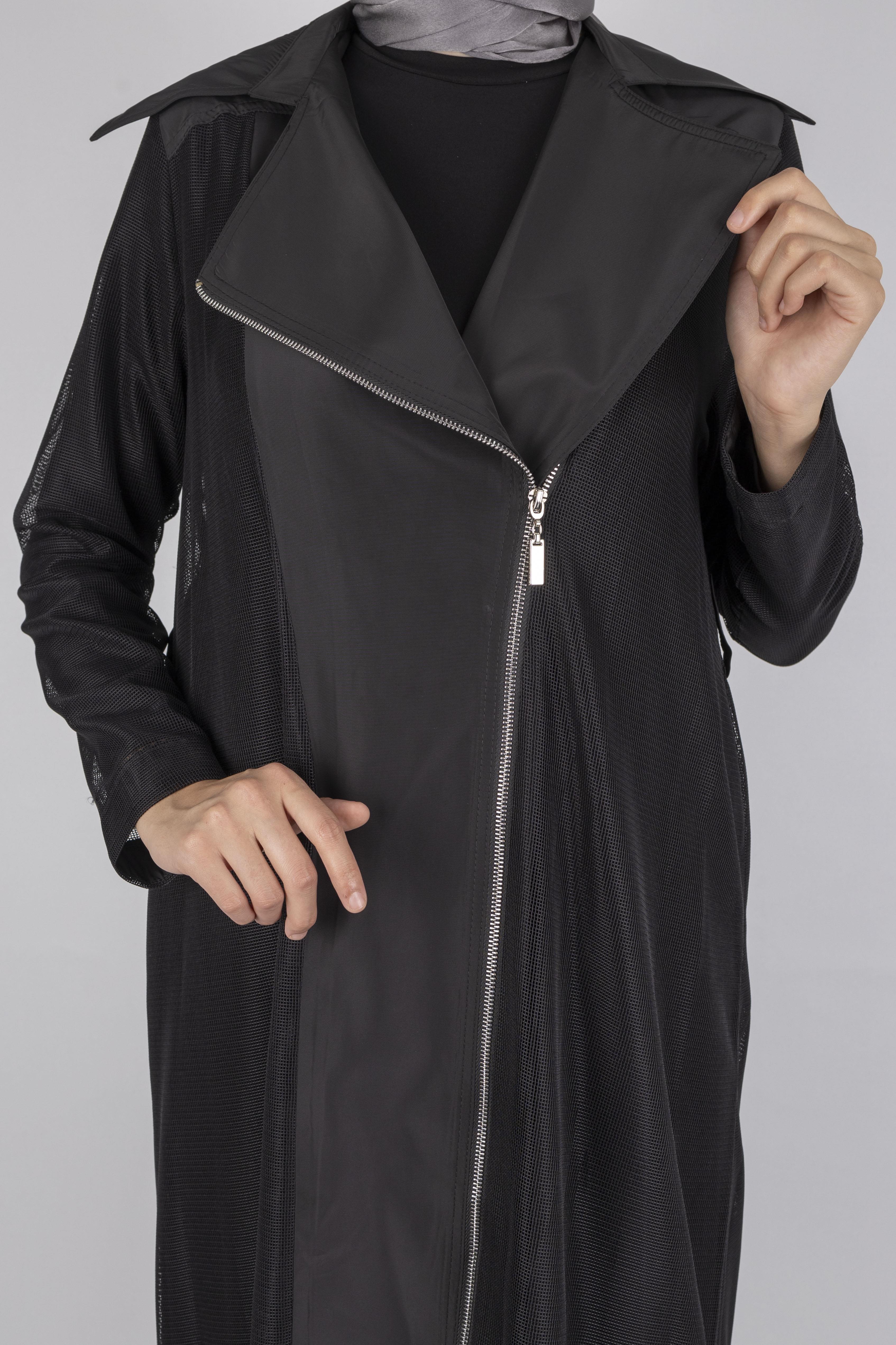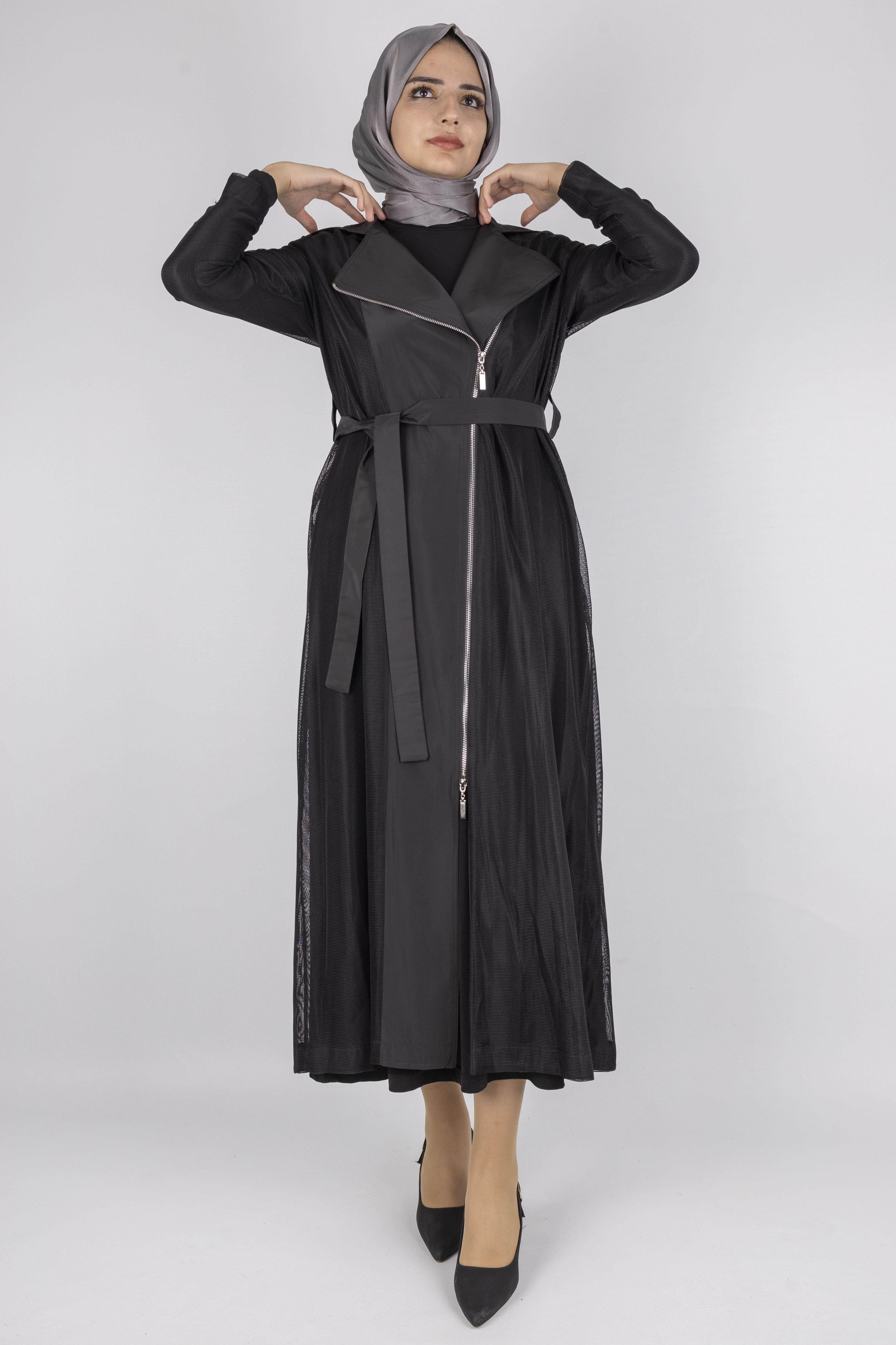 Şıklığı modern tasarımla buluşturan bu ikili takım; dışı file kumaşlı fermuarlı kap ve içte çelik örme elbiseden oluşur. İç elbise, kırışma yapmayan, akıcı formda çelik örme kumaştan üretilmiş olup gün boyu konfor sunar. Dış kap, yarı transparan file kumaşı, asimetrik fermuar detayı ve geniş yaka kesimiyle ürüne dinamizm ve şıklık katar.