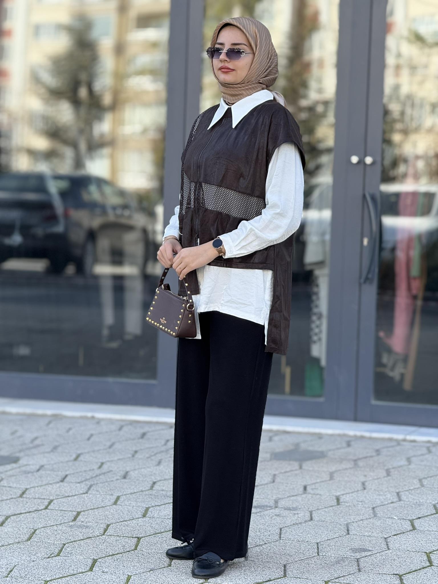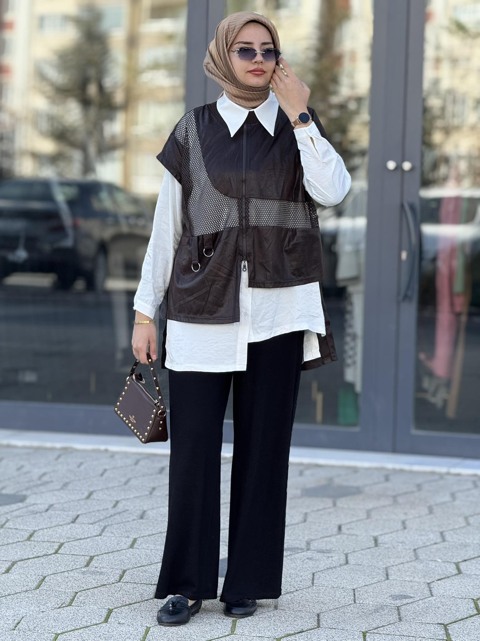 • File detaylı fermuarlı yelek + uzun gömlek kombinli ikili takım
