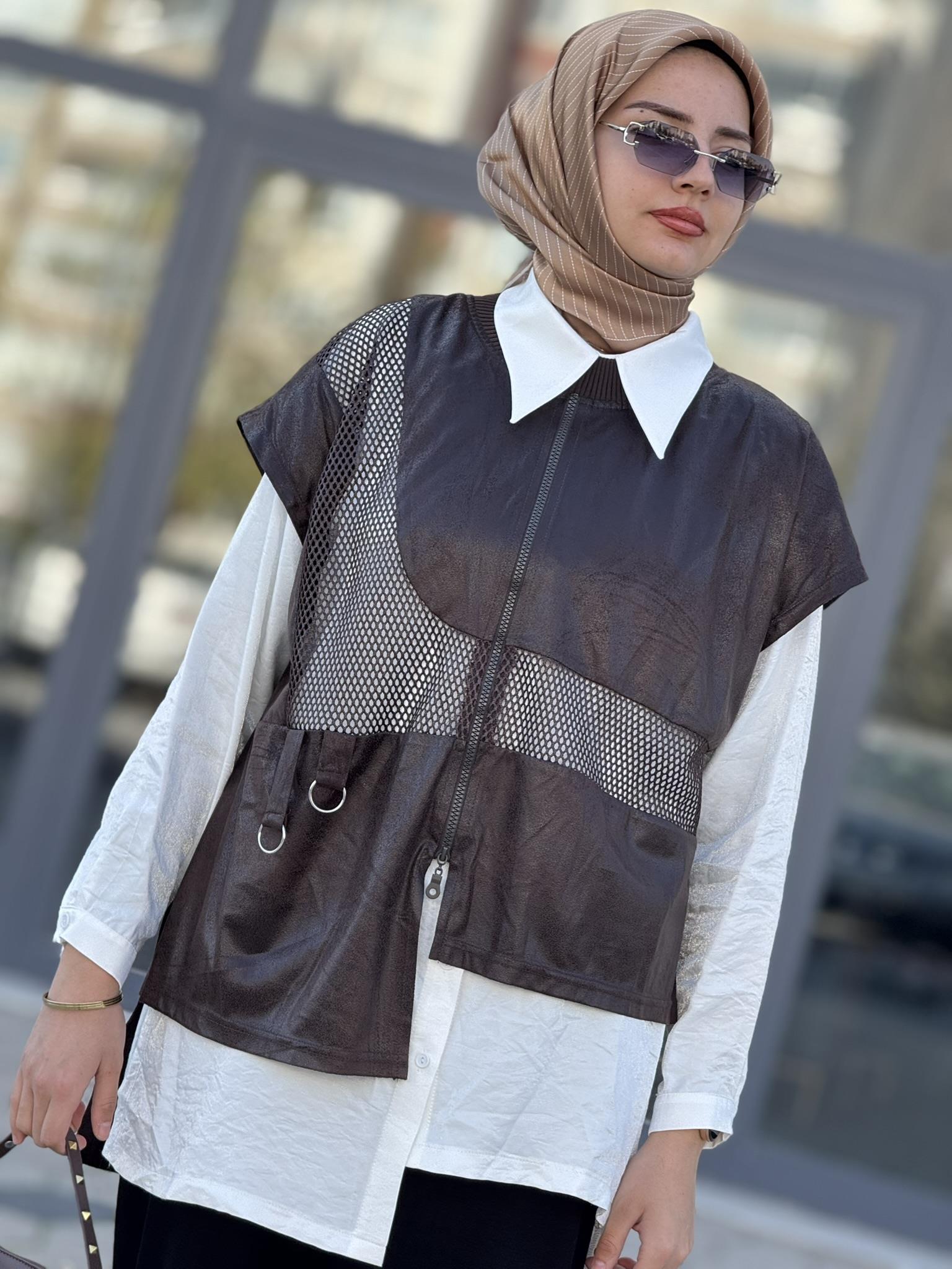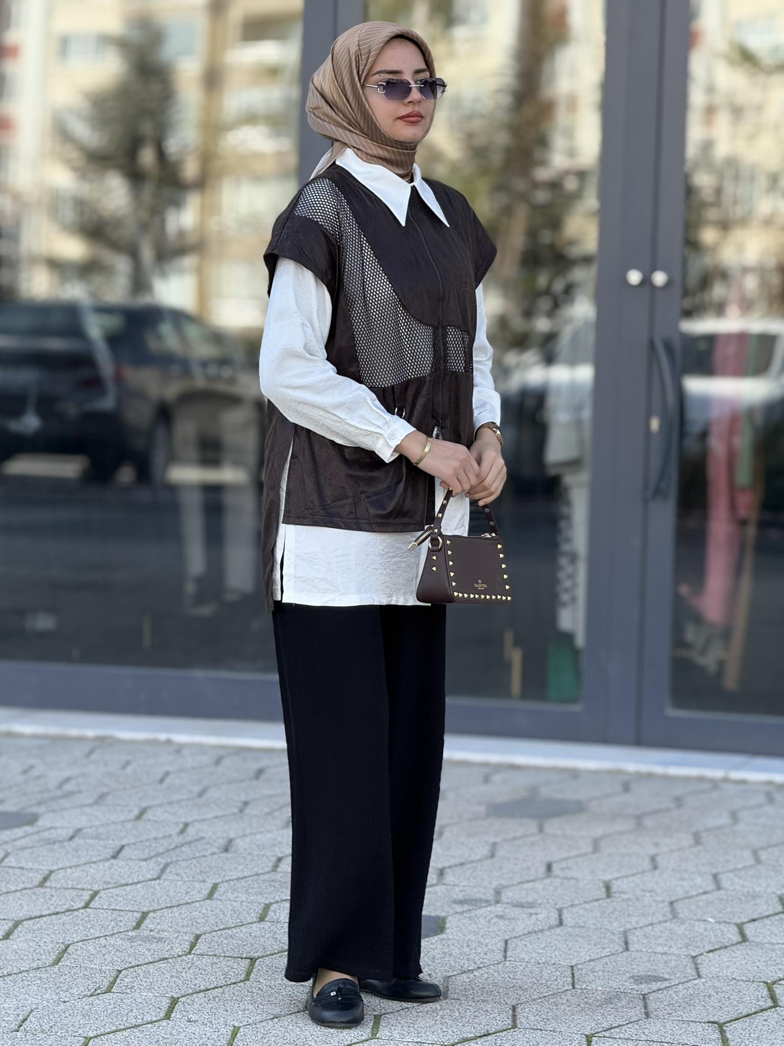 Spor şıklığı modern detaylarla birleştiren file detaylı oversize ikili takım, rahat kesimi ve özgün tasarımıyla dolabın en dikkat çekici parçalarından biri olmaya aday. İç kısmında basic gömlek, üstünde fermuarlı, file ve metal halka detaylı yelek bulunan bu takım; katmanlı görünümü sevenler için hem trend hem de konforlu bir alternatif sunar.