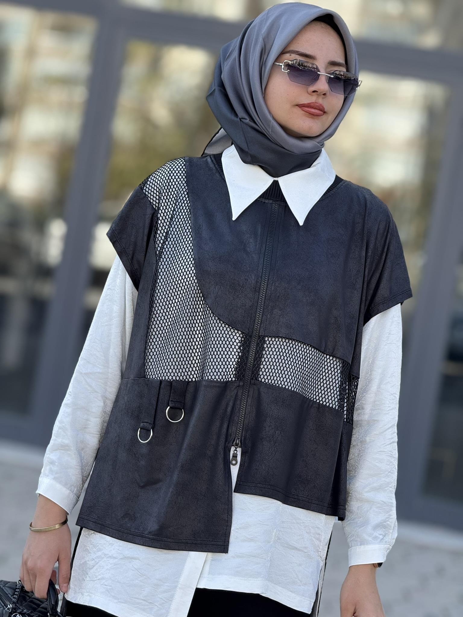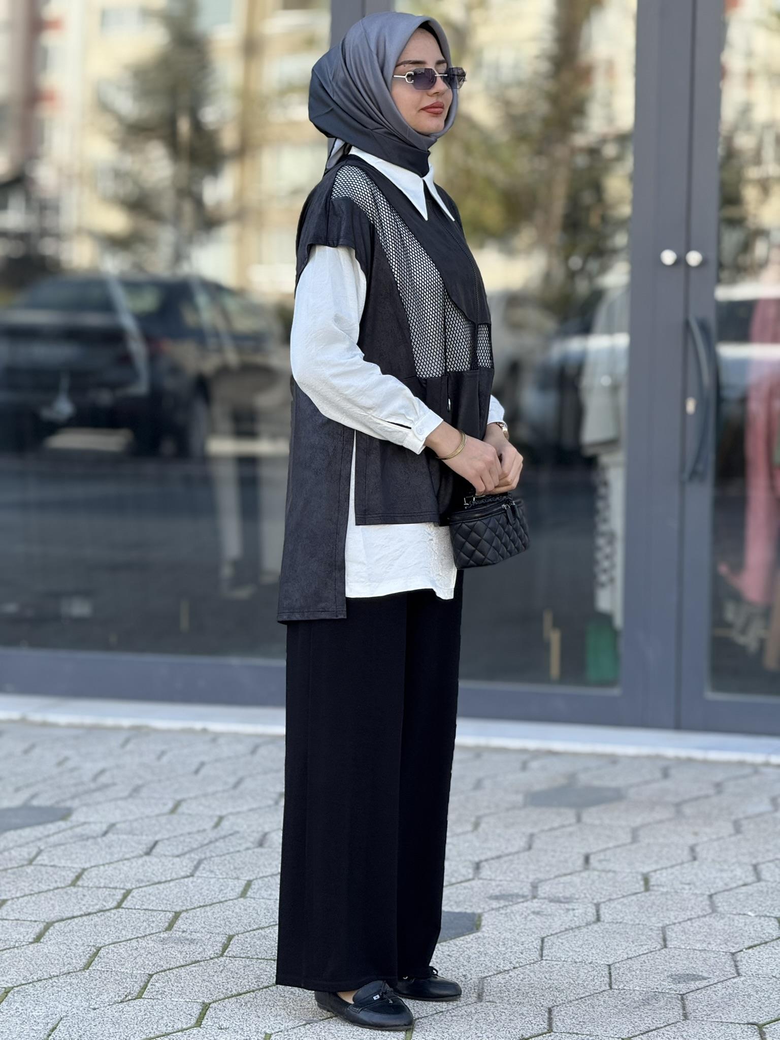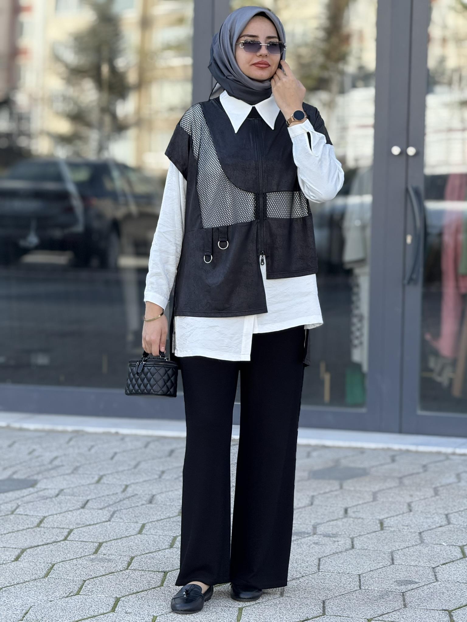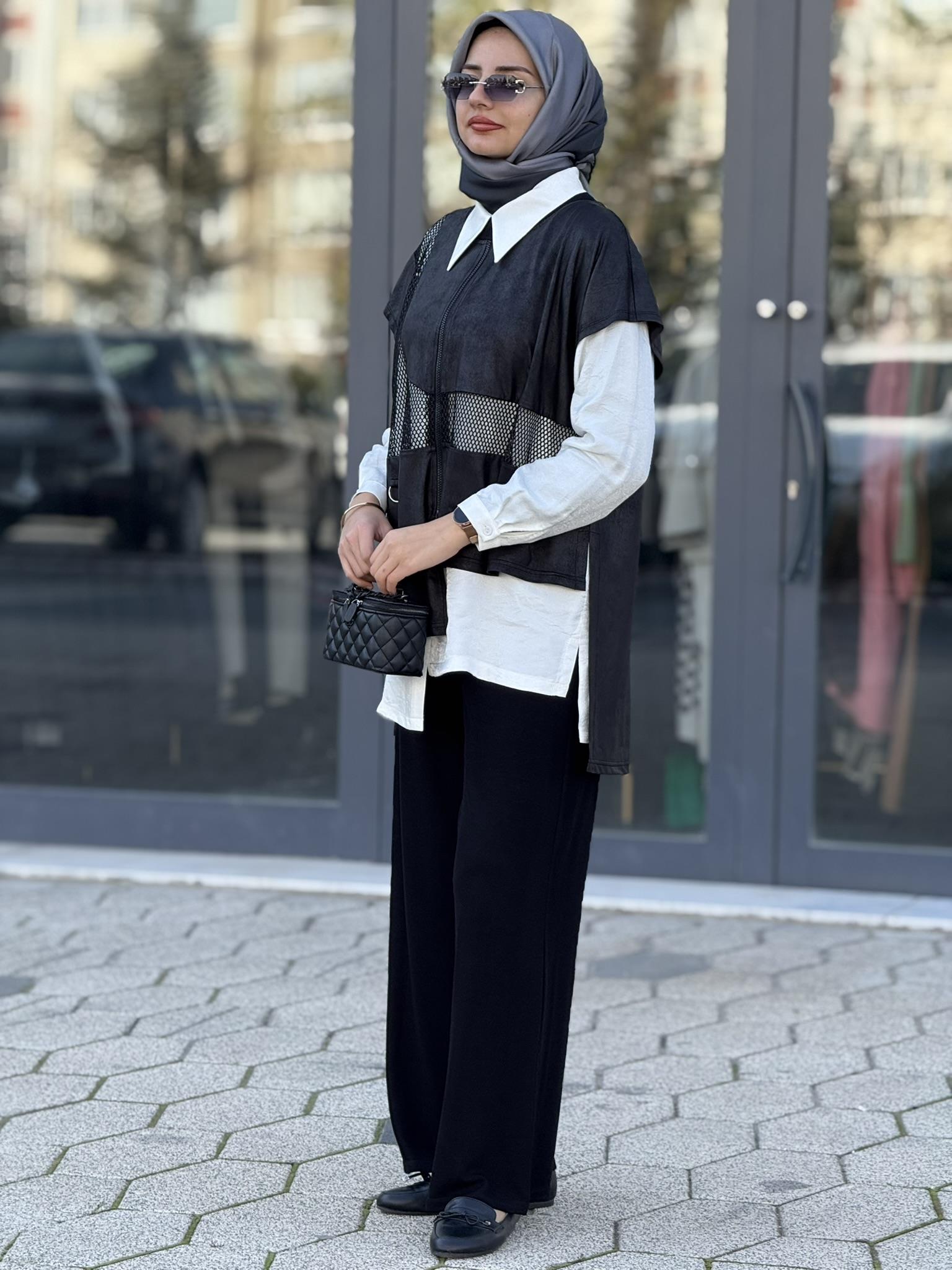 Spor şıklığı modern detaylarla birleştiren file detaylı oversize ikili takım, rahat kesimi ve özgün tasarımıyla dolabın en dikkat çekici parçalarından biri olmaya aday. İç kısmında basic gömlek, üstünde fermuarlı, file ve metal halka detaylı yelek bulunan bu takım; katmanlı görünümü sevenler için hem trend hem de konforlu bir alternatif sunar.