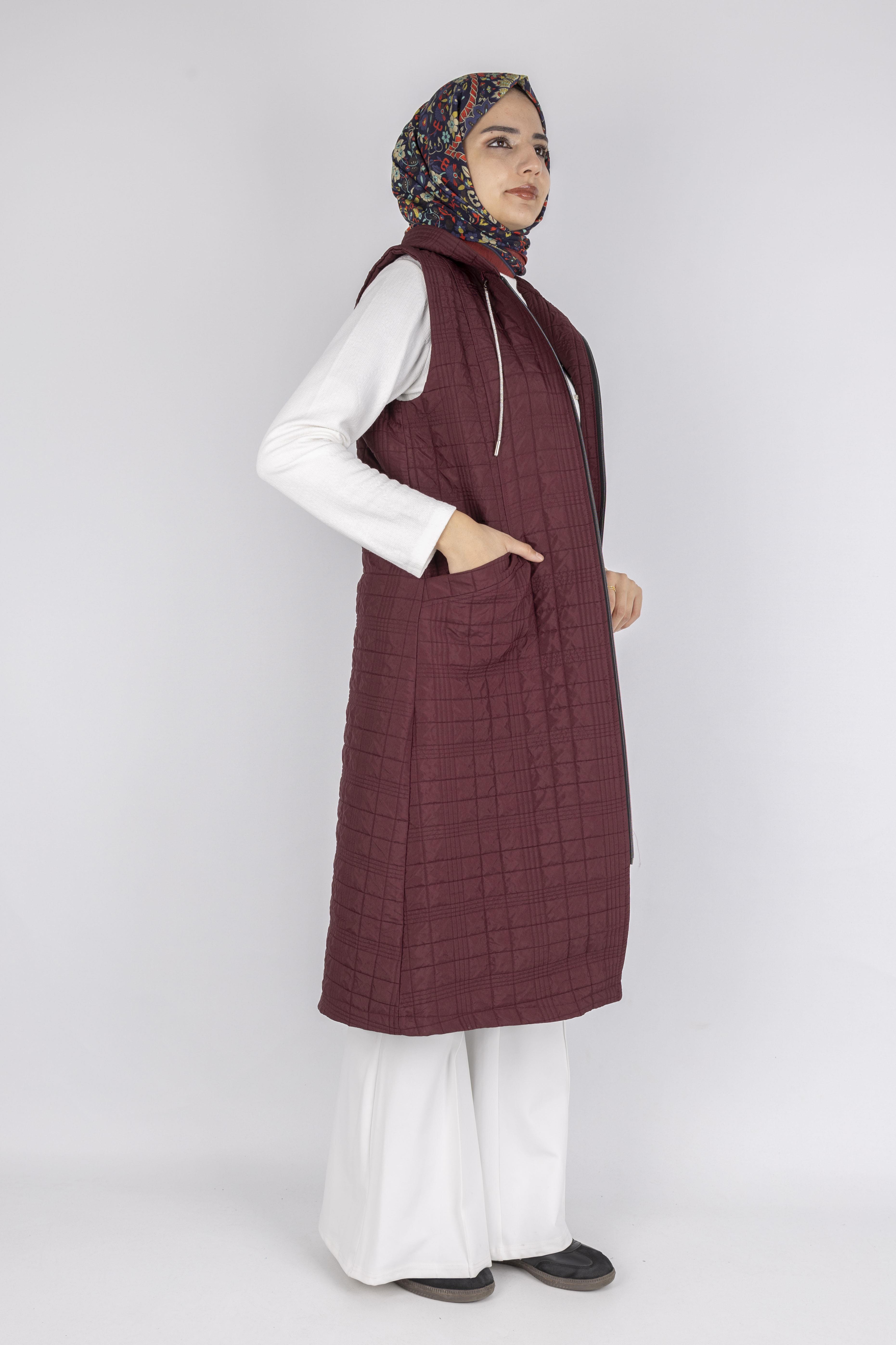 Ayarlanabilir İpli Kapüşonlu Dik Yaka Kapitone Yelek Bordo OTW4029