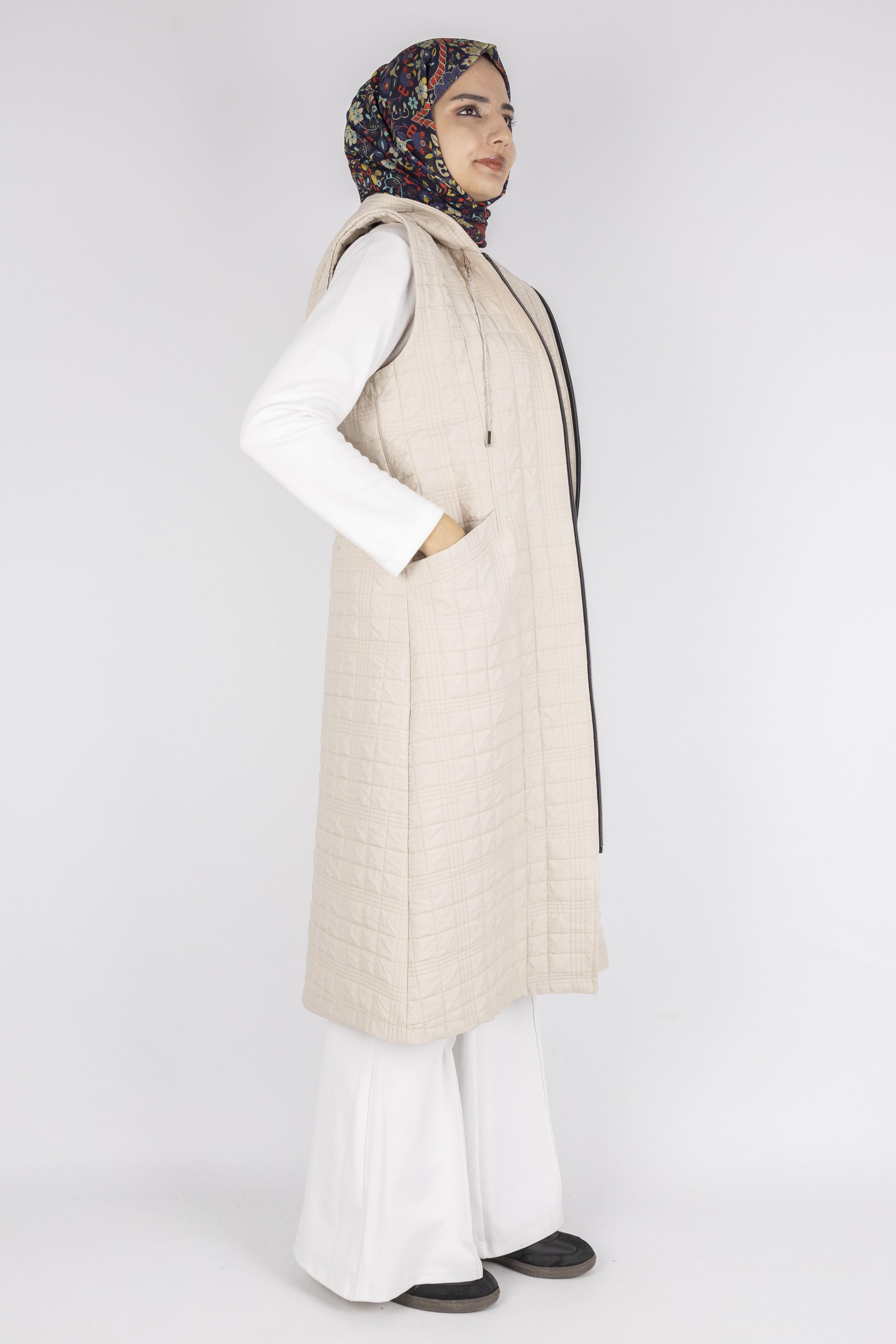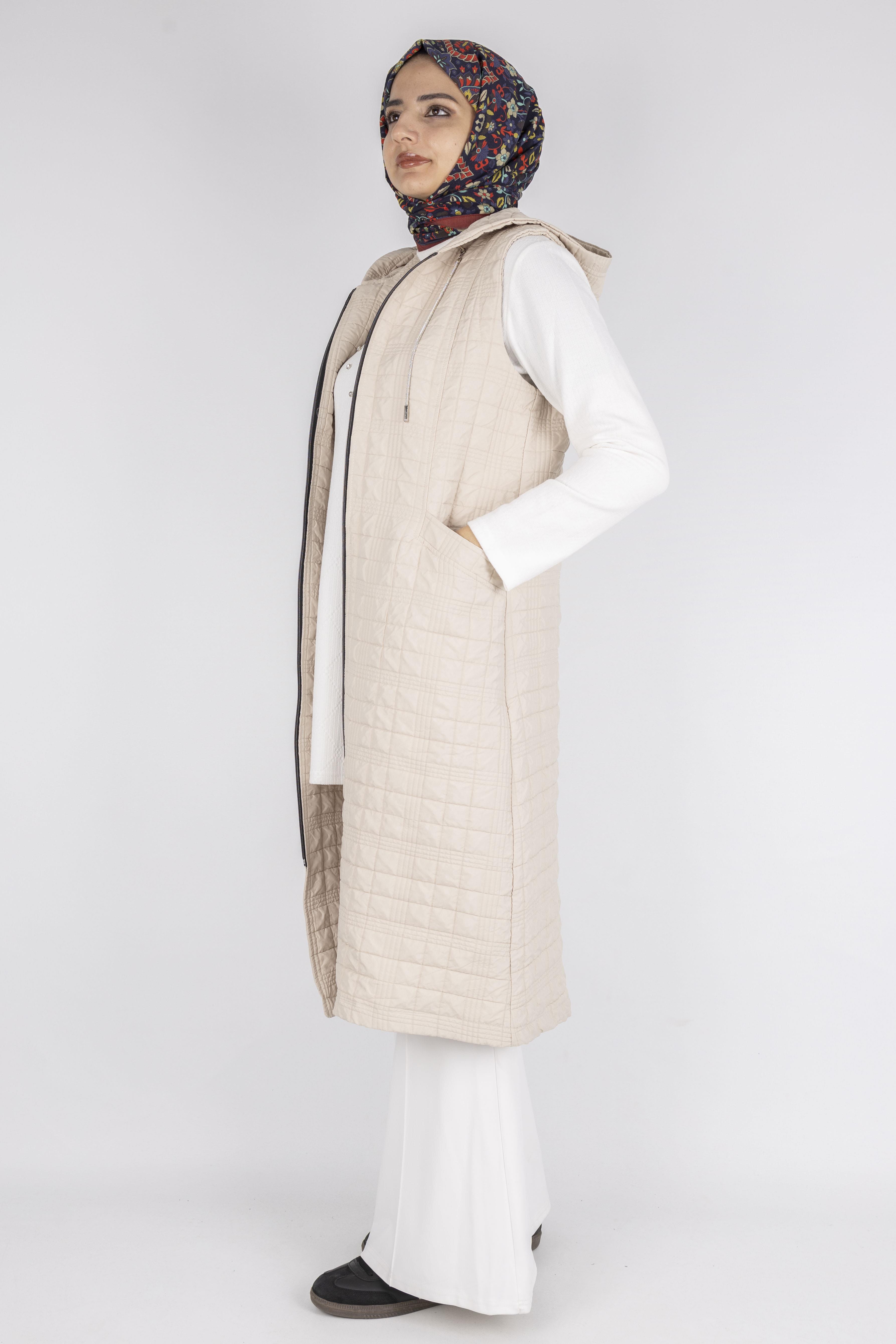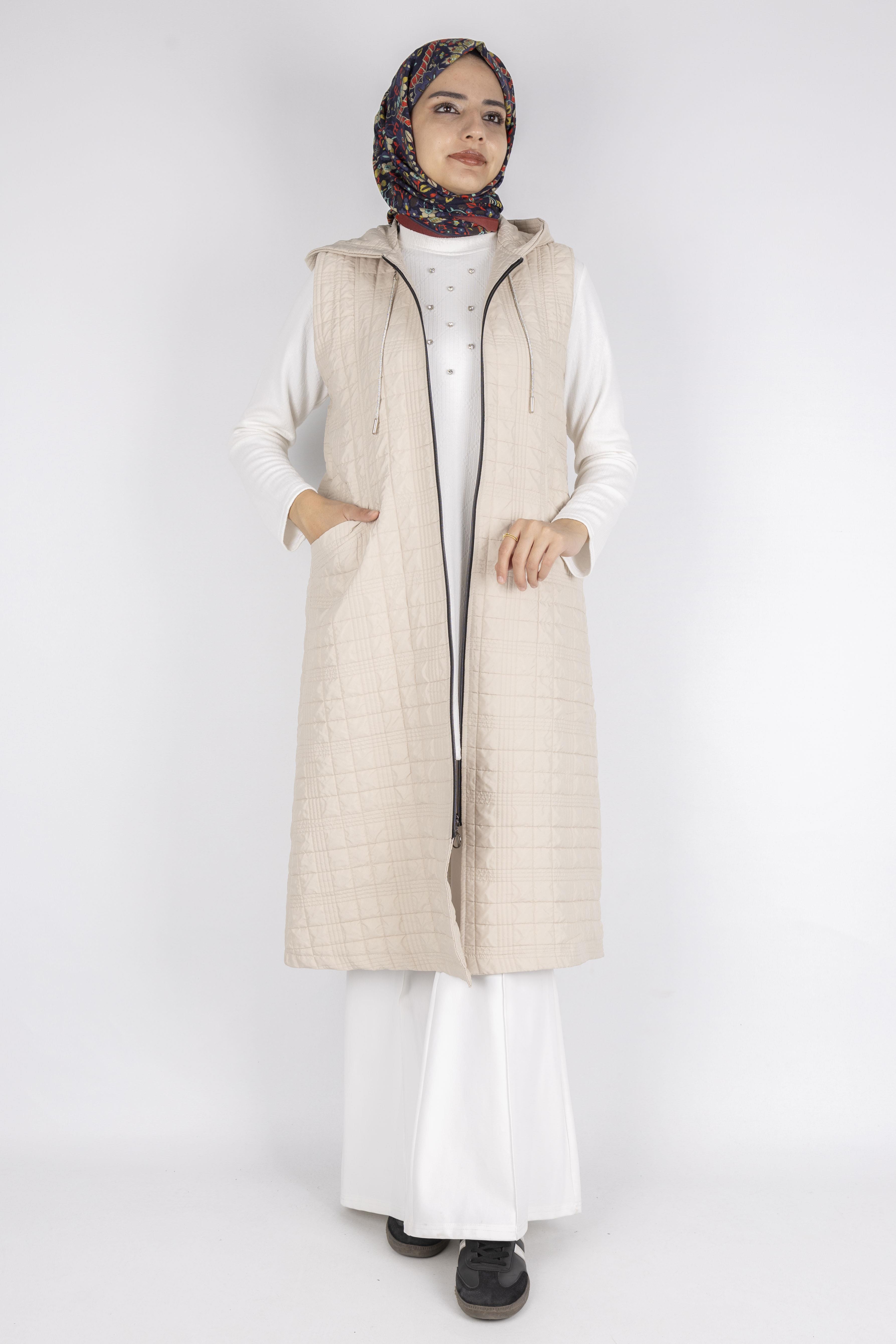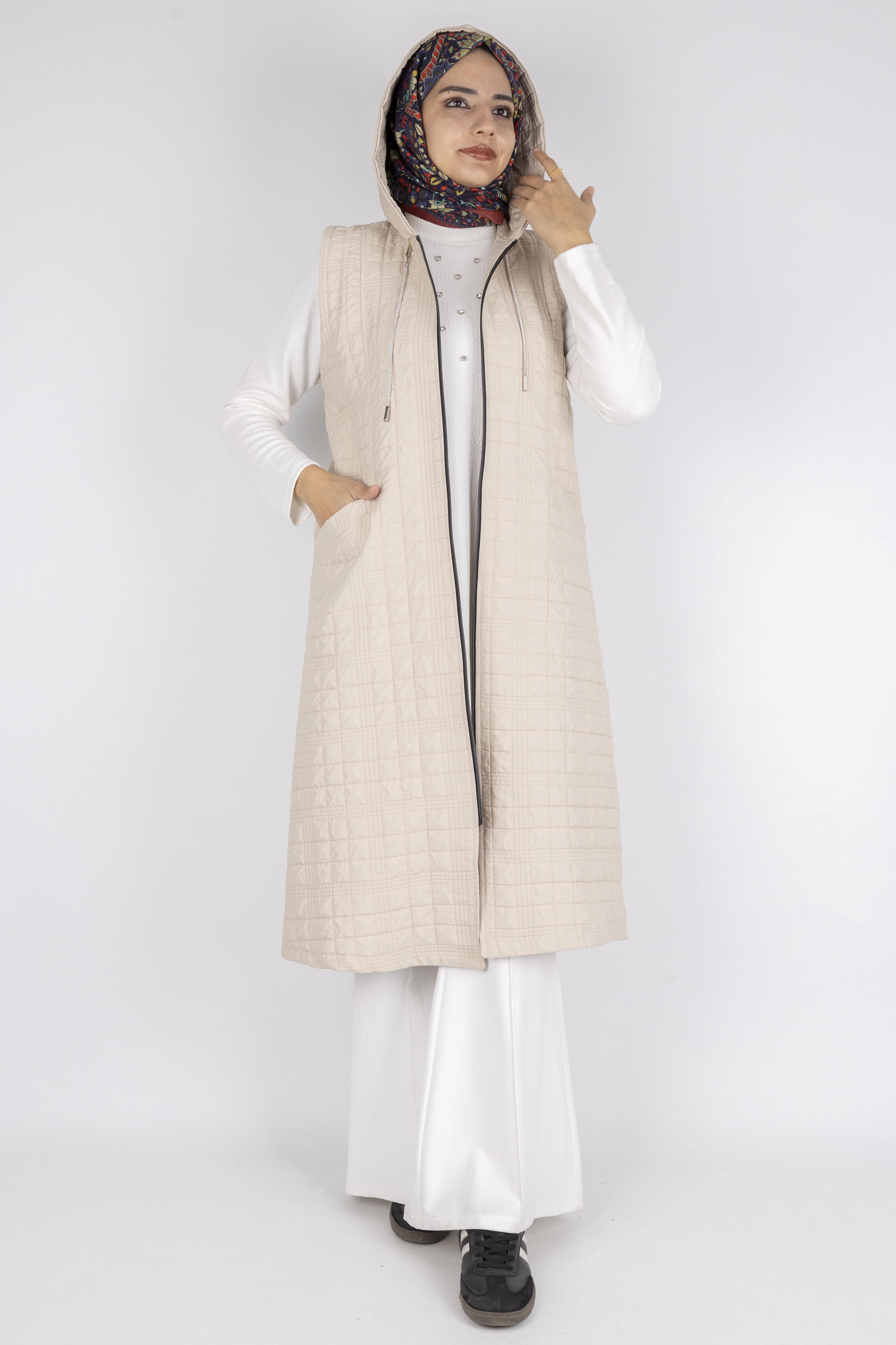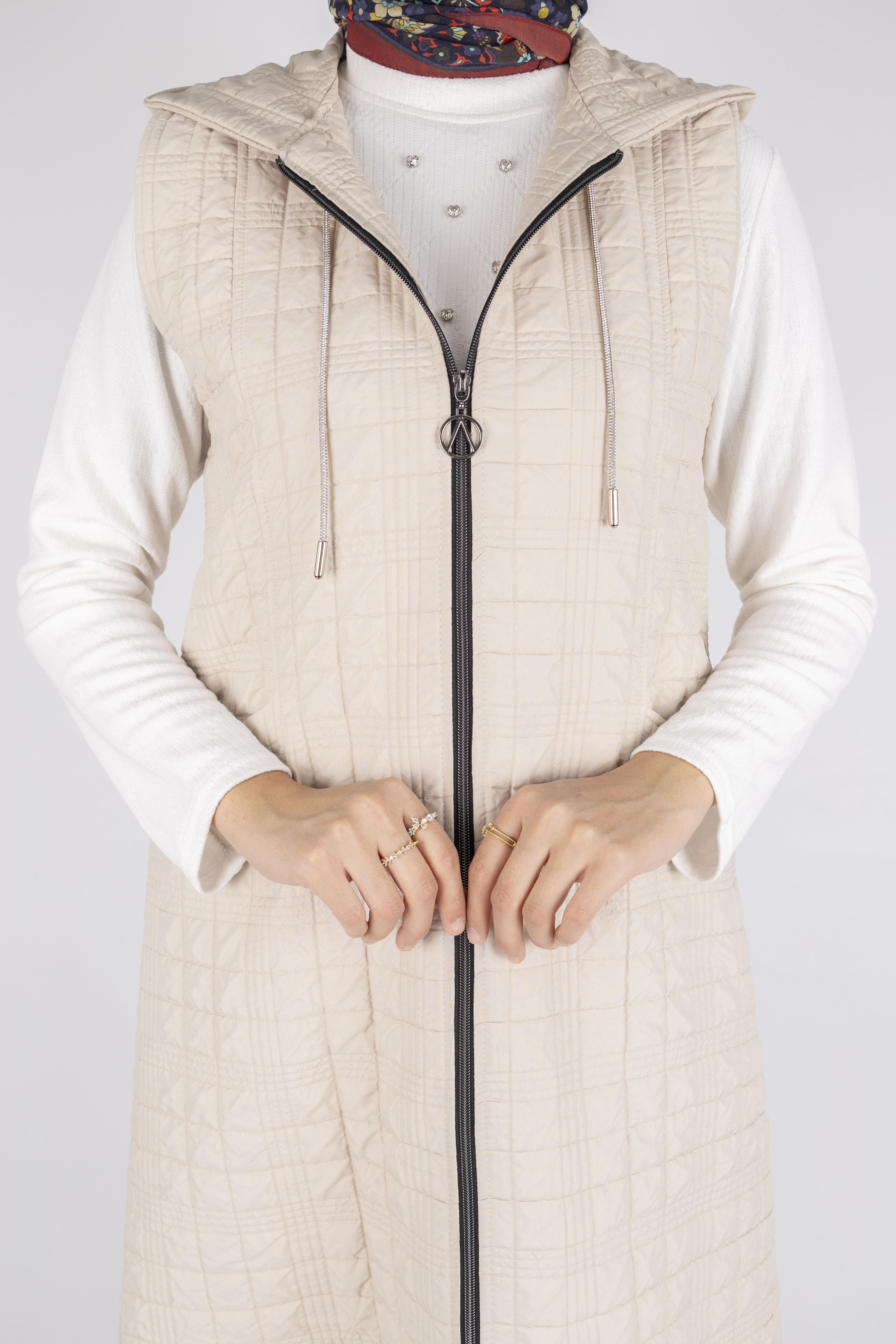 Ayarlanabilir İpli Kapüşonlu Dik Yaka Kapitone Yelek Taş OTW4029