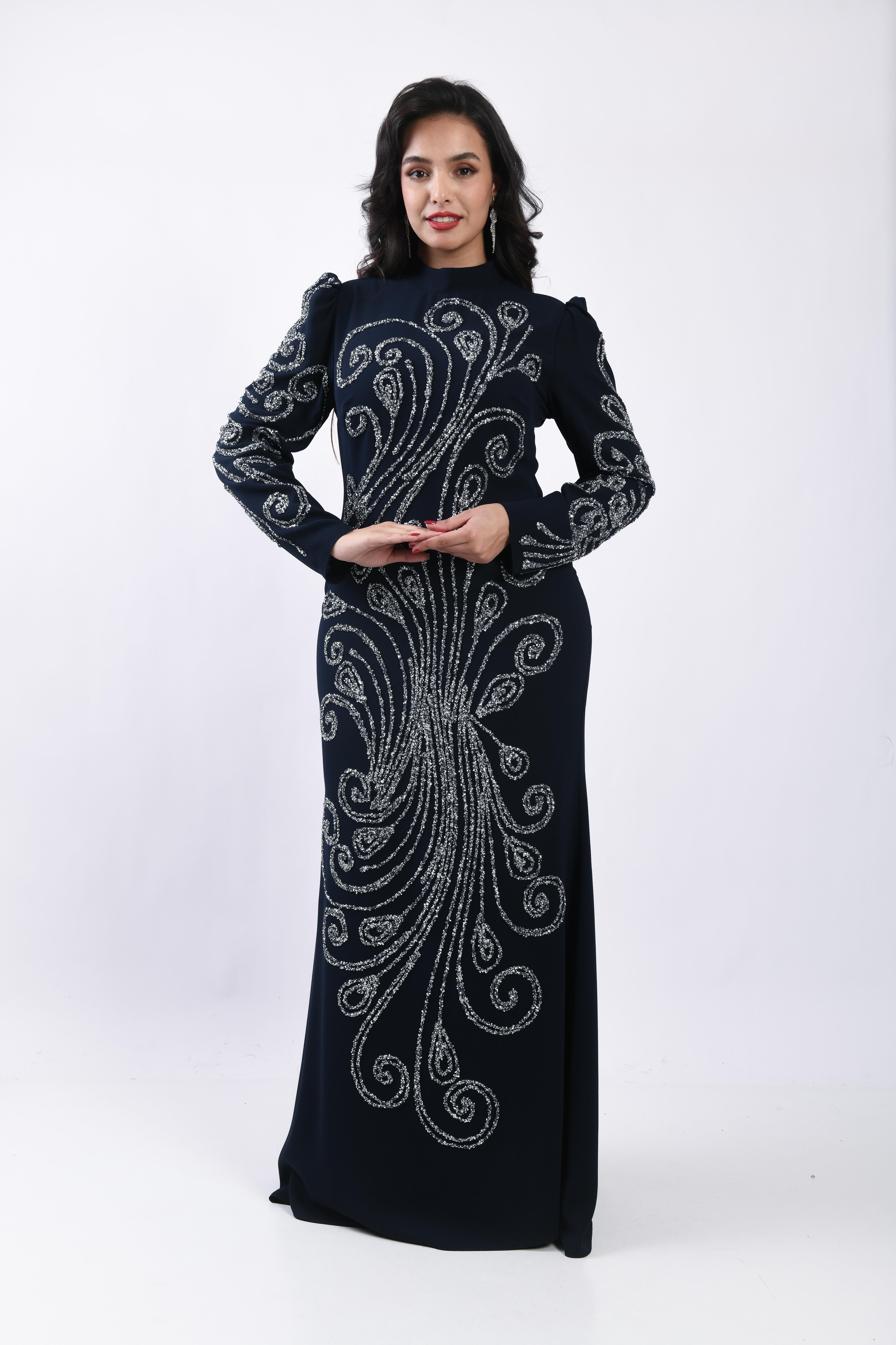 Zarif gümüş işlemeleriyle göz alıcı bir şıklık sunan bu krep kumaş uzun abiye elbise, özel davetlerde asil ve güçlü bir duruş sergiler. Akıcı krep kumaşı sayesinde vücuda zarifçe oturur, işlemeli desenleriyle şıklığı ön plana çıkarır. Düğün, nişan ve tüm özel günlerde tercih edilebilecek zamansız bir abiye modelidir.