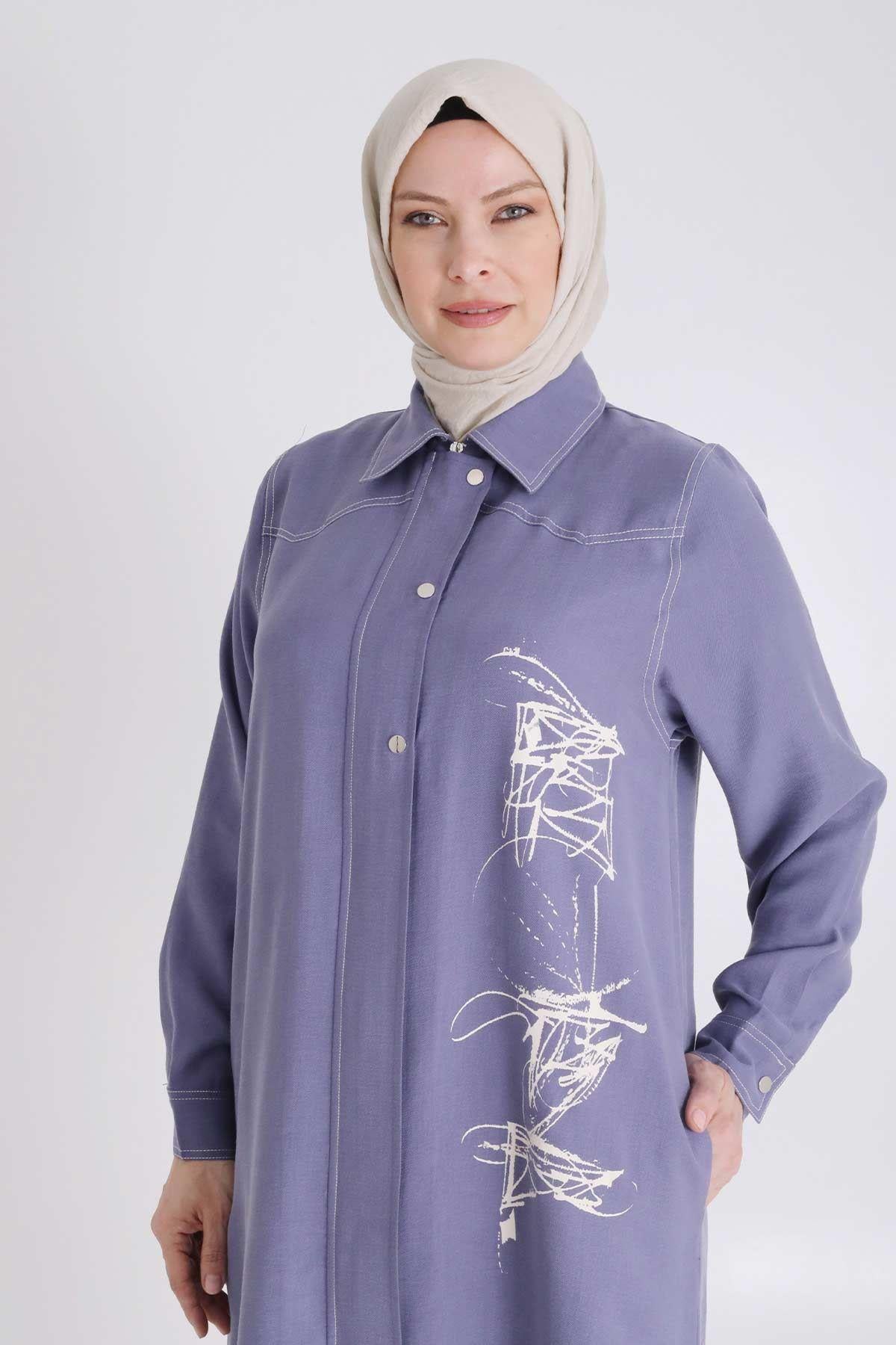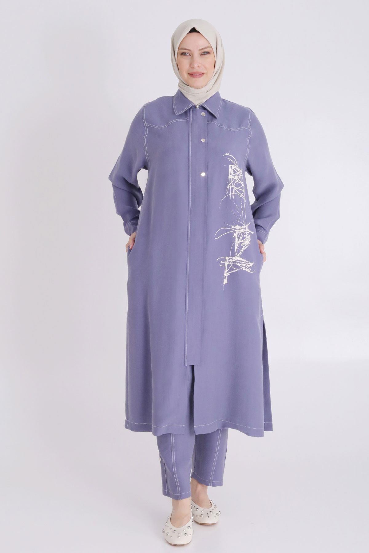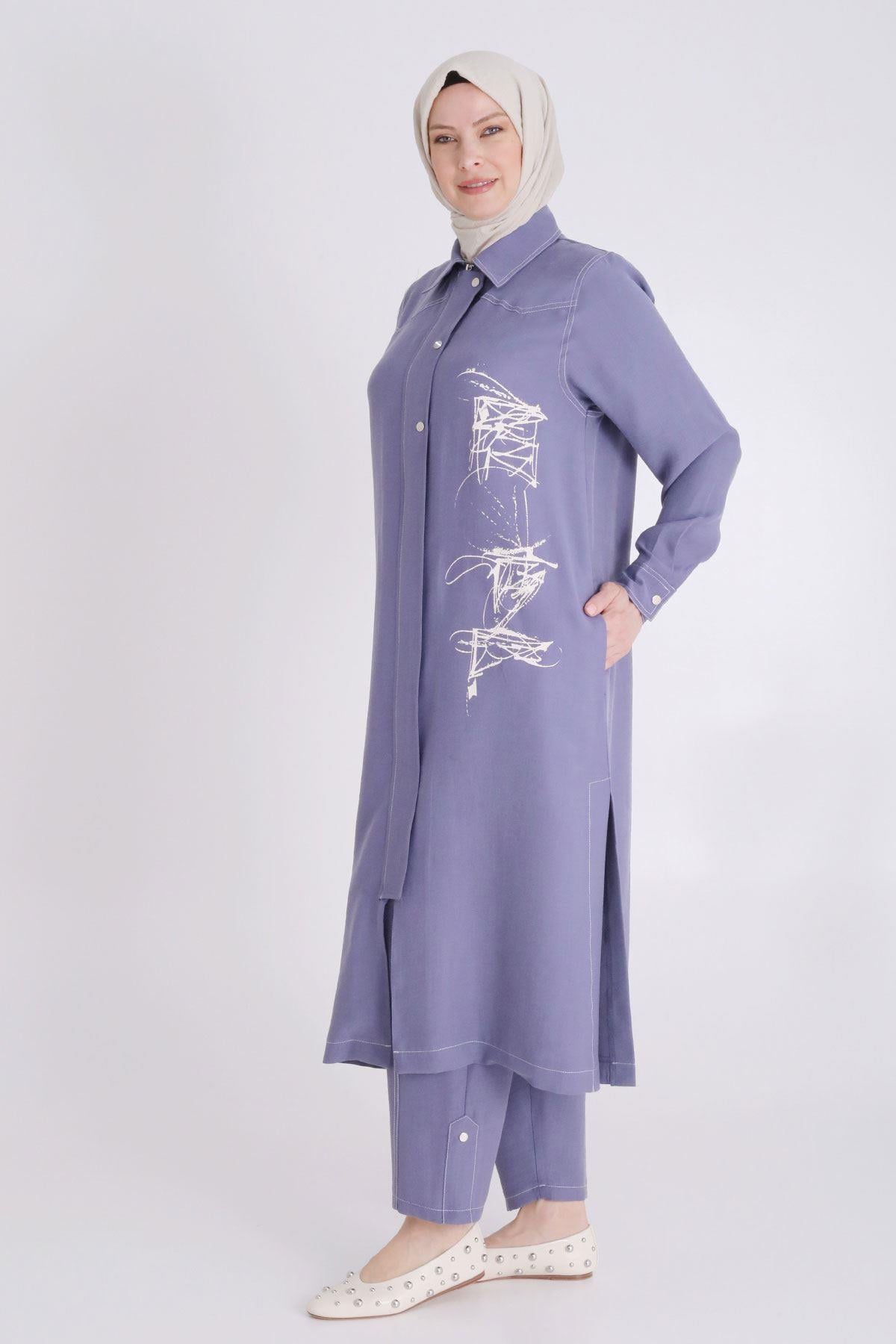 Behrem Büyük Beden Baskılı Pantolonlu Takım İndigo OTW35130
