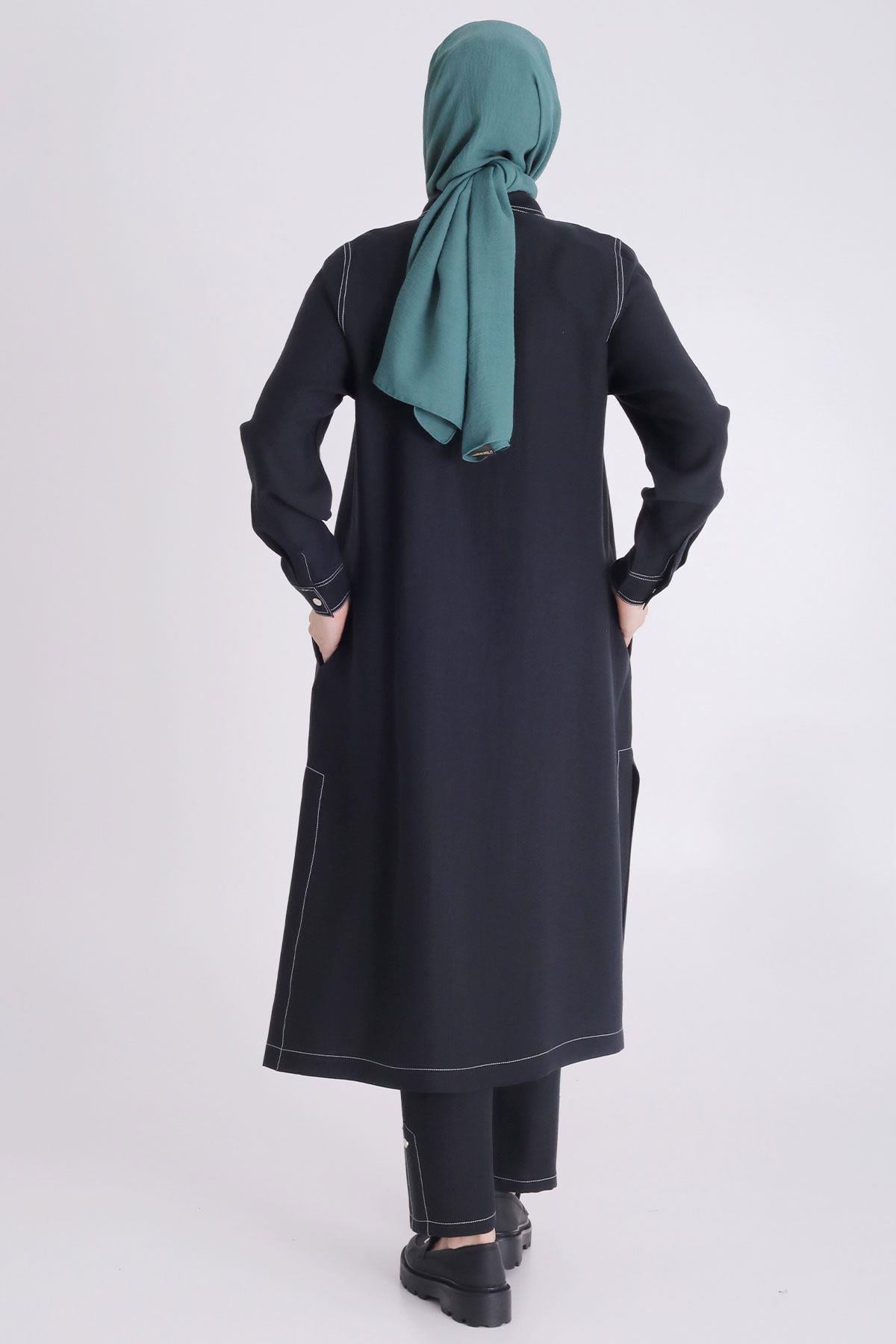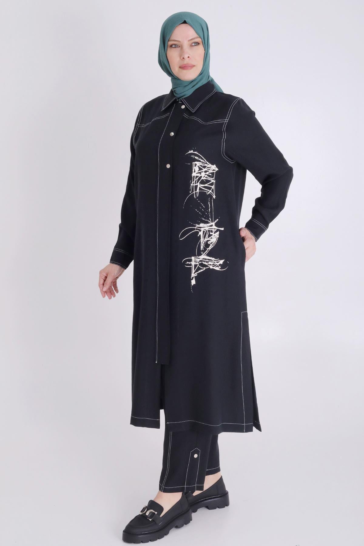 Ürün Detayları: Önden gizli pat fermuarlı modelimiz kolları manşetli, önü baskı detaylıdır. Pantolon beli lastkili, iki yandan cepli ve paçası süs çıtçıtlıdır.