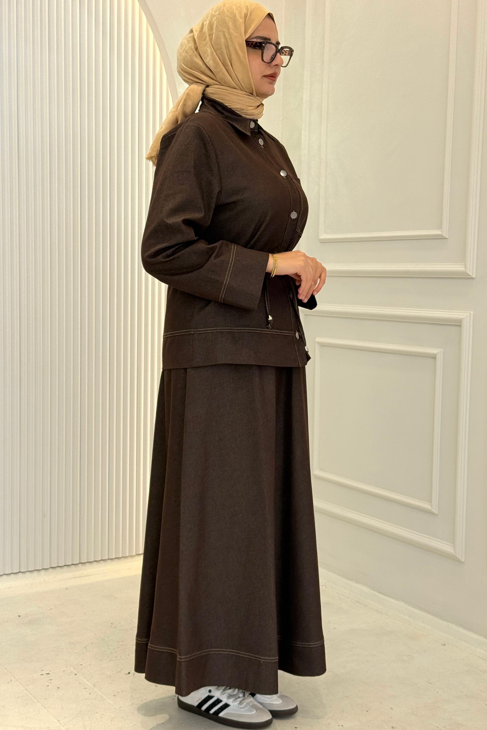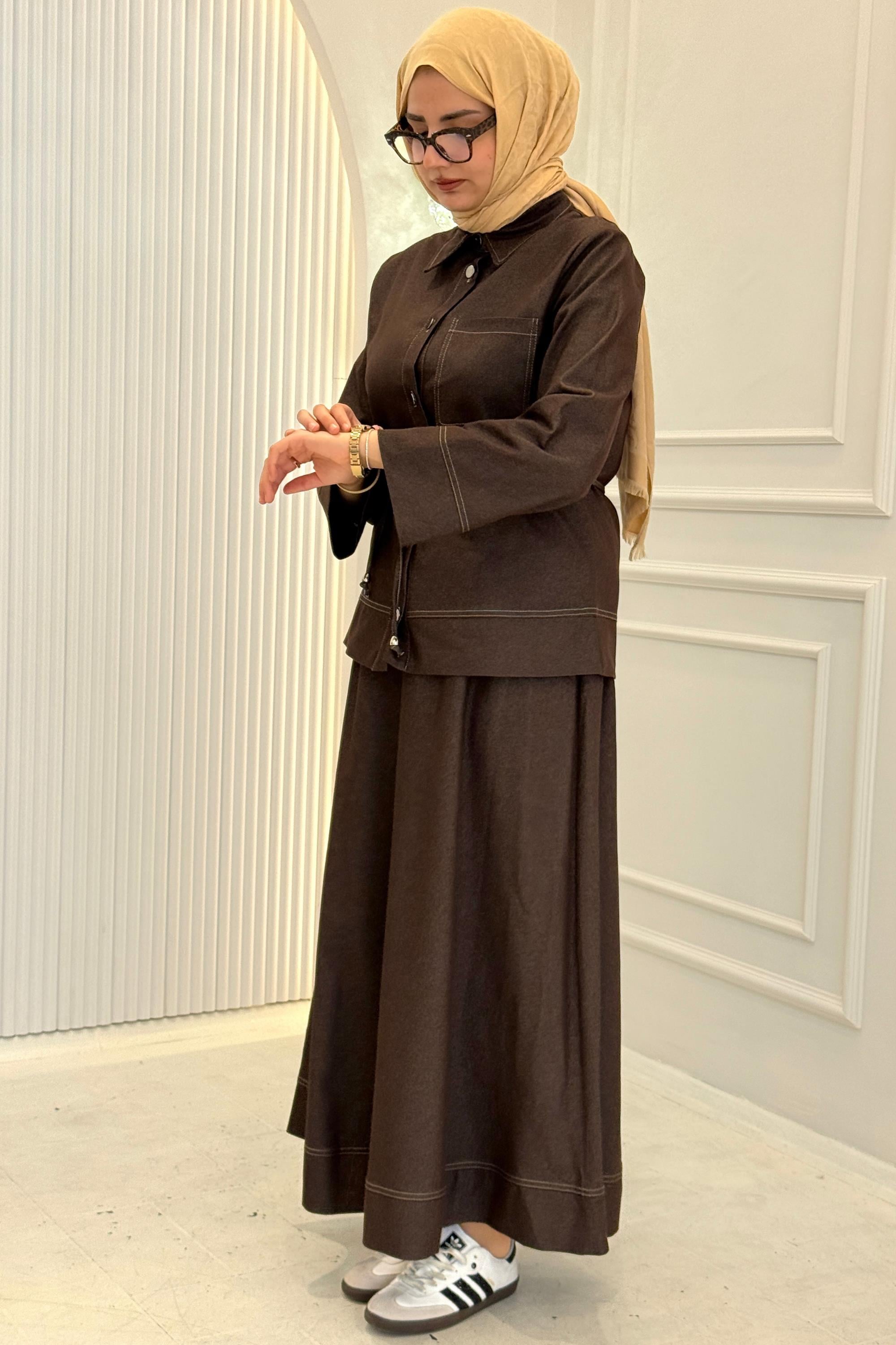 Modern kontrast dikiş detaylarıyla öne çıkan kot kumaş etekli takım, hem spor hem şık kombinler için ideal bir seçenektir. Rahat kalıbı ve lastikli bel yapısı sayesinde gün boyu konfor sunar. A kesim eteği ile vücuda yapışmadan zarif bir duruş sağlar. Günlük kullanımda stil sahibi görünmek isteyenler için vazgeçilmez bir parça ✨
