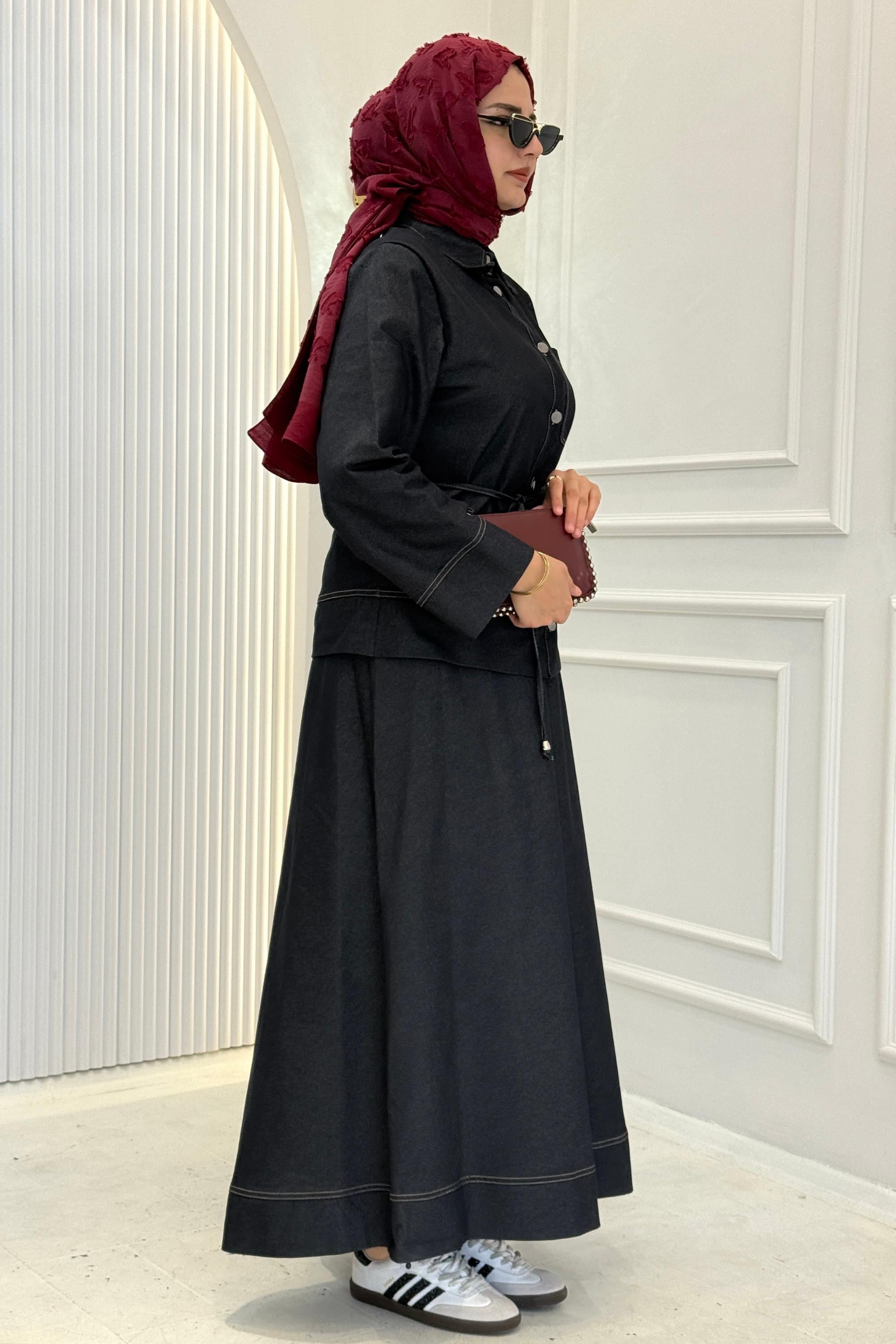 Modern kontrast dikiş detaylarıyla öne çıkan kot kumaş etekli takım, hem spor hem şık kombinler için ideal bir seçenektir. Rahat kalıbı ve lastikli bel yapısı sayesinde gün boyu konfor sunar. A kesim eteği ile vücuda yapışmadan zarif bir duruş sağlar. Günlük kullanımda stil sahibi görünmek isteyenler için vazgeçilmez bir parça