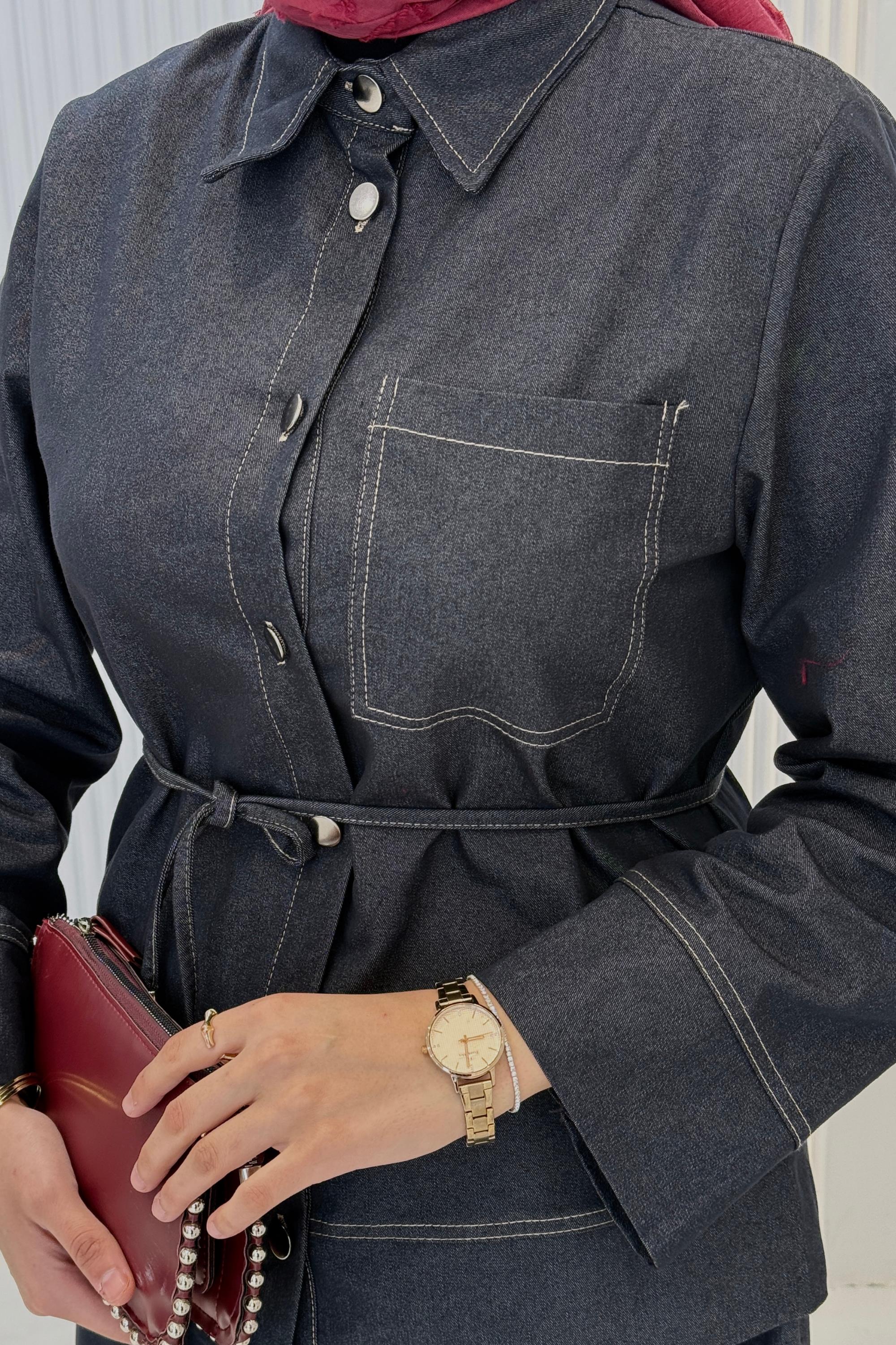 • Detay: Kontrast dikişli, düğmeli, belden bağlamalı