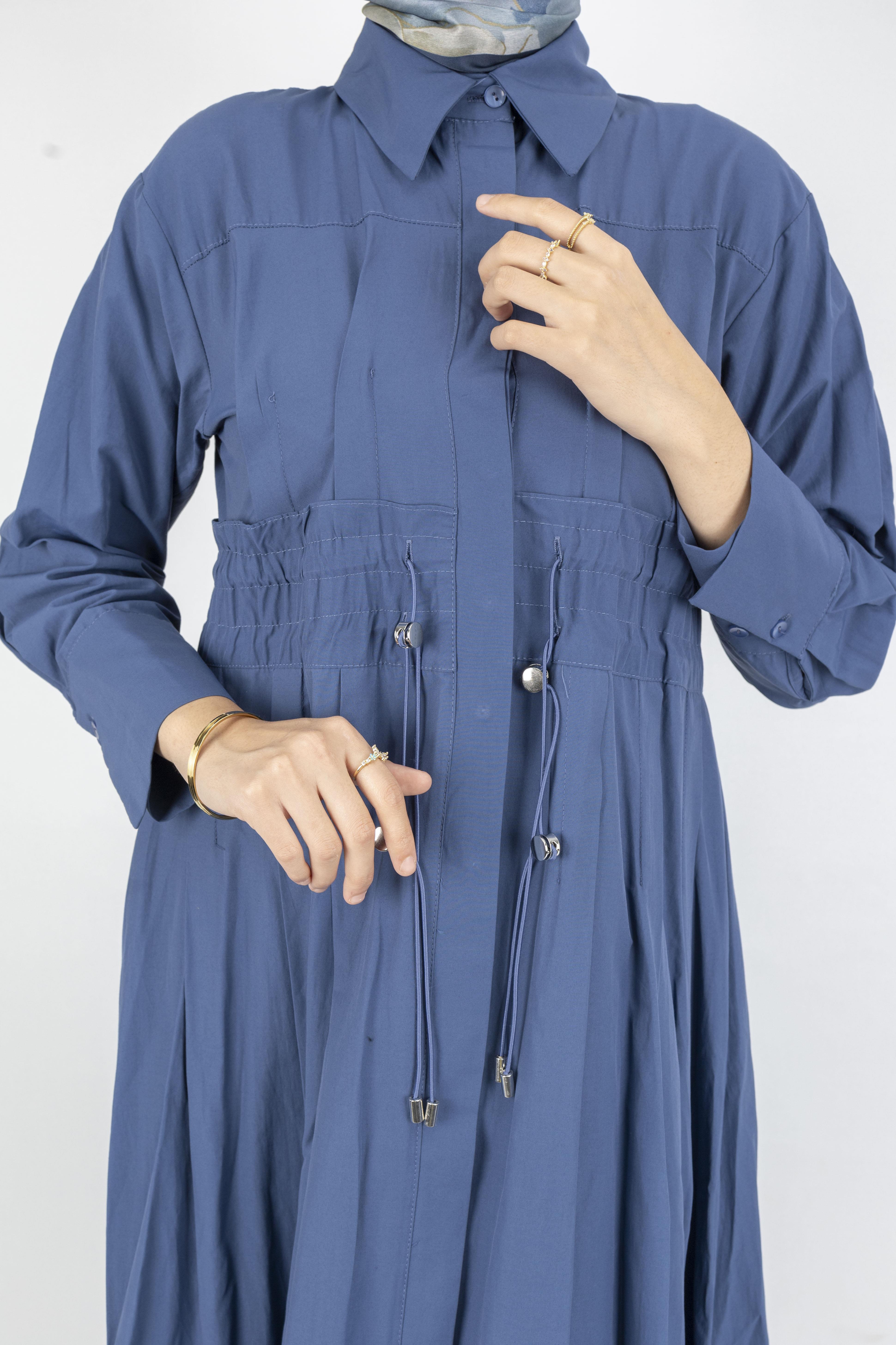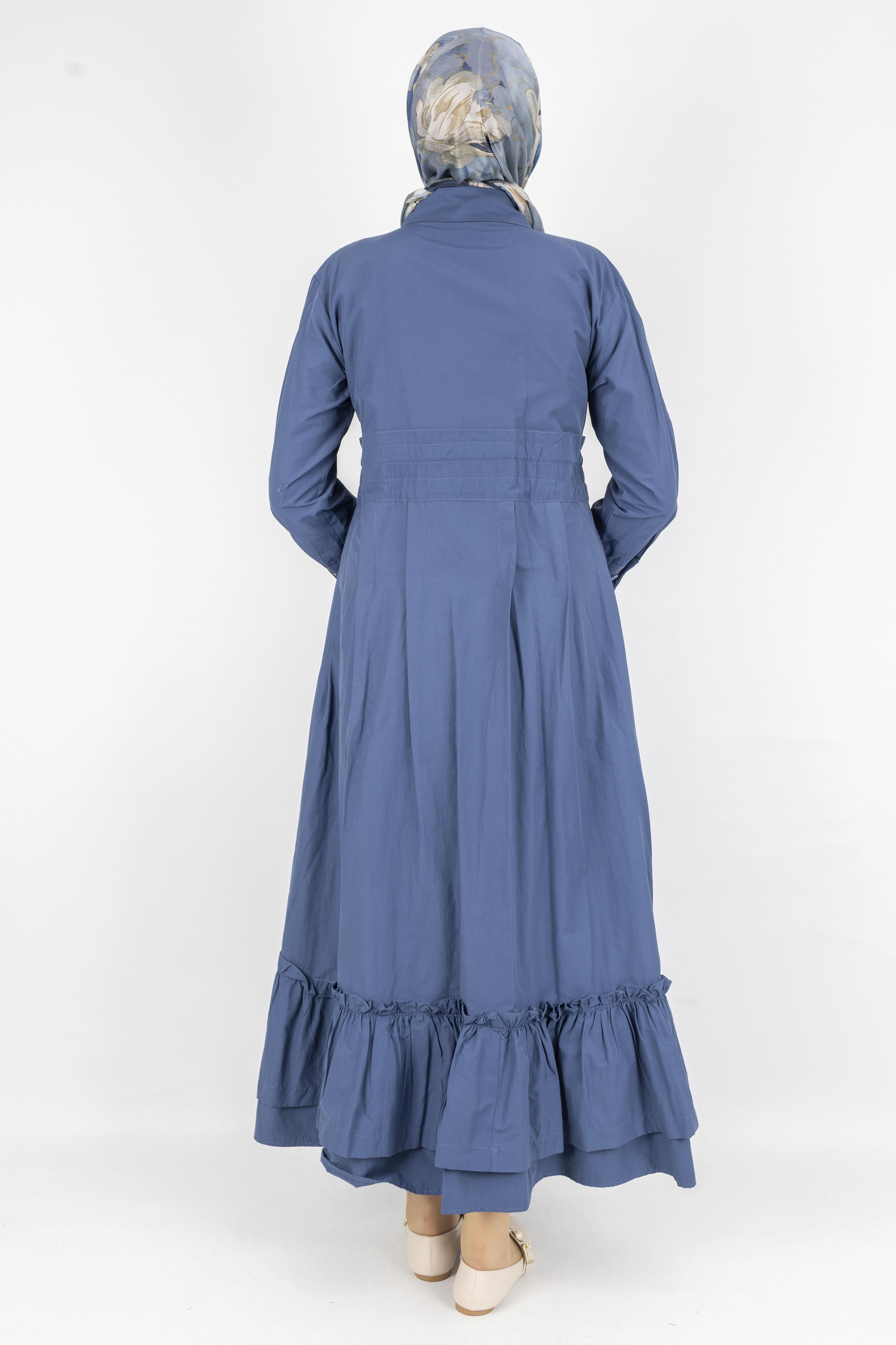 Beli Lastikli Katlı Tesettür Elbise Mavi OTW046