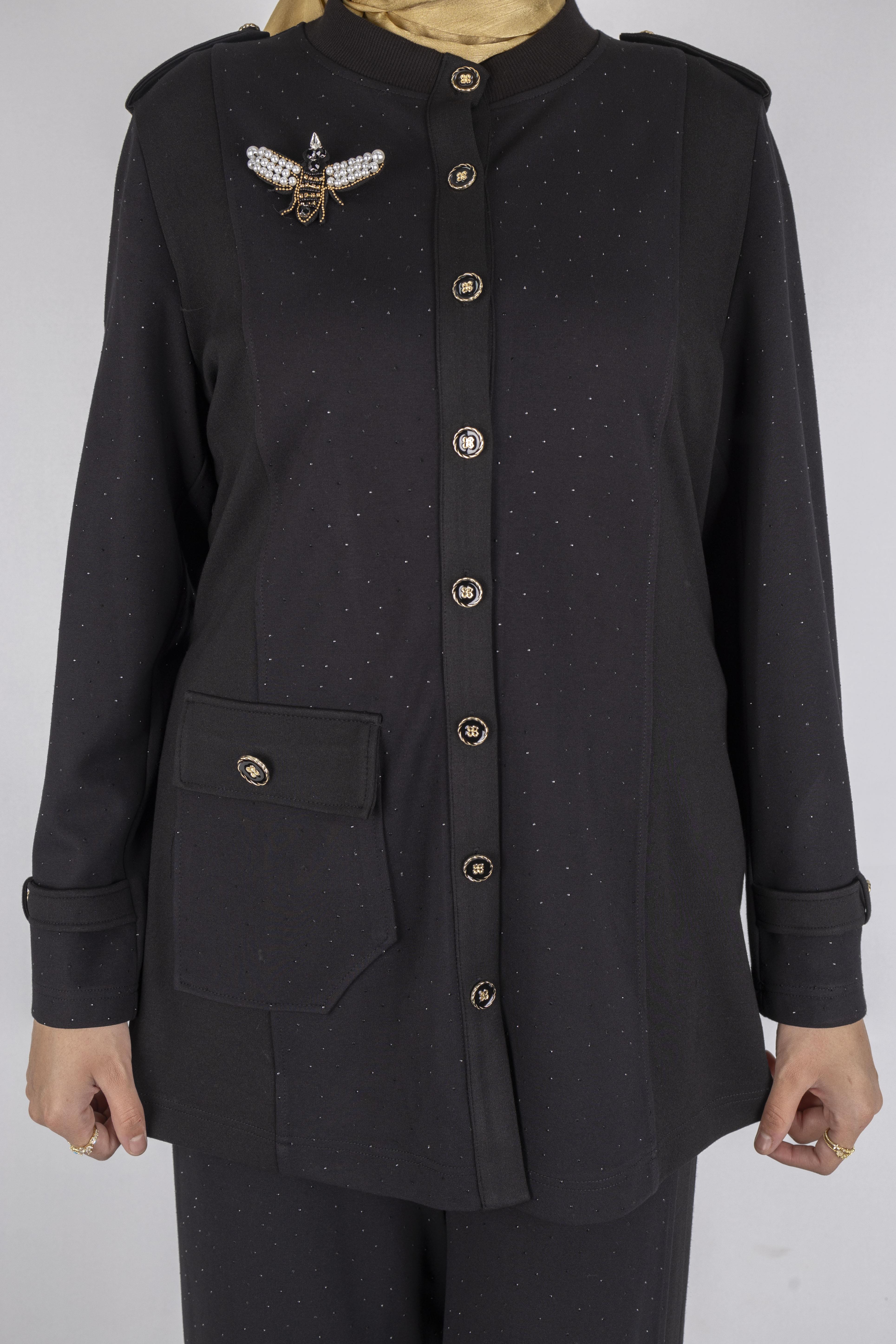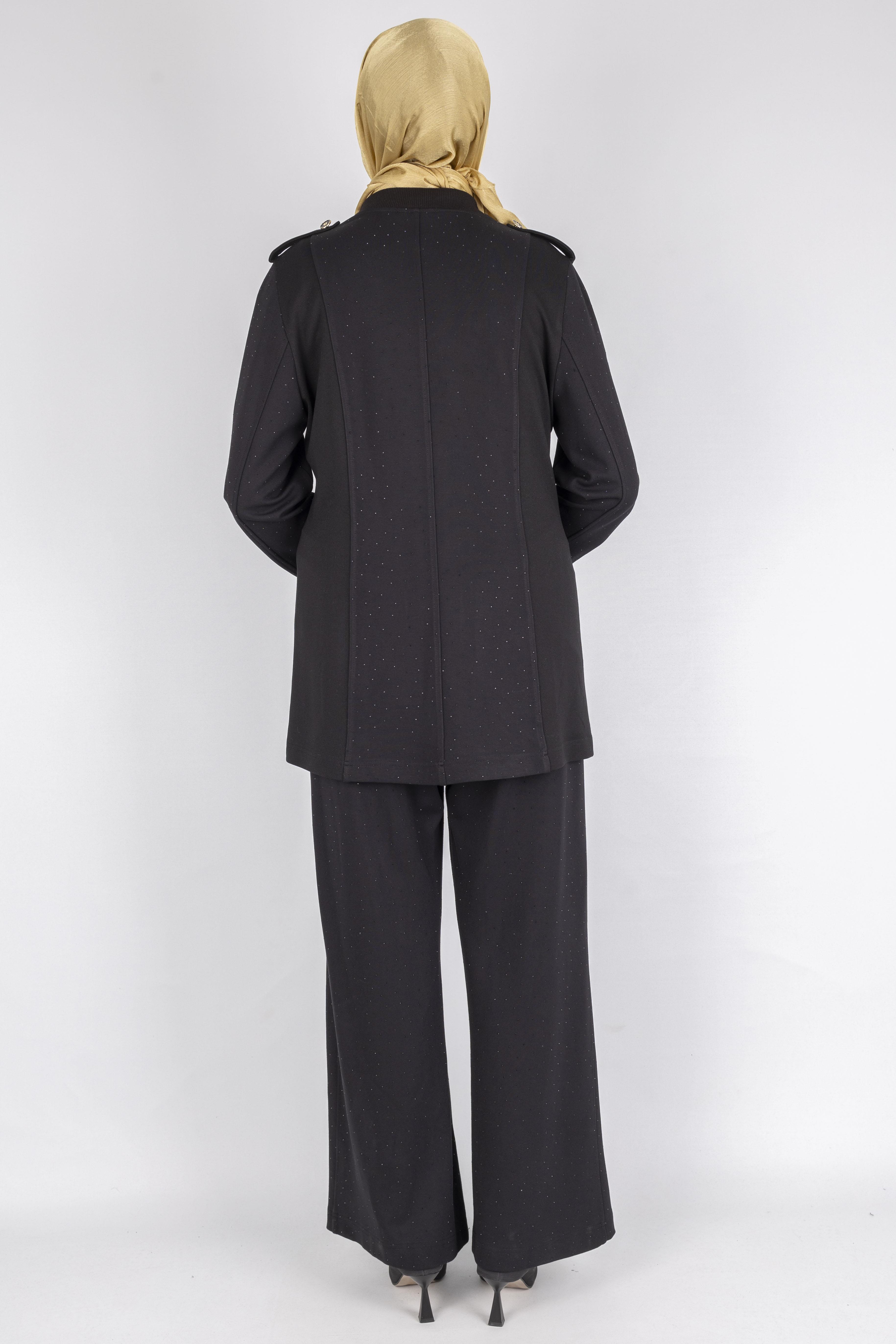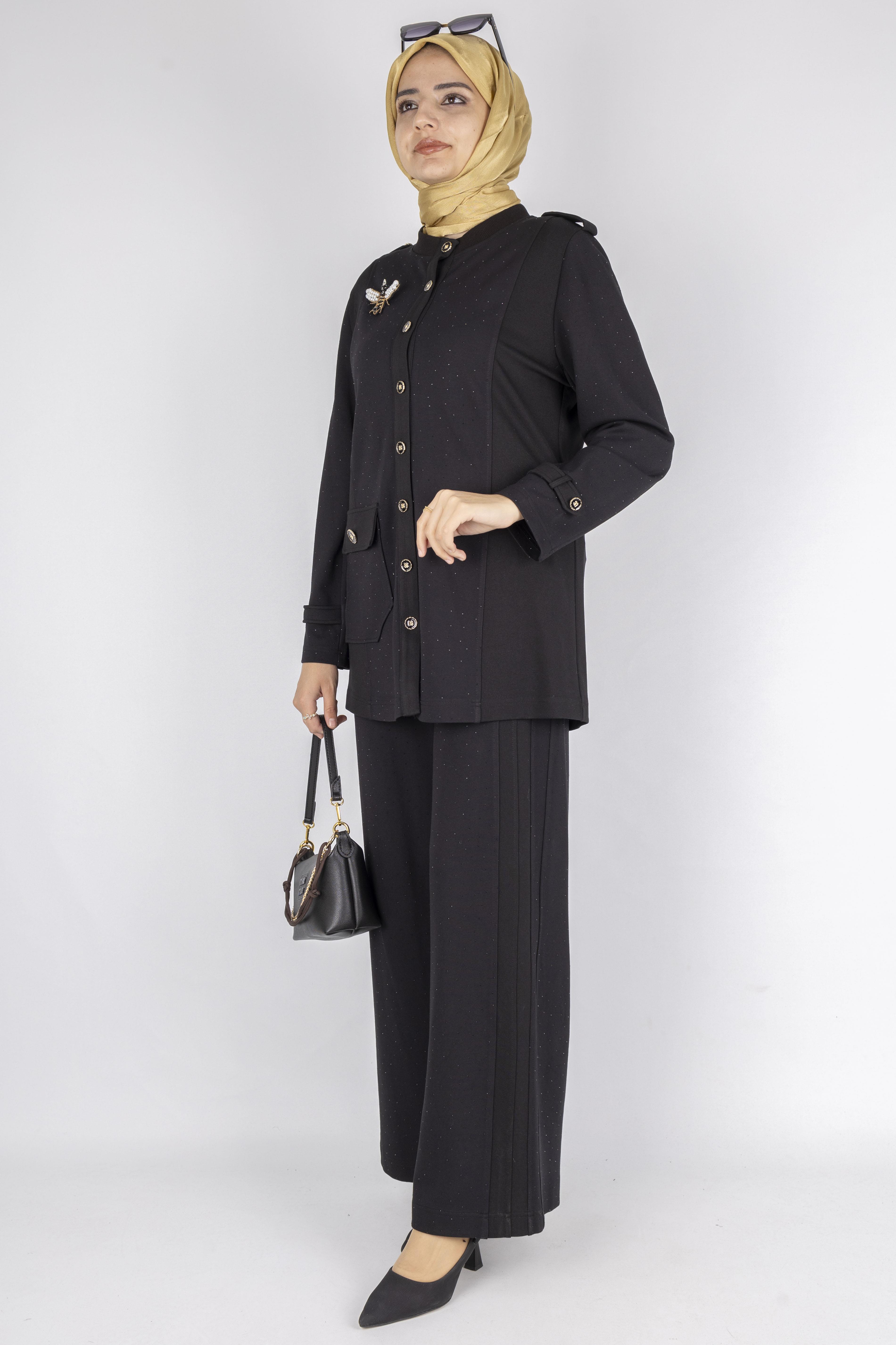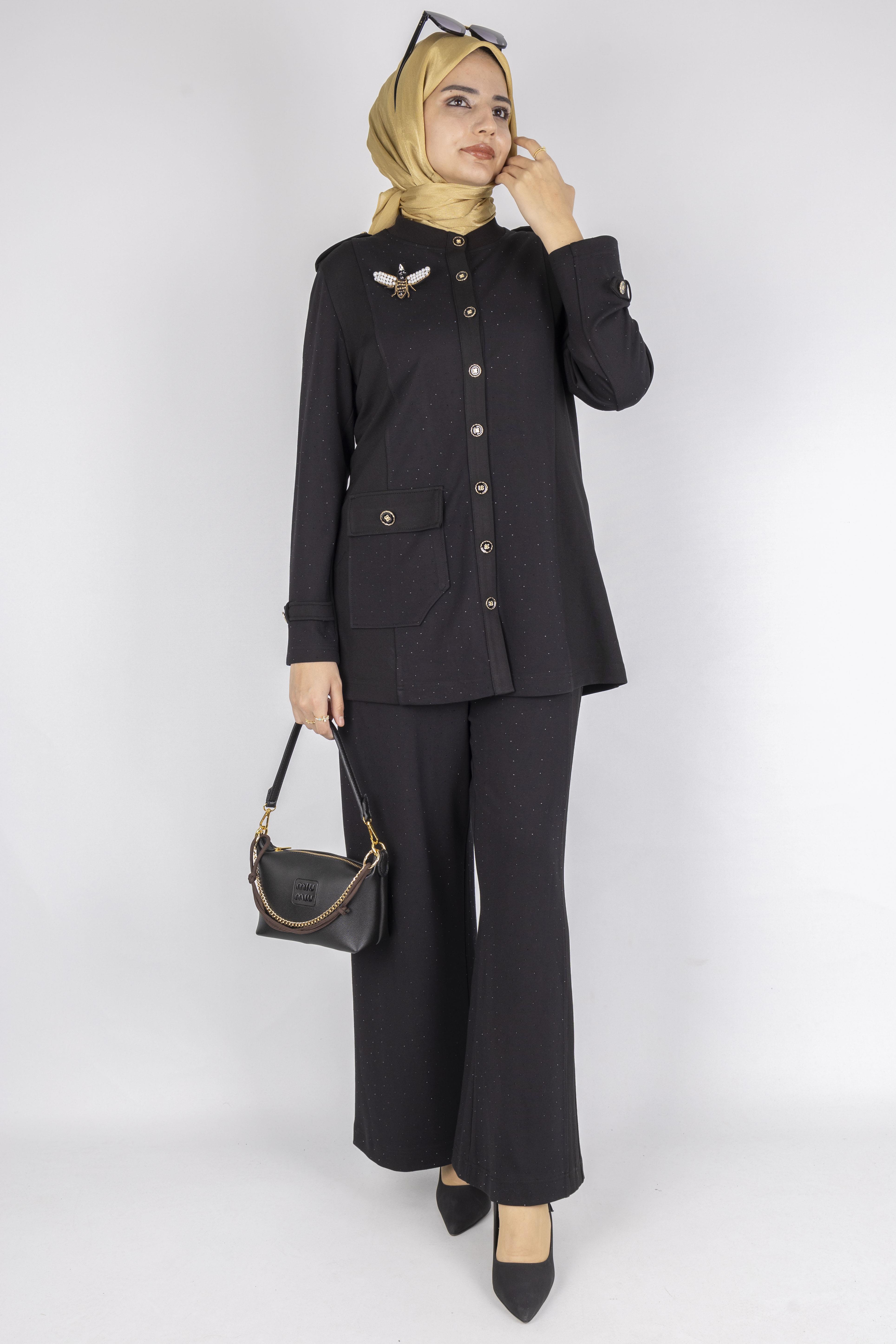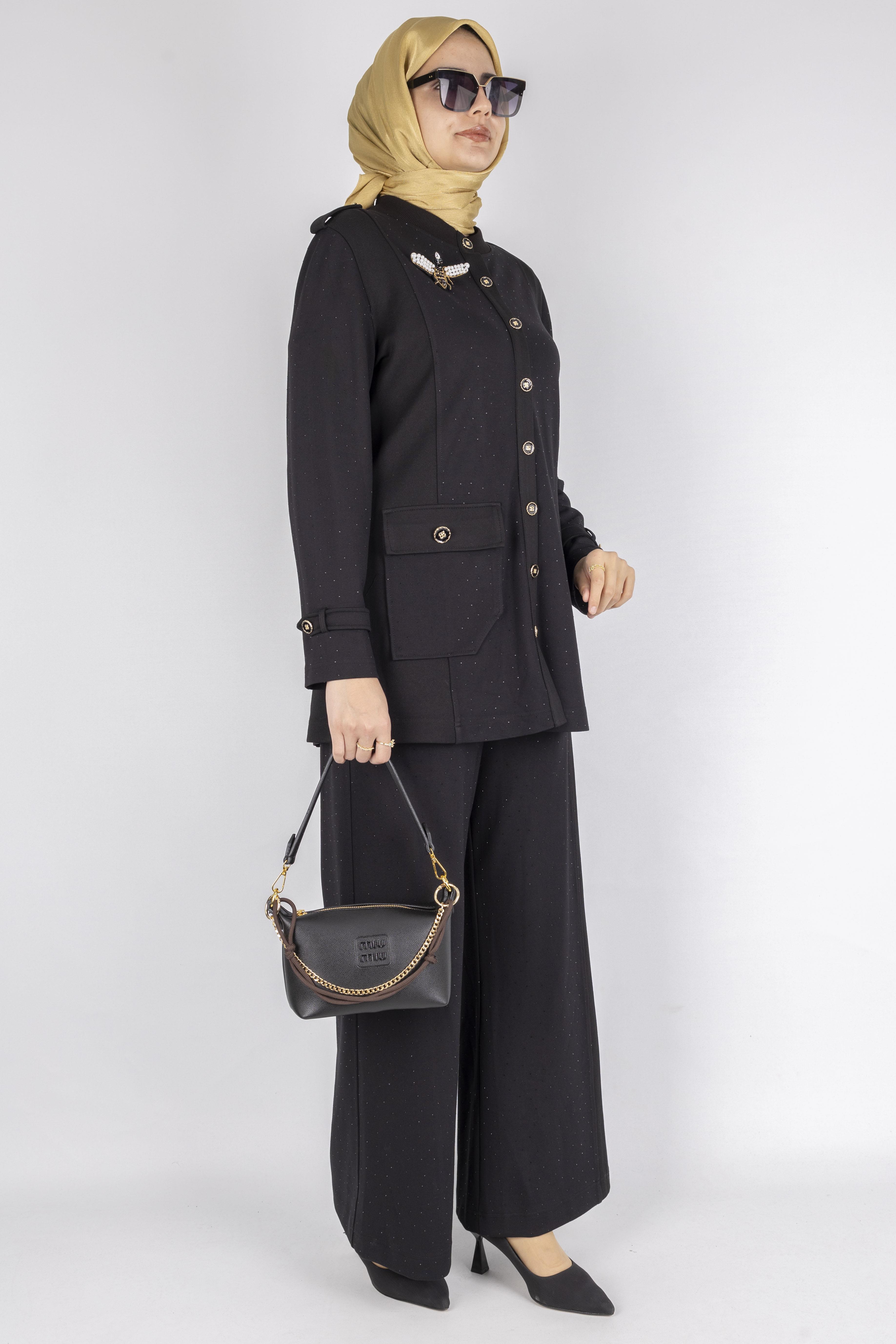 Broşlu Cep Kapaklı Tunikli Pantolon Takımı Siyah OTW1127