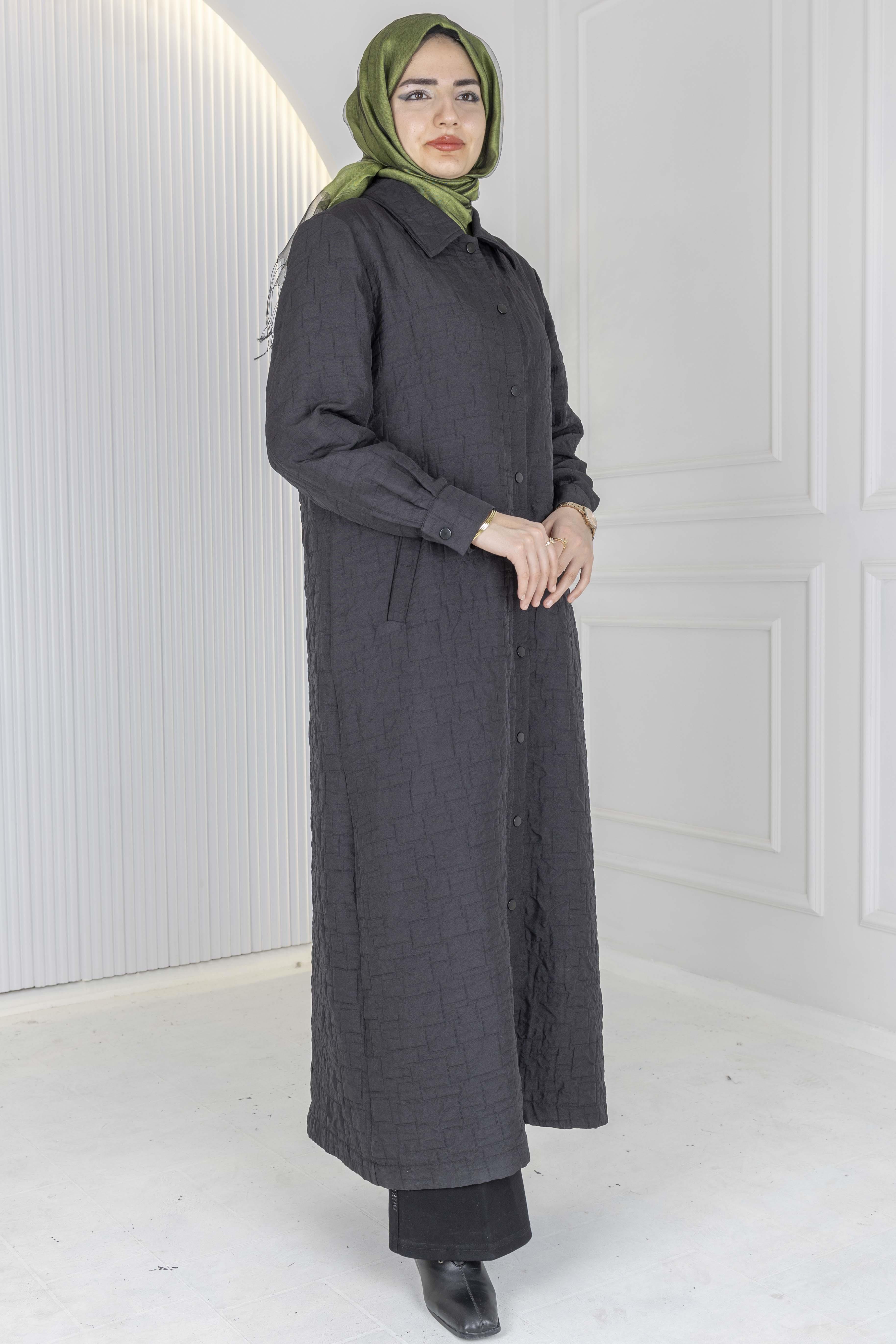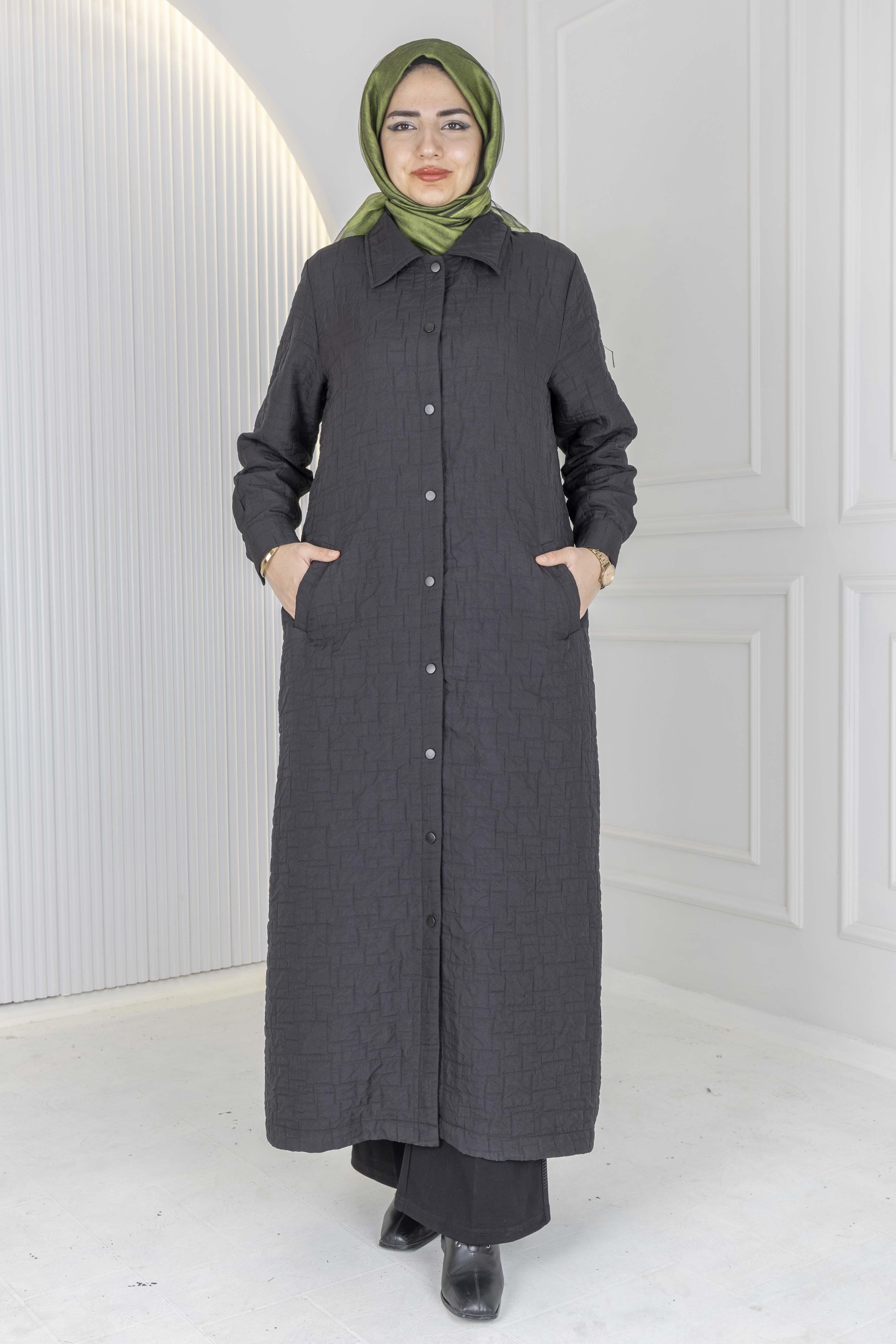 Büyük beden rahatlığını modern şıklıkla birleştiren çıtçıtlı kapitone uzun ferace, 140 cm boyu ve dökümlü kalıbı sayesinde vücuda yapışmadan zarif bir duruş sunar. Gizli çıtçıt kapaması ile kolay kullanım sağlarken, kapitone dokusu feraceye hem sıcak hem de şehirli bir hava katar.