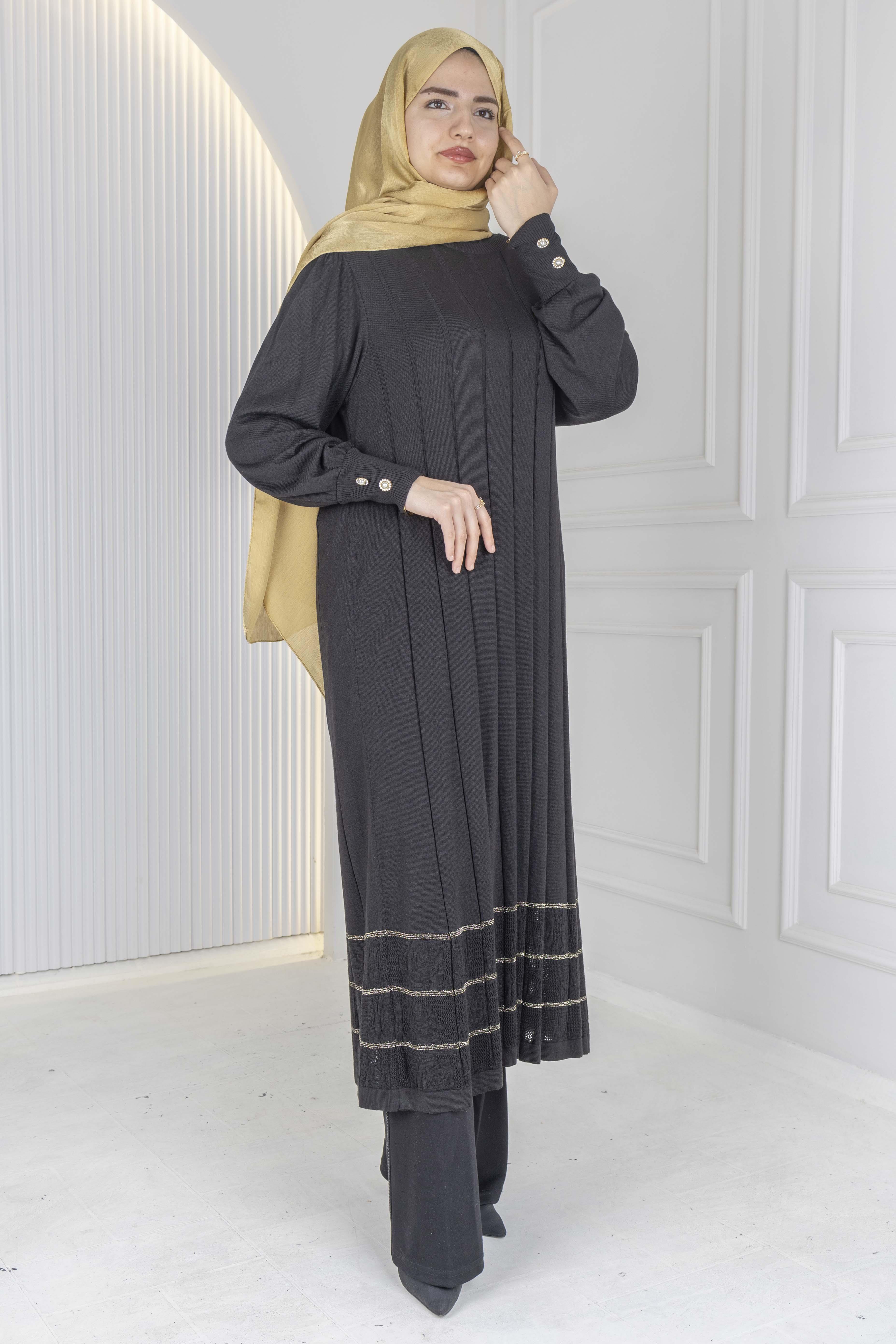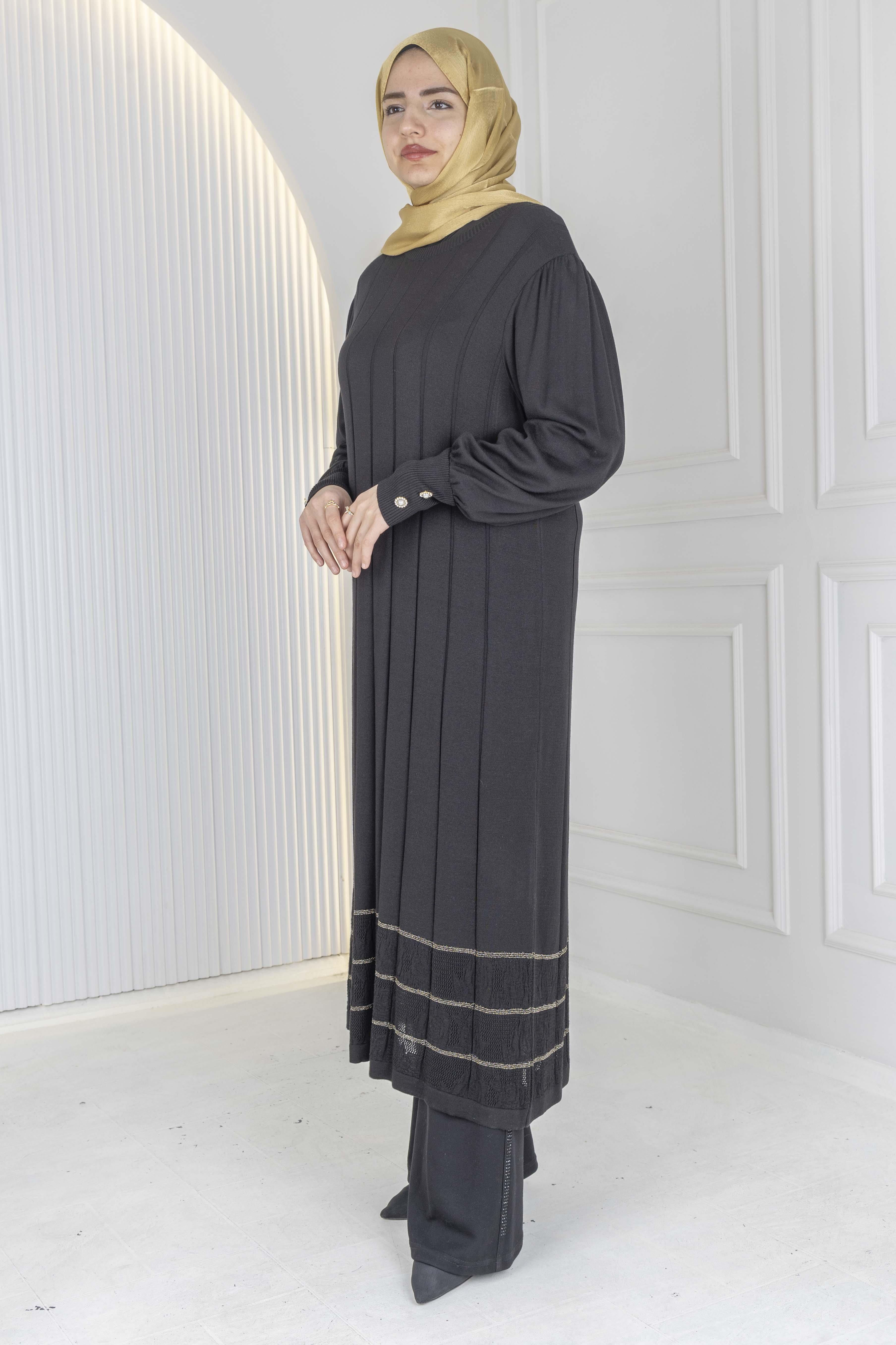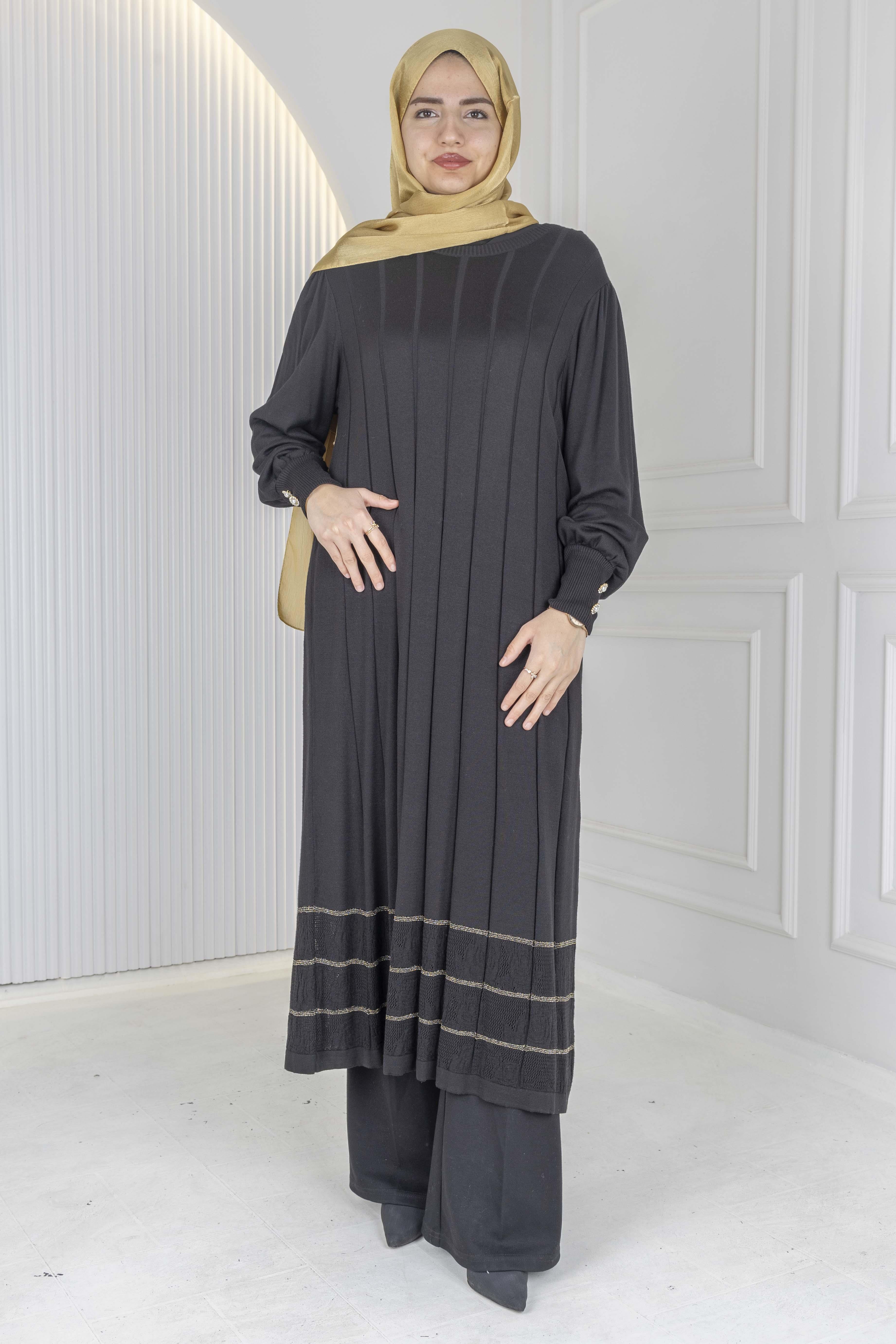 Dikey çizgili modern dokusu ve şık detaylarıyla öne çıkan bu büyük beden triko elbise & tunik, hem zarif hem de konforlu bir görünüm sunar. Yumuşak dokulu triko kumaşı sayesinde gün boyu rahatlık sağlar; uzun formu ve dökümlü yapısı her bedende hoş bir siluet oluşturur. Alt etek kısmındaki şerit detayları modele hareket katarken, günlük kombinlerden özel davetlere kadar geniş kullanım imkânı sunar. Hem elbise olarak hem tunik olarak rahatlıkla tercih edilebilir çok yönlü bir parçadır.