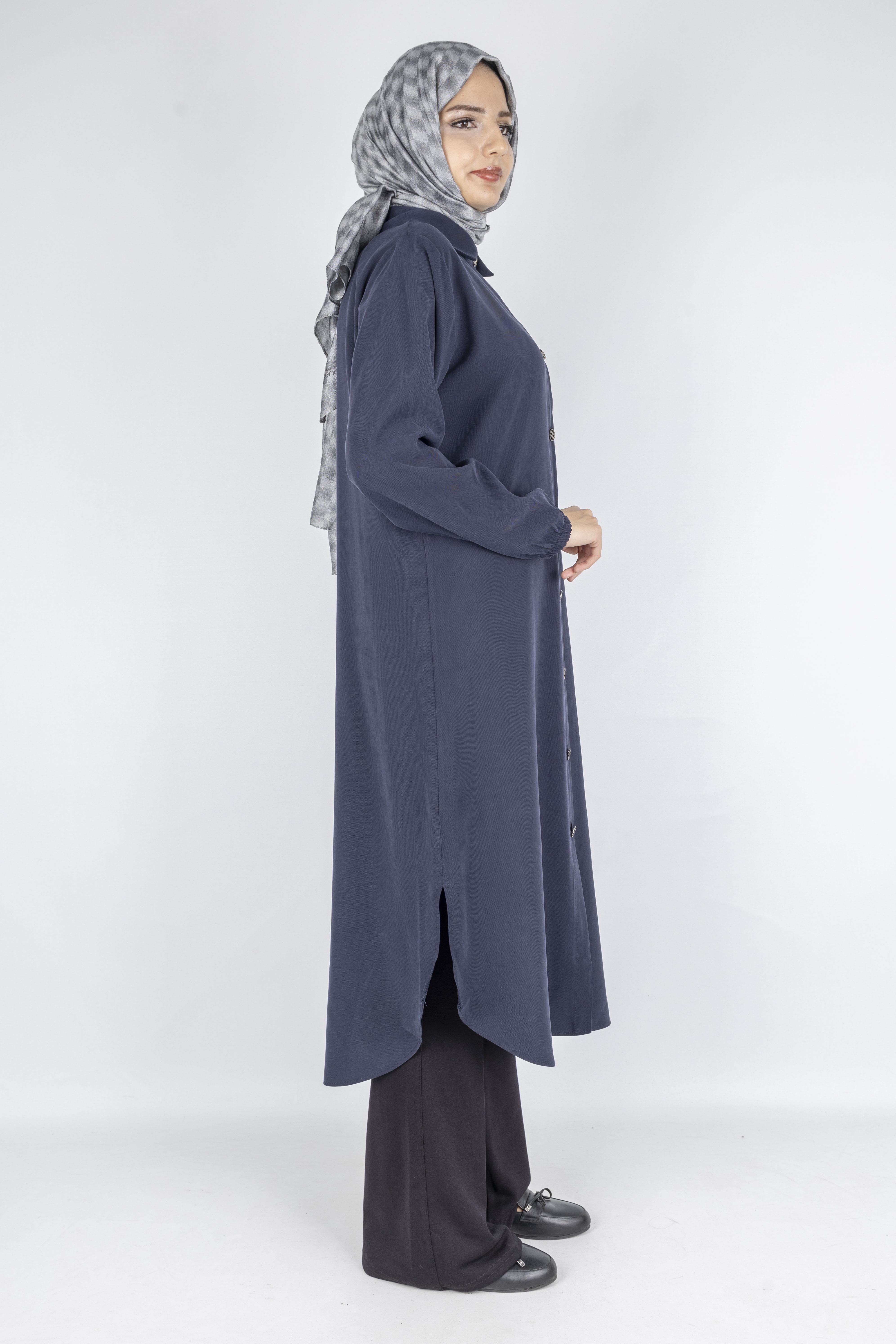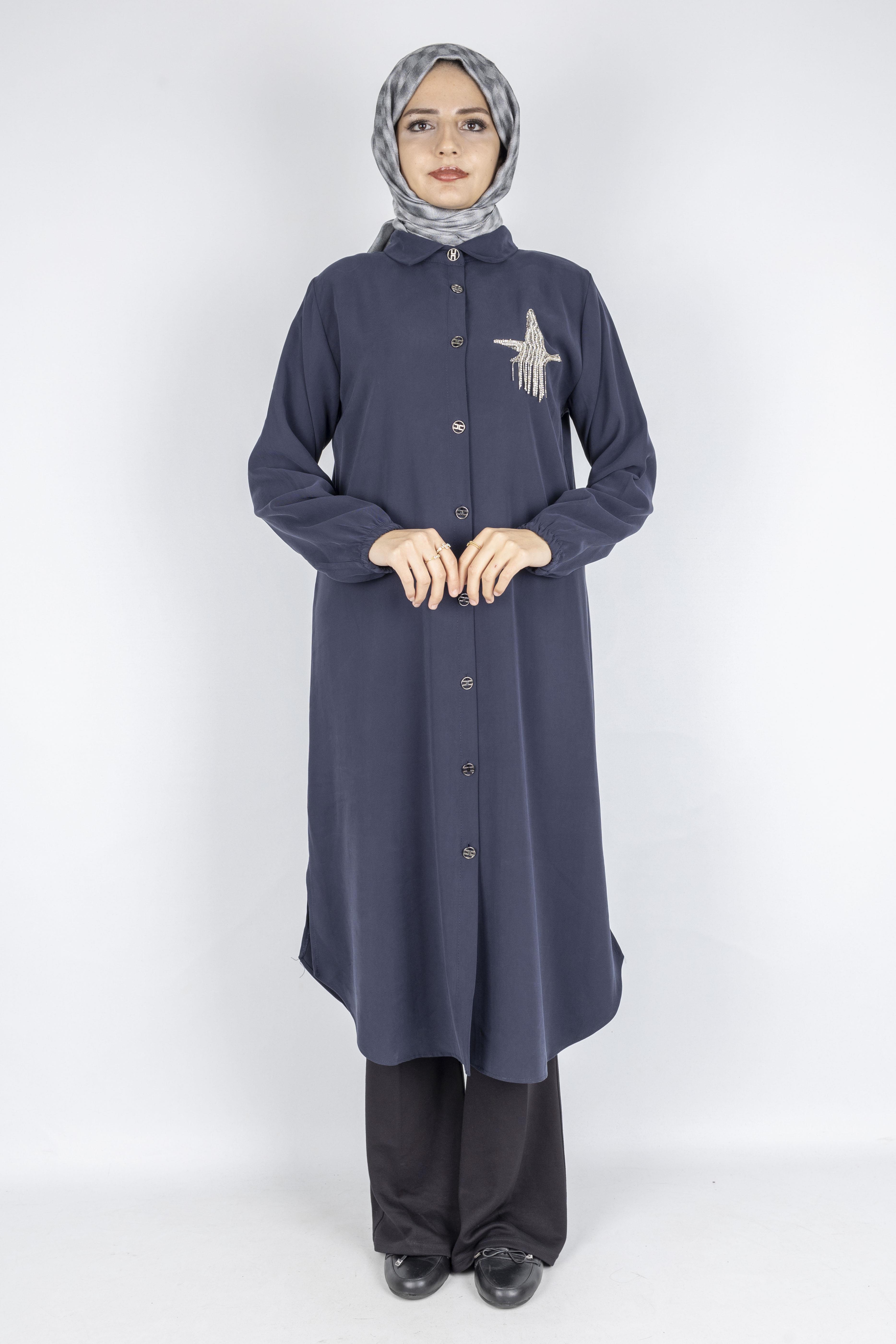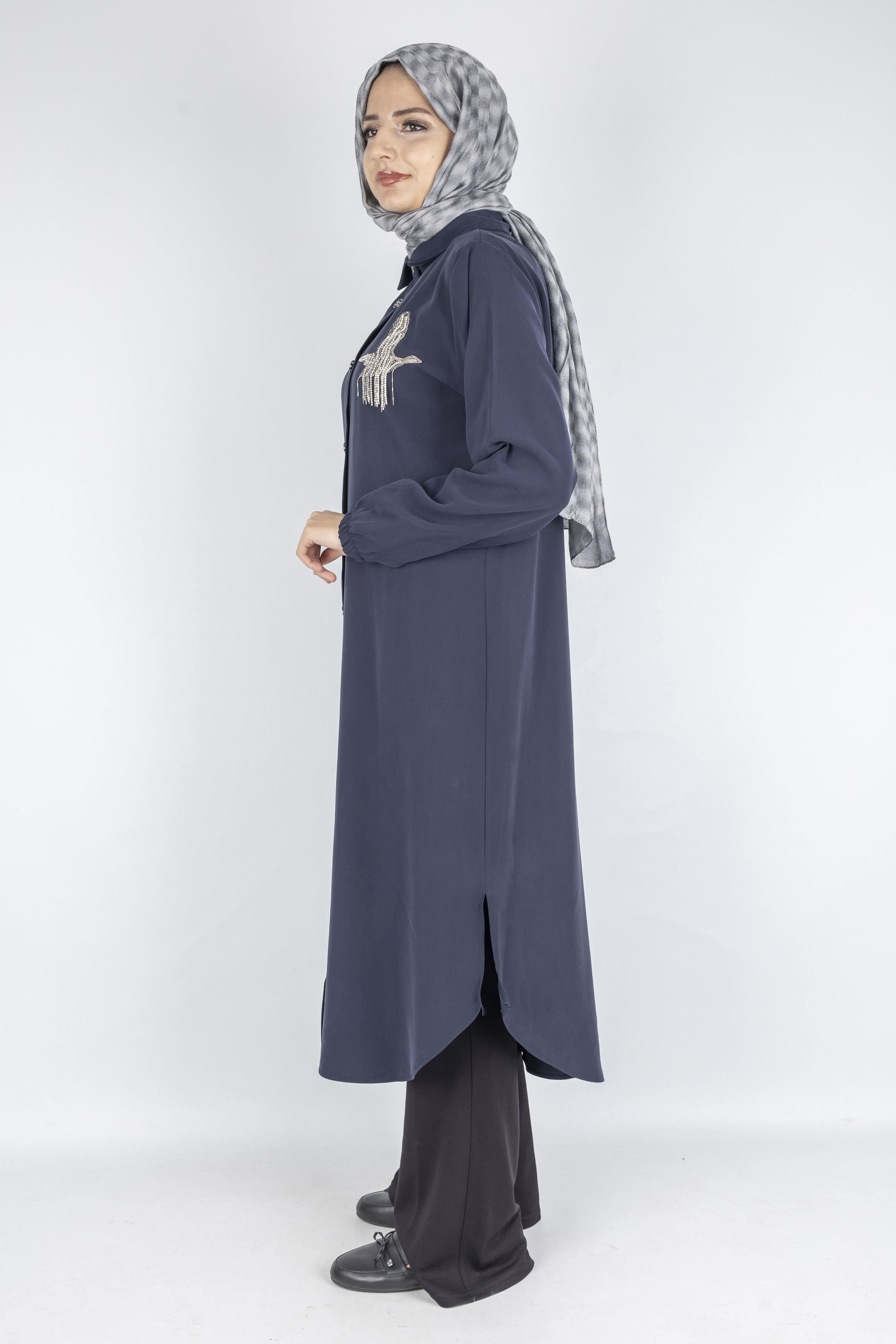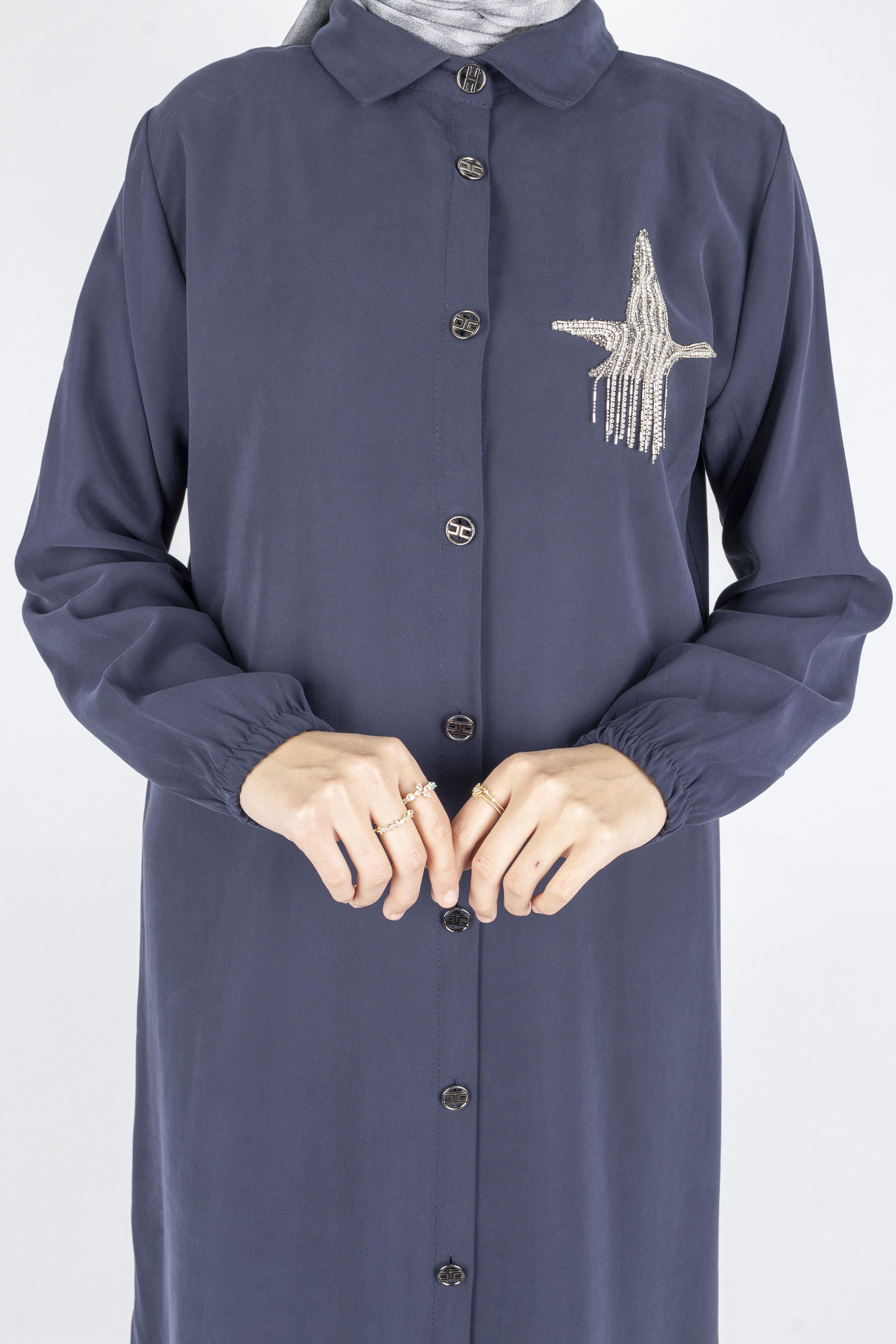 Göğüs kısmındaki zarif taş ve boncuk işlemeli motif, sade tasarıma şık bir dokunuş katarken, tam boy düğmeli ön yapısı tunik, elbise veya ferace olarak çok yönlü kullanım imkânı sunar. Kol manşetlerindeki lastik detay ise rahat giyip çıkarma kolaylığı sağlar.