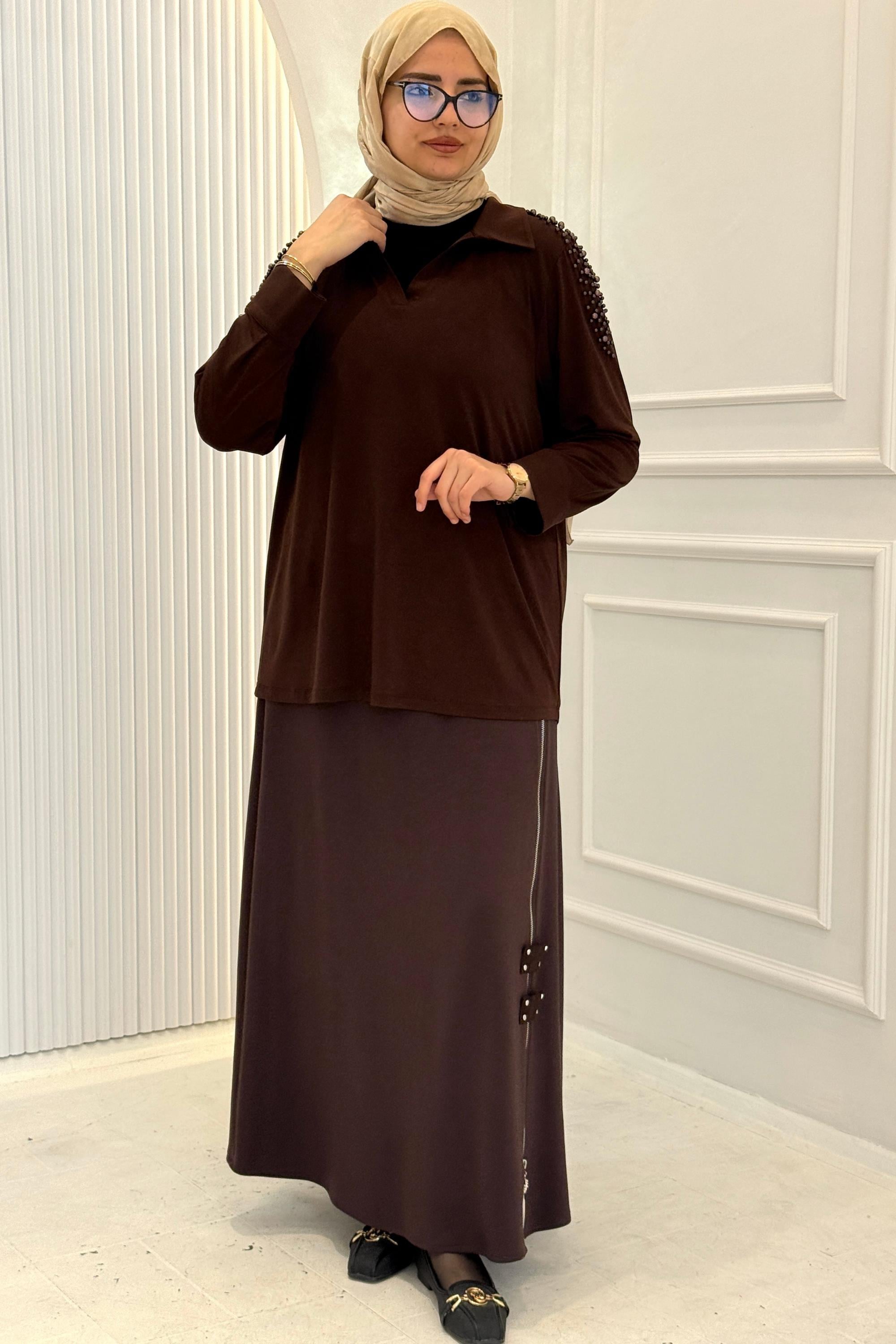 Büyük Beden Fermuar Detaylı Tesettür Etek Kahve OTW4352 Büyük Beden Fermuar Detaylı Tesettür Etek Siyah OTW4352