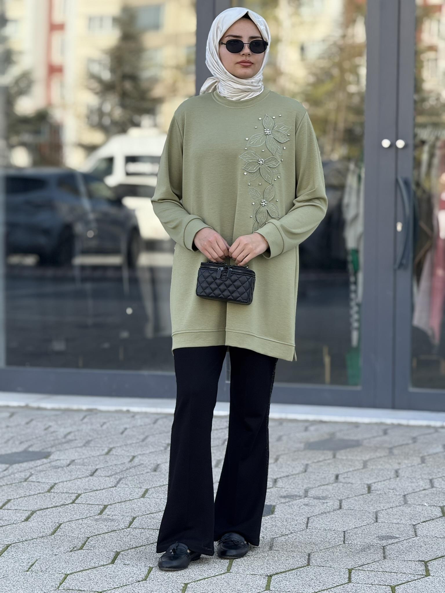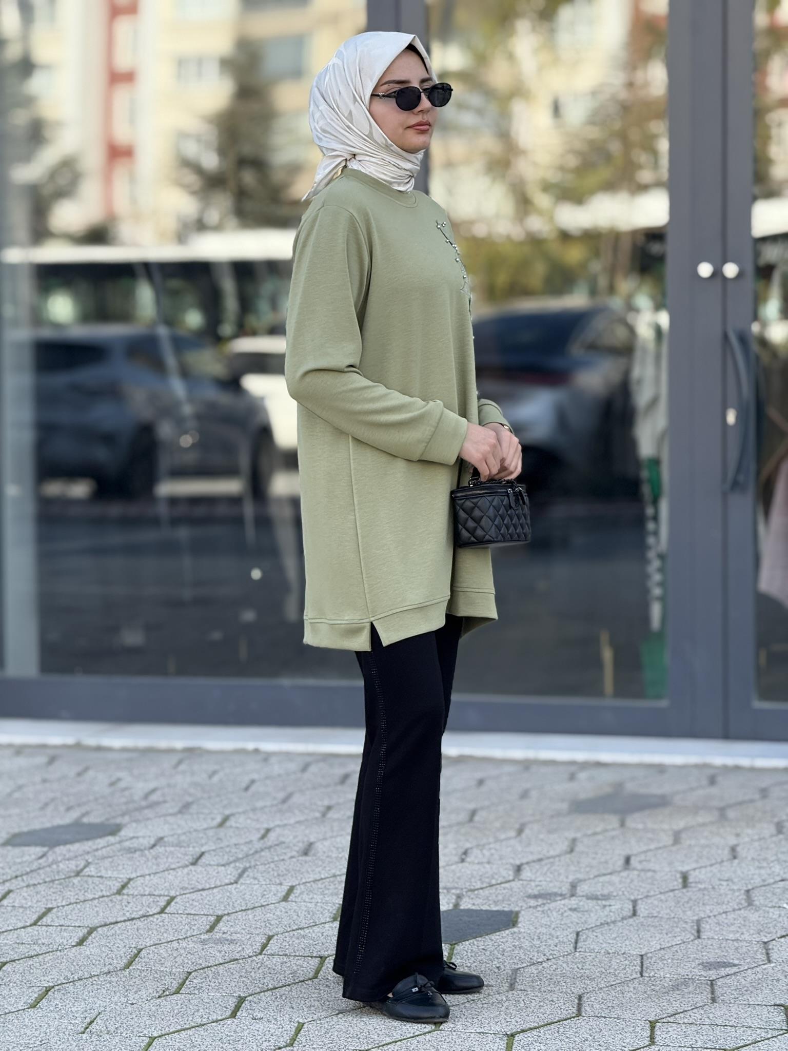 Rahat kesimi, dökümlü duruşu ve kollarındaki zarif boncuk işlemeleri ile dikkat çeken bu tunik; hem günlük şıklık hem de konfor arayanlar için ideal bir parçadır. Salaş formu sayesinde vücuda yapışmaz, büyük beden uyumlu yapısıyla her vücut tipinde şık bir görünüm sunar.