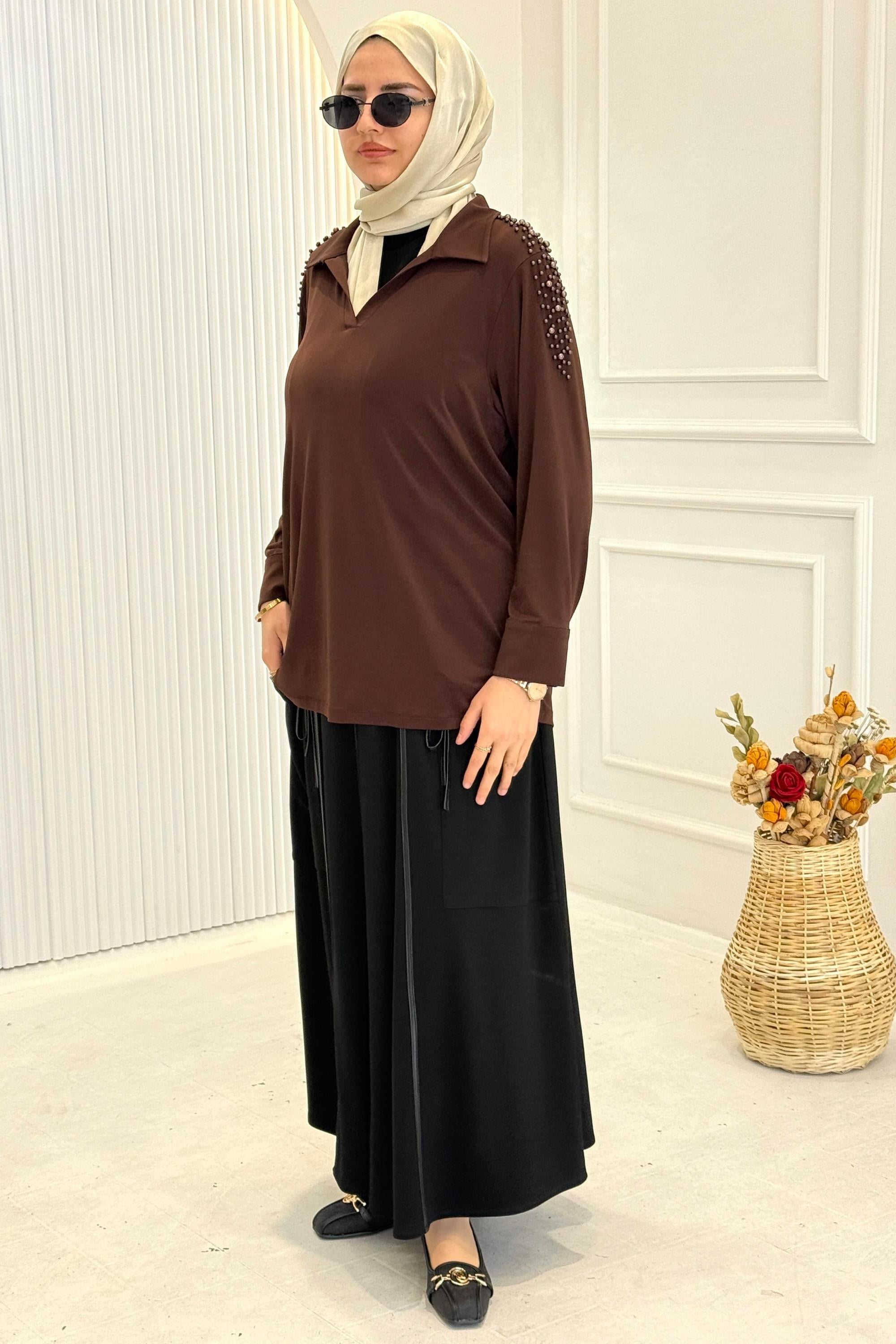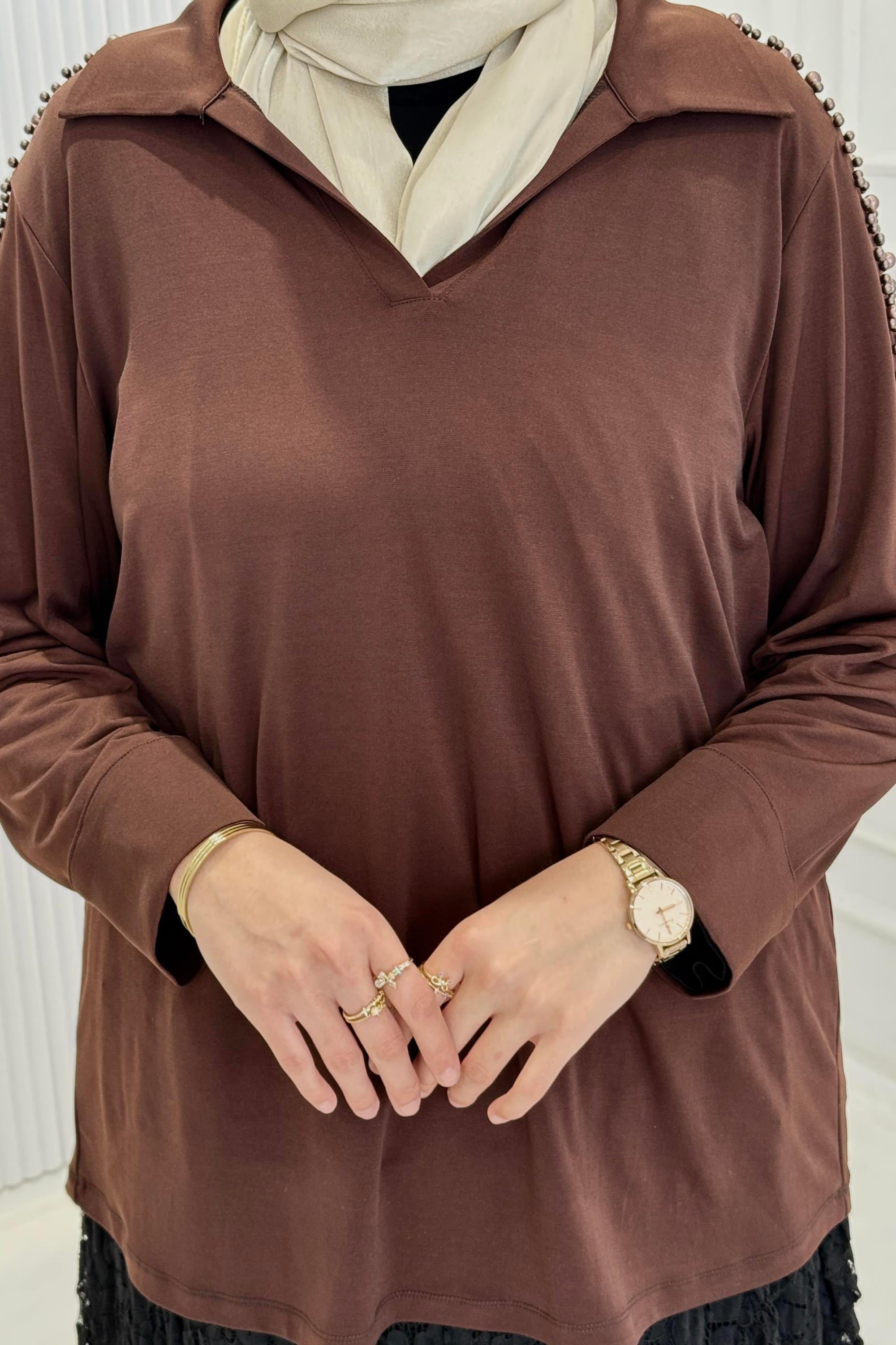 Büyük Beden İncili Çelik Örme Bluz Kahve OTW3411