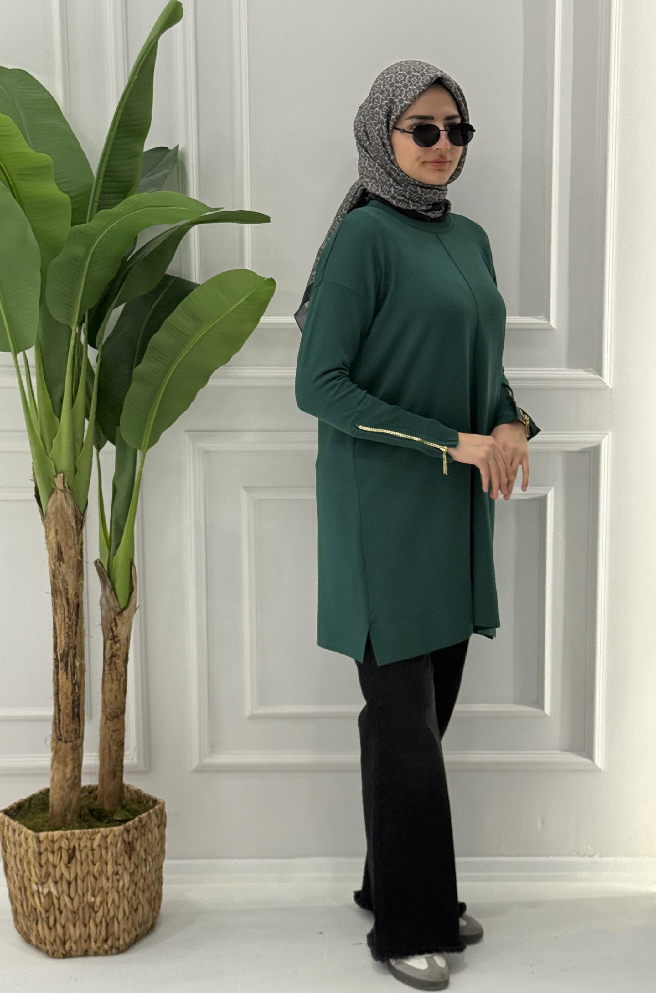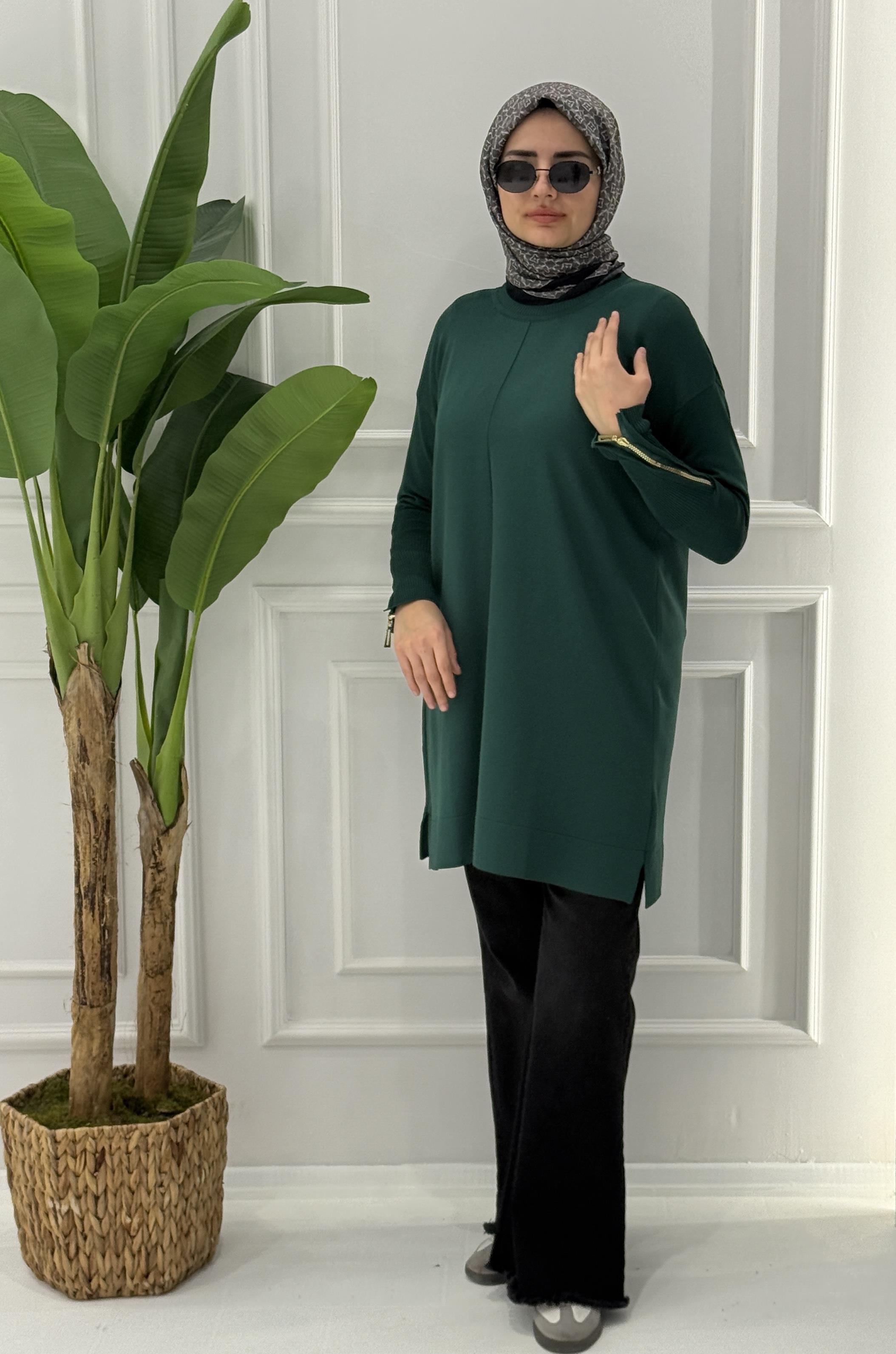 Büyük Beden Merserize Fermuarlı Kol Tunik Zümrüt OTW1042