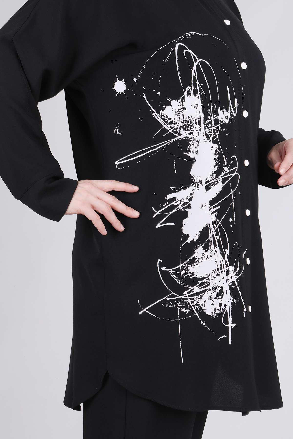 Ürün Detayları: Yarasa Kol Modelimiz Yakasız, Önden Düğmelidir. Tunik Önü Baskı İle Hareketlendirilmiştir. Pantolonun Beli Lastikli Ve Ceplidir. Paçasında Düğme Aksesuarı İle Hareketlendirilmiştir.