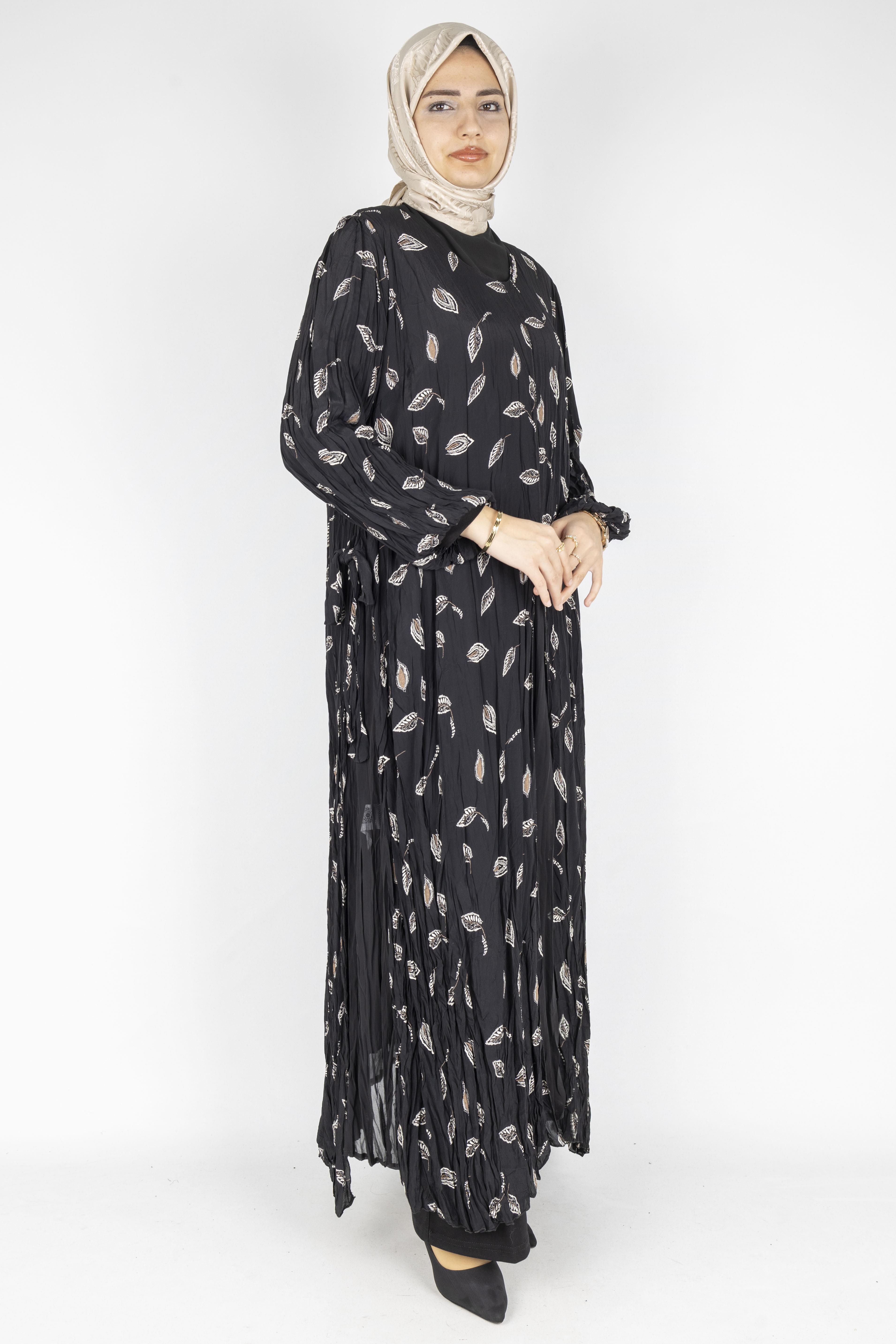 Hafif dokuma kumaşı ve dökümlü plise formuyla üretilen yaprak desenli uzun elbise, gün boyu rahatlık sunarken aynı zamanda zarif bir görünüm sağlar.Rahat kesimi sayesinde vücudu sıkmaz, akıcı kumaşı sayesinde şıklığı ve konforu bir arada sunar.Özel günlerde, günlük kullanımlarda ve tesettür kombinlerinde kolayca tercih edilen kurtarıcı bir modeldir.