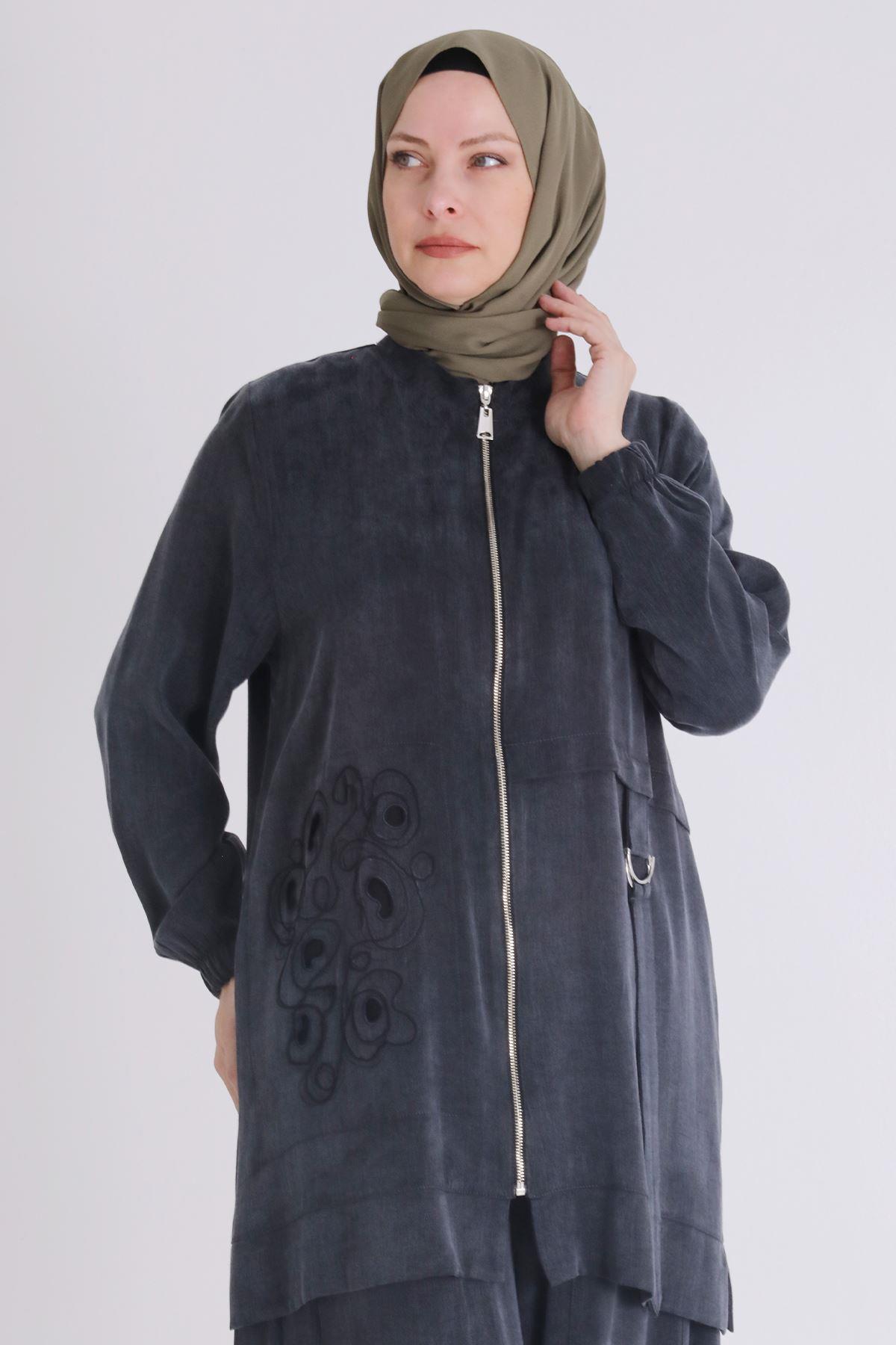Ürün Detayları: Önden fermuarlı, laşe nakışlı ürünümüzün kol ucu lastiklidir. Pantolon beli lastikli ve cepli olup şalvar kesime sahiptir.