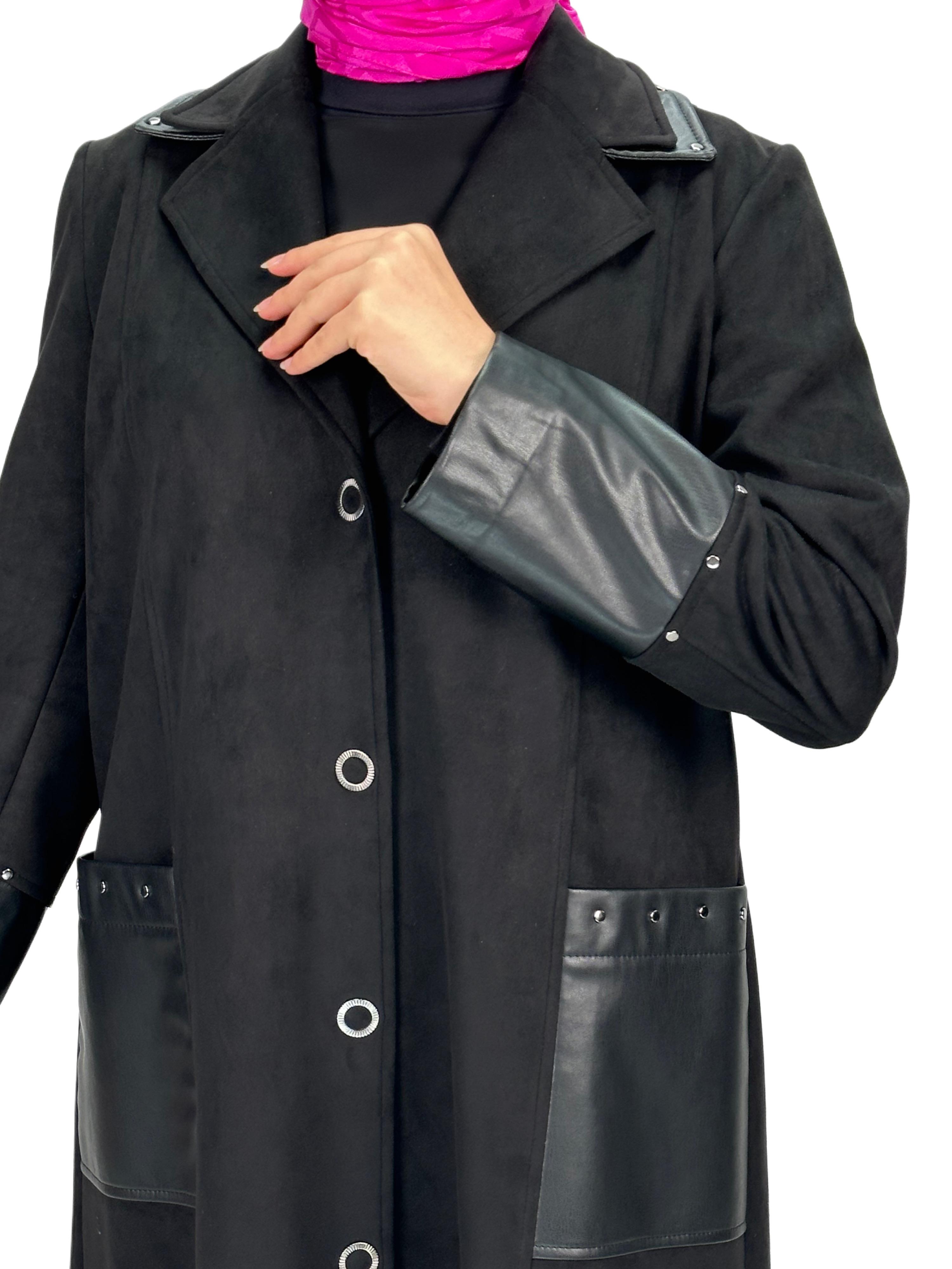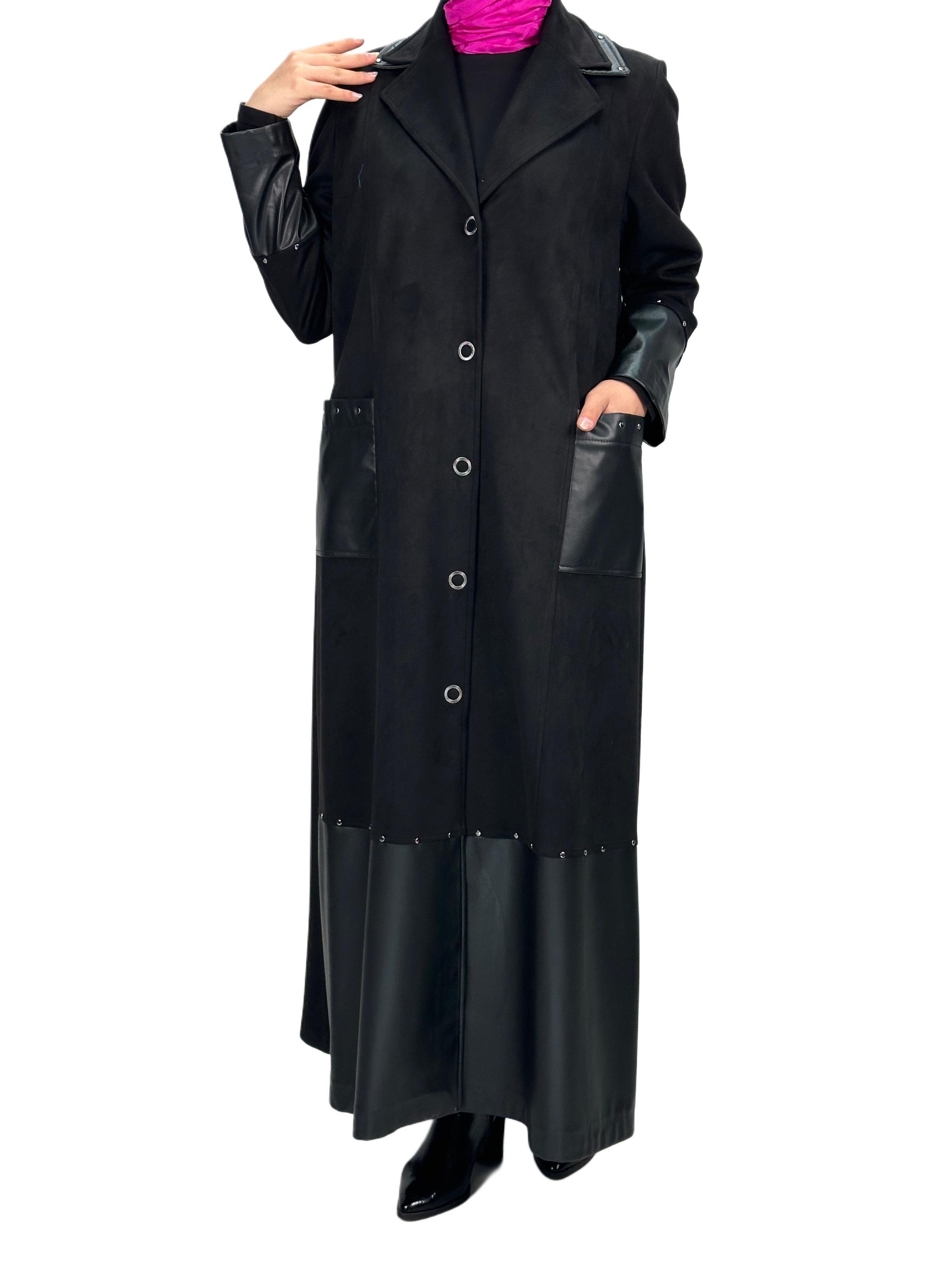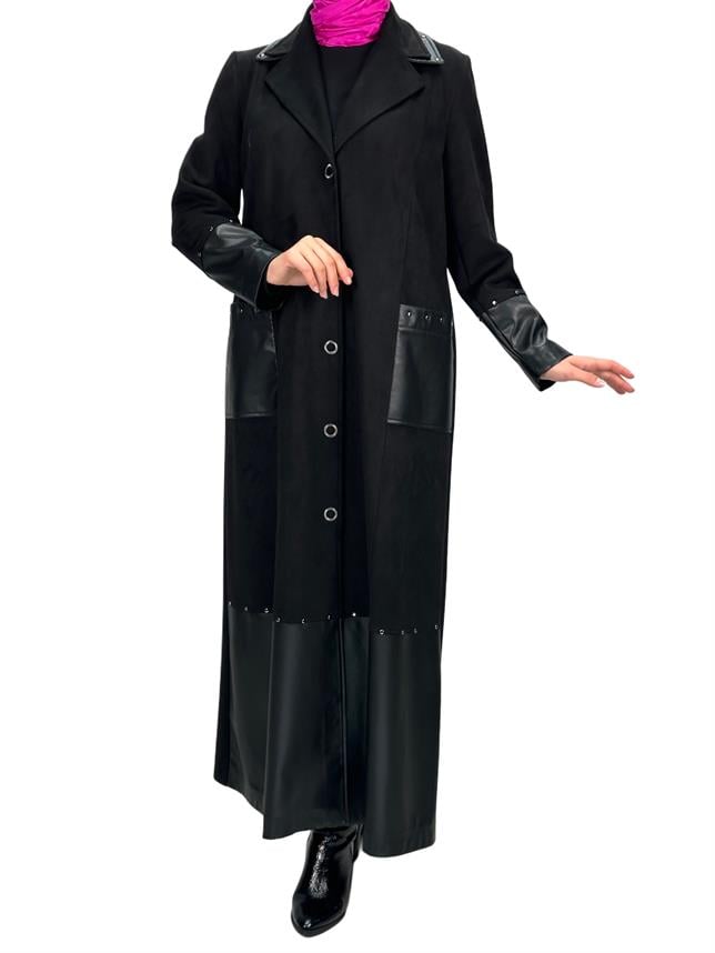 Ürün Detayı: Deri detaylı süet uzun kap modelimiz astarsızdır. Boydan Çıtçıtlı ve iki yandan ceplidir.