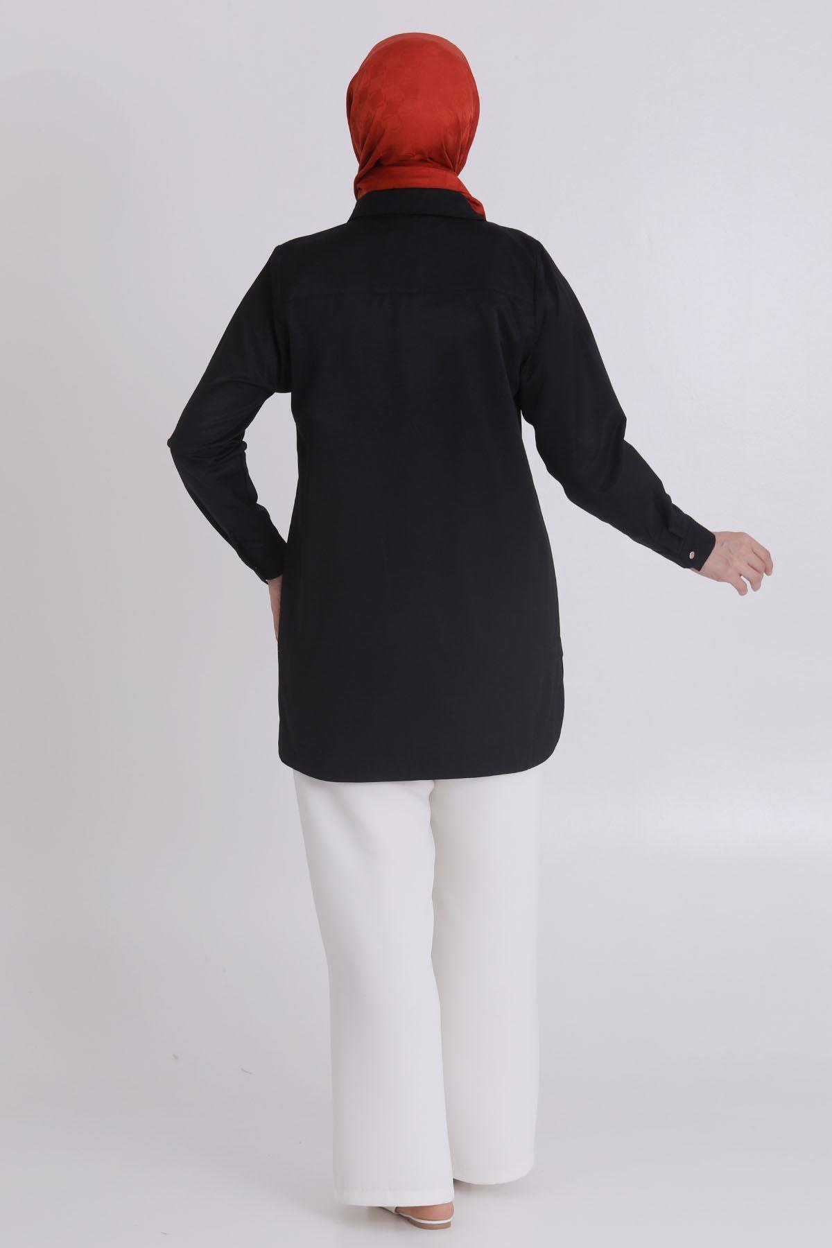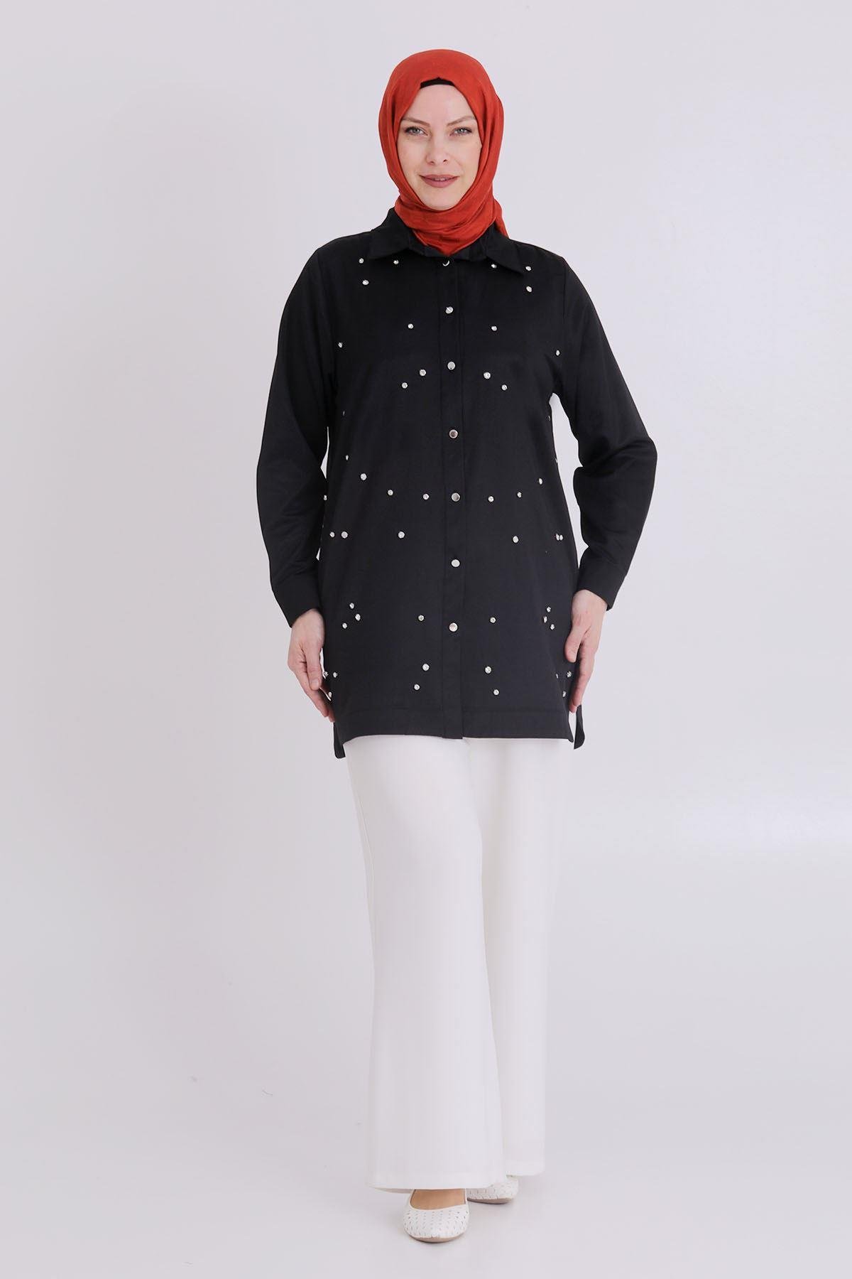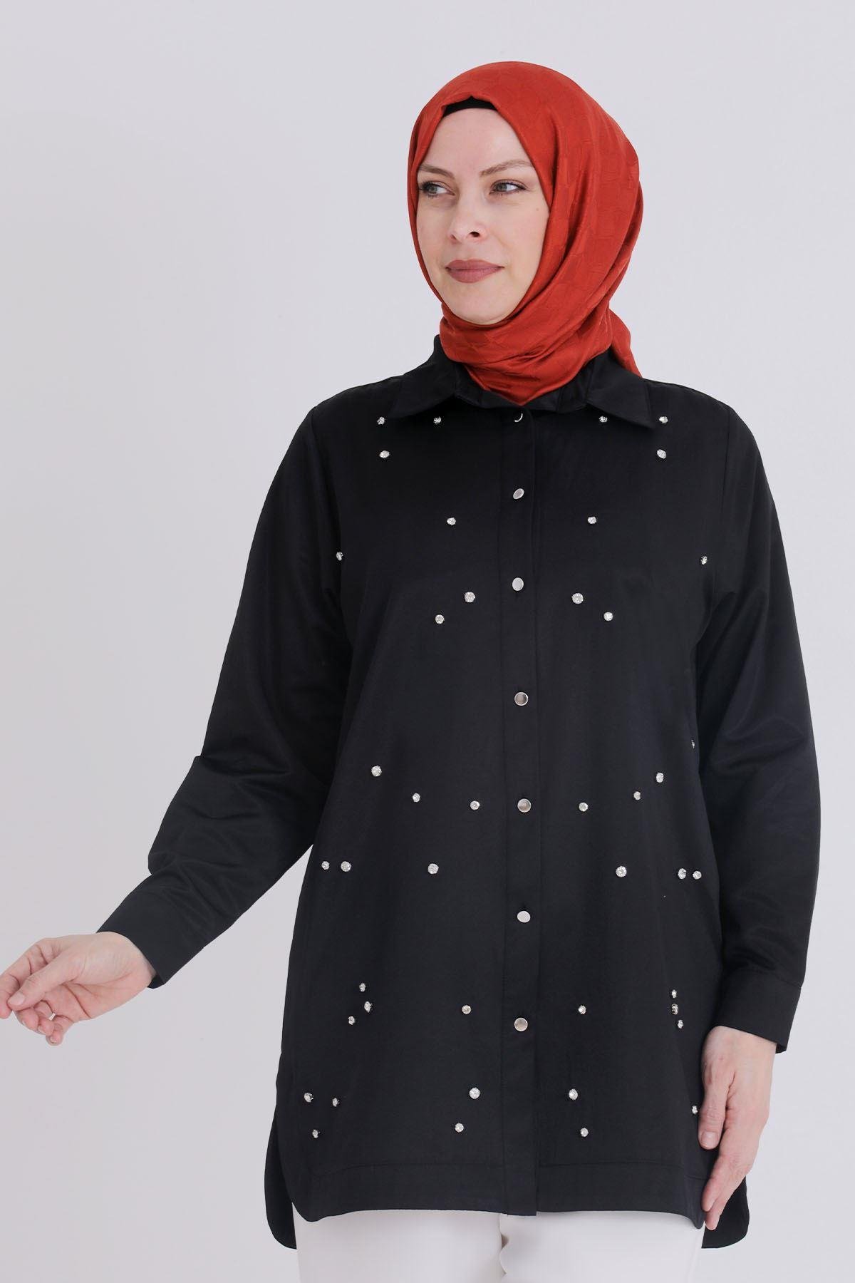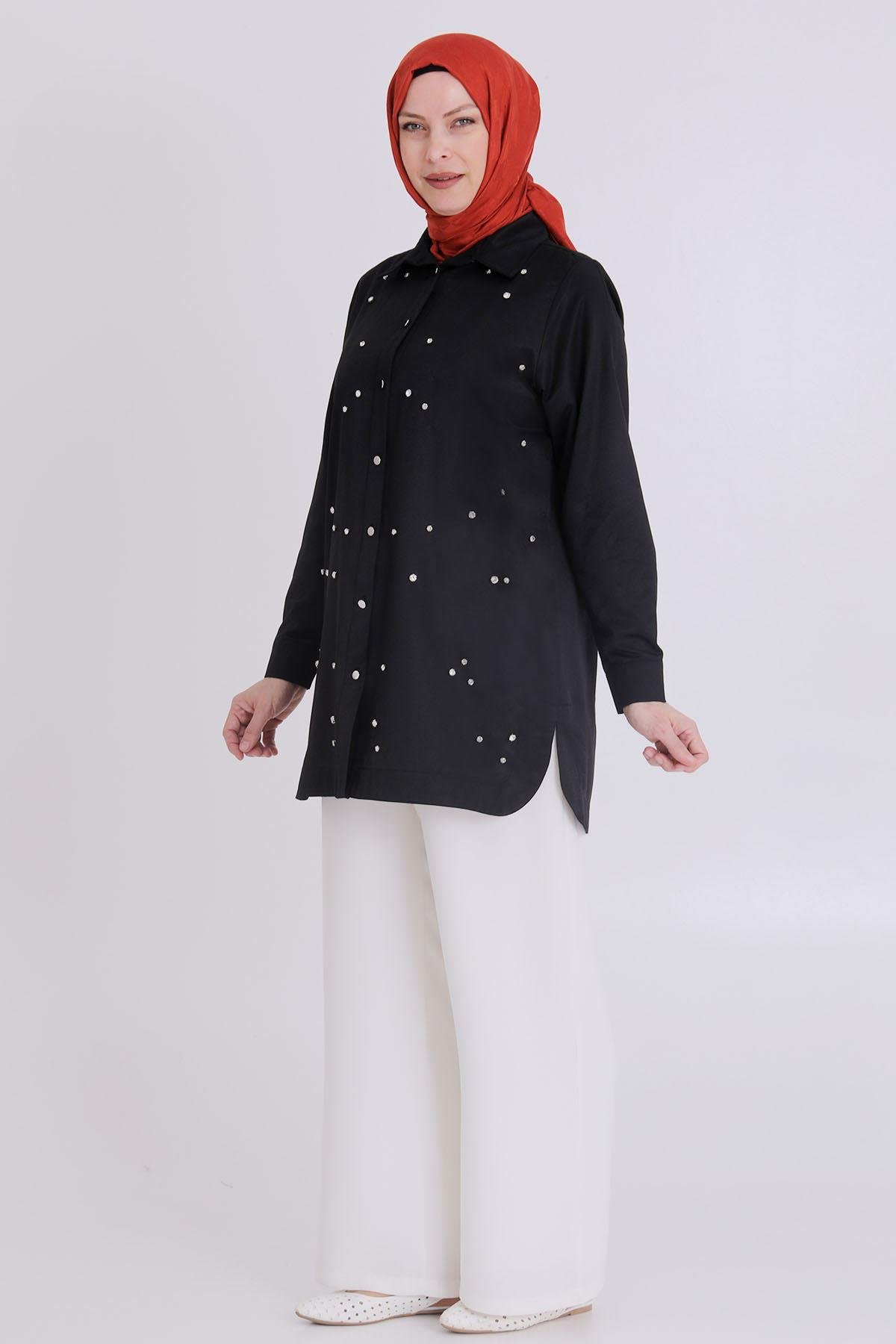 Ürün Detayları: Önden düğmeli modelimizin kolları manşetlidir. Önü çakma taşlar ile hareketlendirilmiştir.