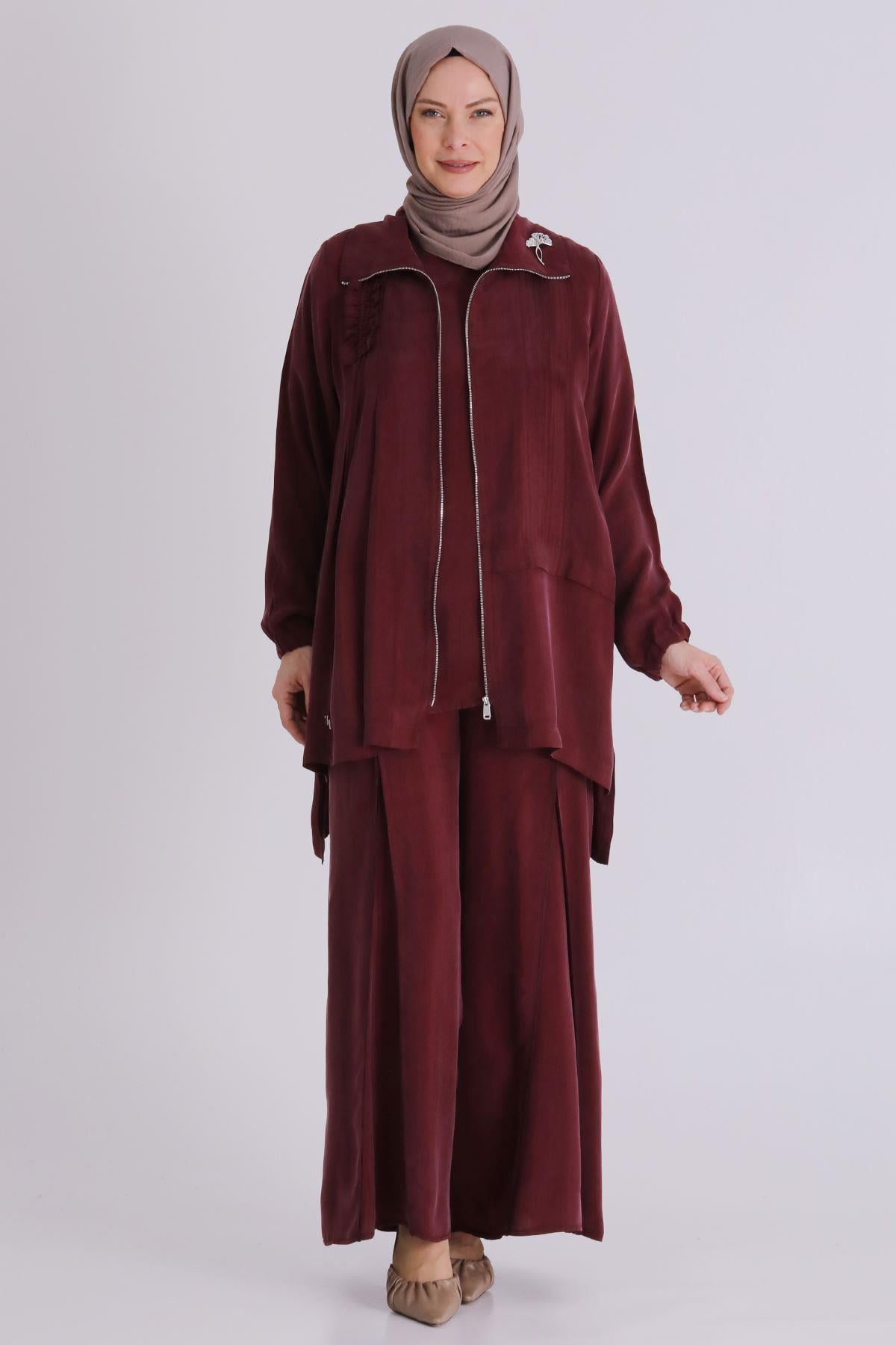 Behrem Büyük Beden Tesettür Cupro Üçlü Pantolonlu Takım Yakut OTW70021
