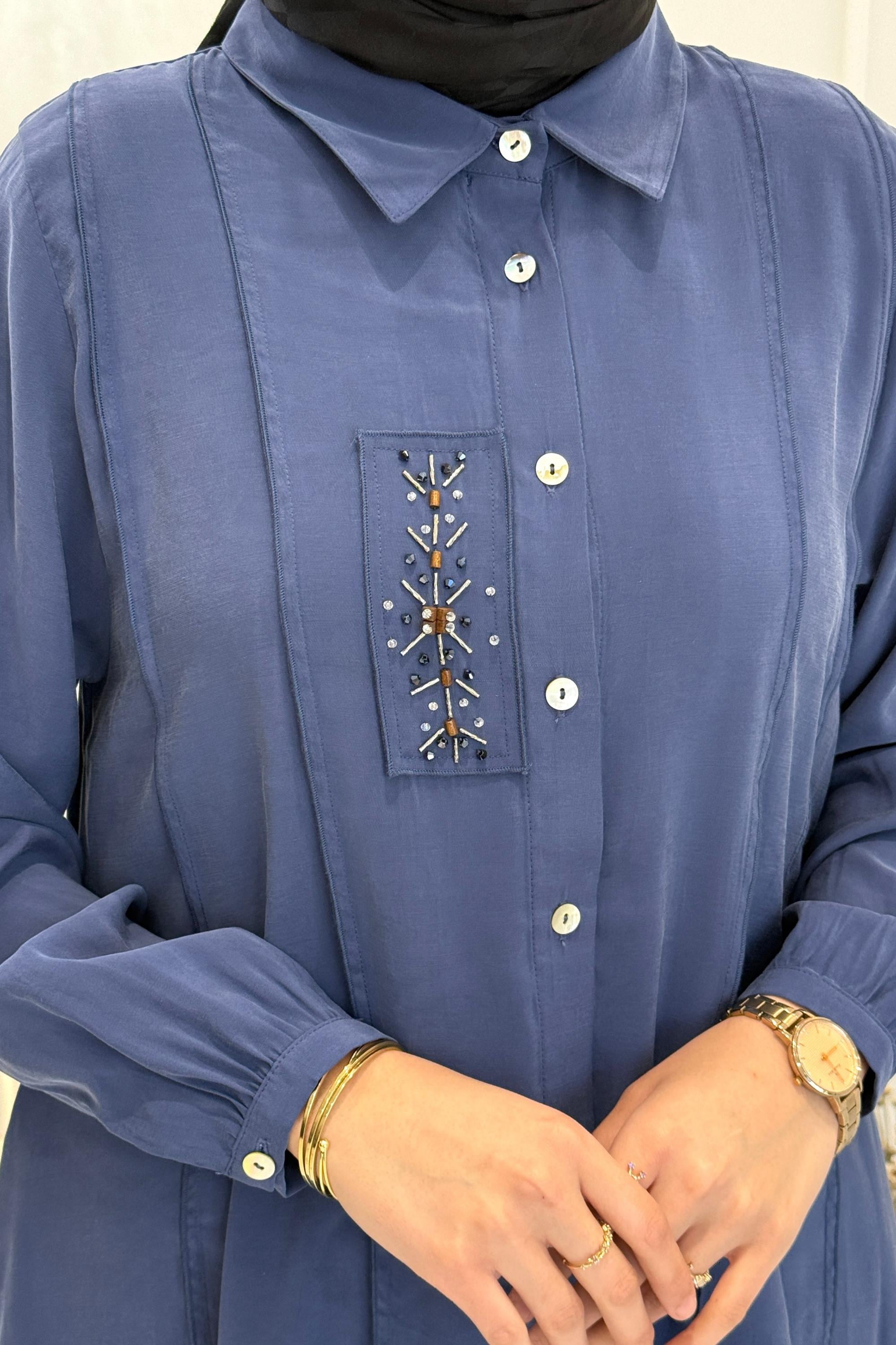 Behrem Büyük Beden Tesettür İşlemeli Tunik İndigo OTW2359