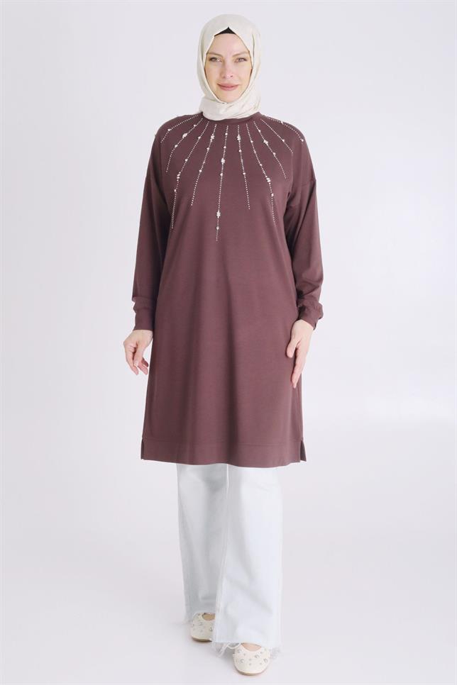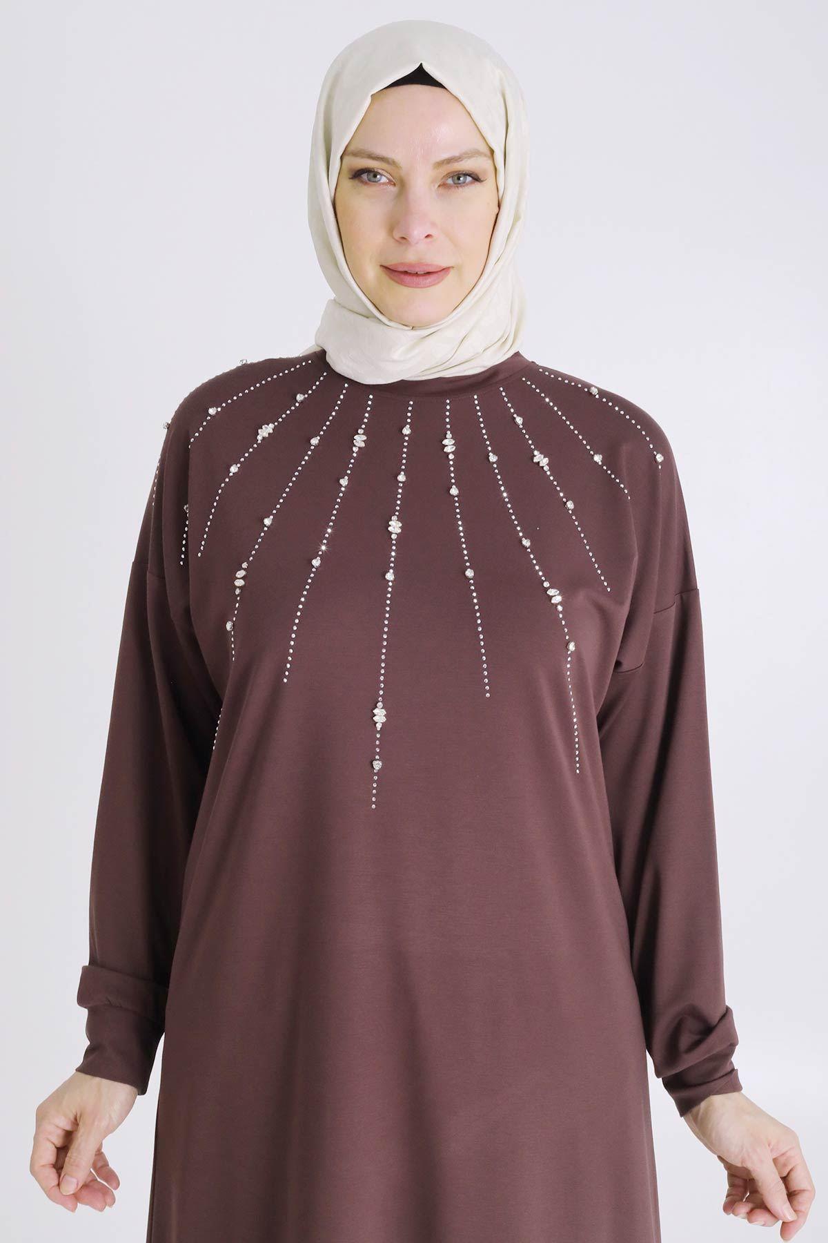 Behrem Büyük Beden Tesettür Örme Taşlı Tunik Kahve OTW20122