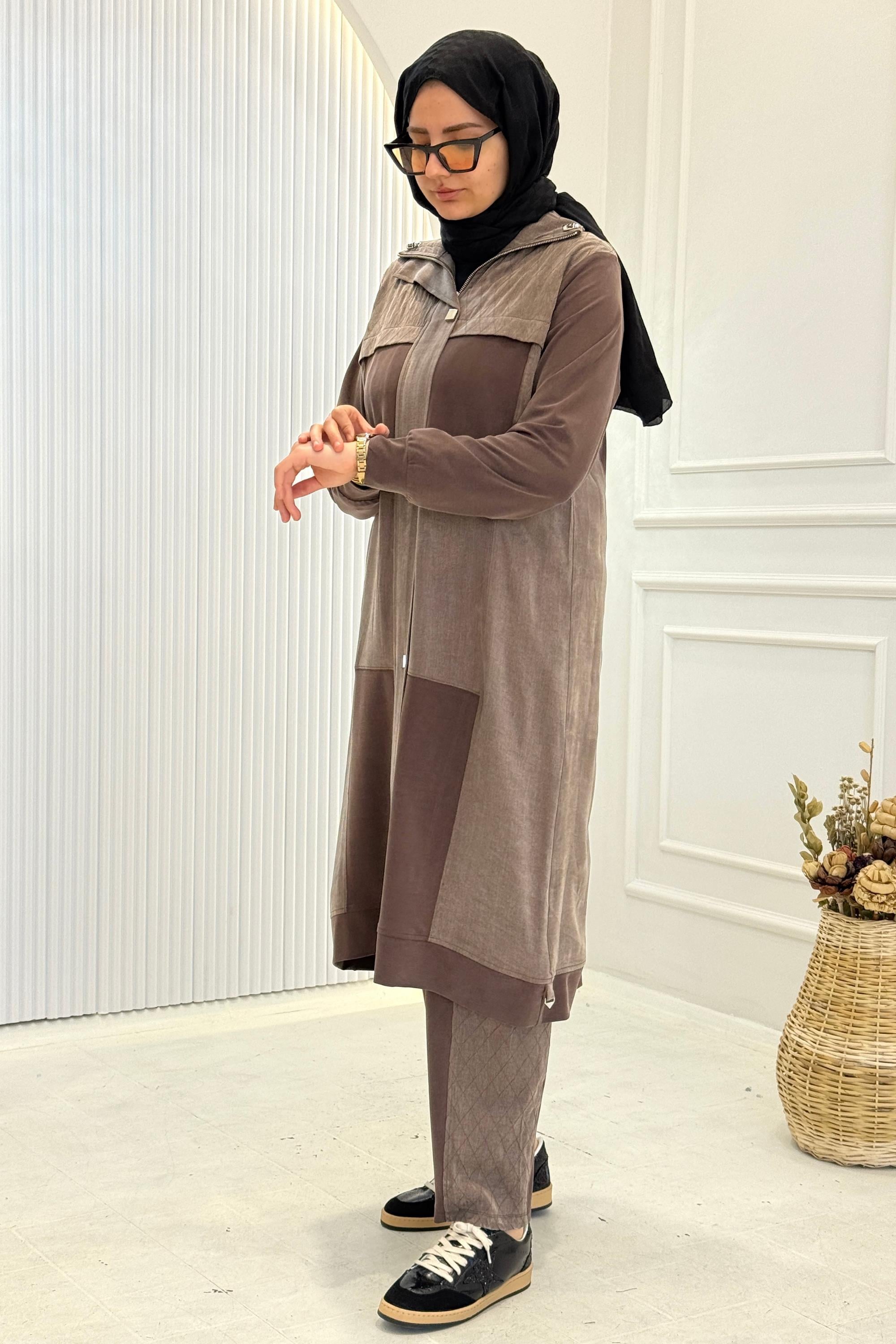 Ürün Detayları: Devrik yaka, önden fermuarlı ürünümüz dikiş detaylı ve ceplidir. Metal aksesuarlar ile hareketlendirilmiştir. Pantolon beli lastikli ve ceplidir. Kullanım konforunuz düşünülerek ürünün hareketli bölgelerinde örme esnek kumaş kullanılmış olup ipek kupra kumaş ile de dökümlü bir görünüm elde edilmiştir.