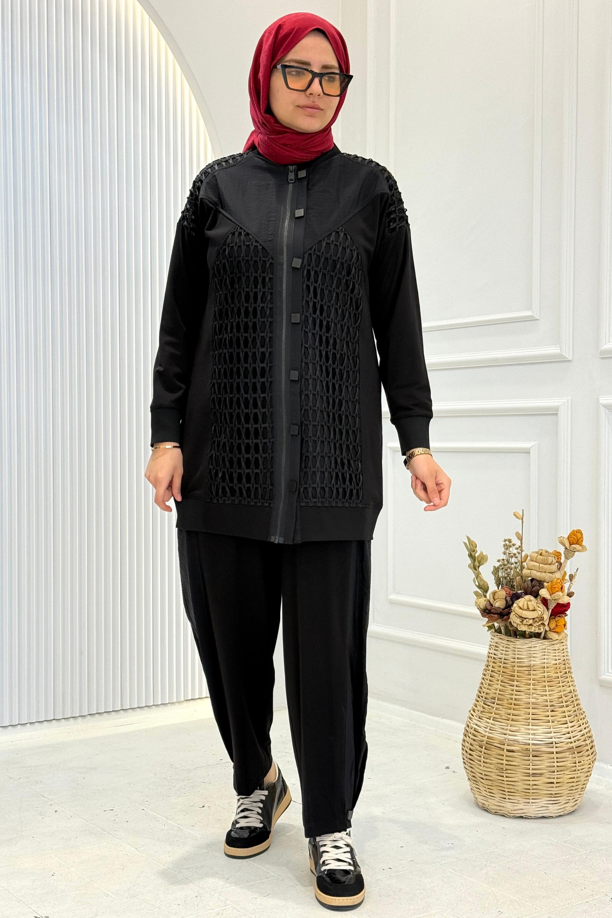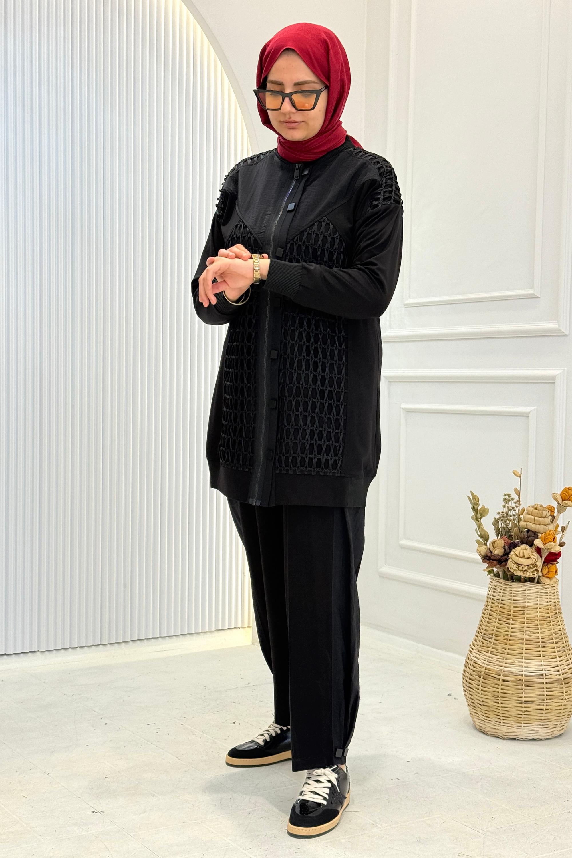 Ürün Detayları: Önden çıtçıtlı ürünümüz fermuar aksesuarlı olup file ve paraşüt kumaş ile kombinlenmiştir. Pantolon beli lastikli, paçası çıtçıt aksesuarlıdır.