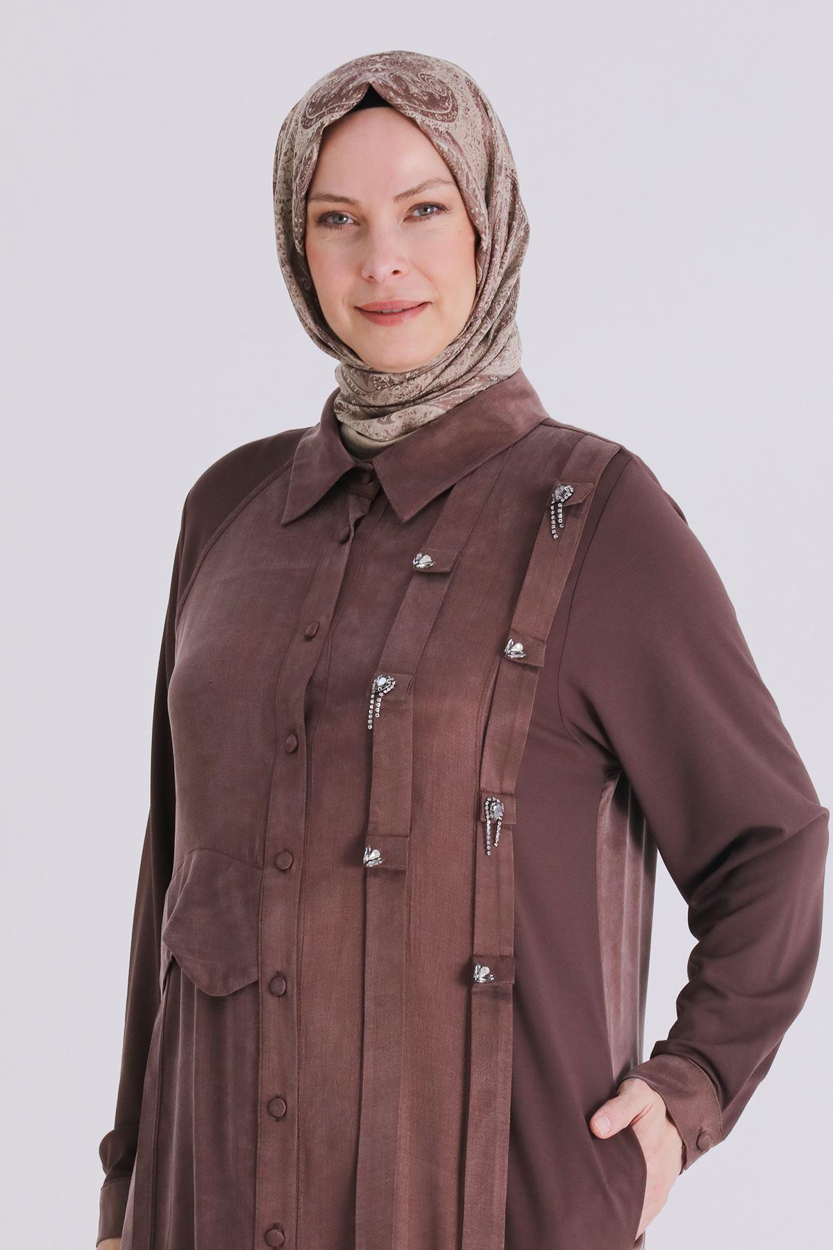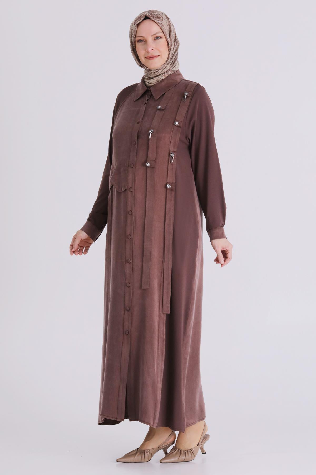 Behrem Büyük Beden Tesettür Taşlı Ferace Kahve OTW28080
