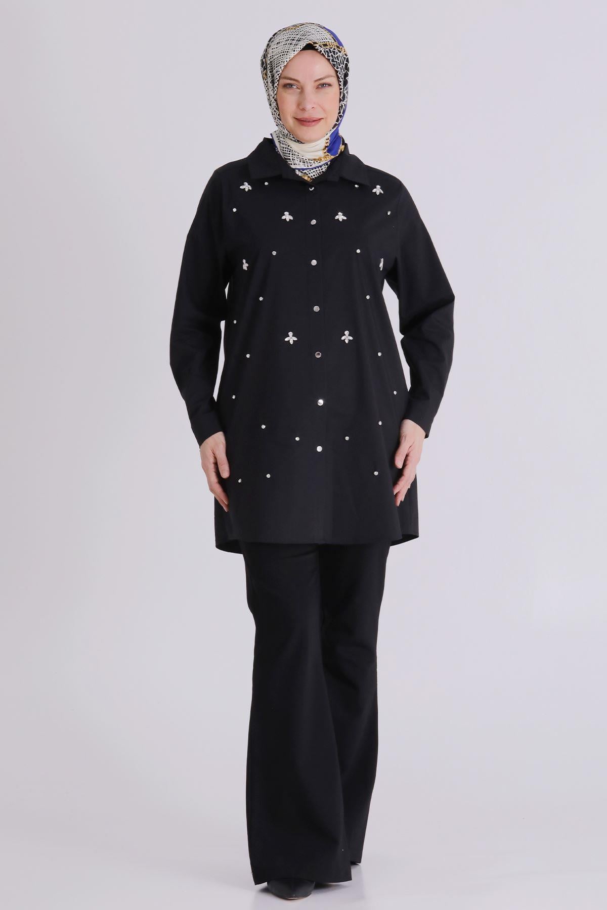 Ürün Detayları: Yakalı, önden düğmeli tuniğimiz taş işleme detaylıdır.