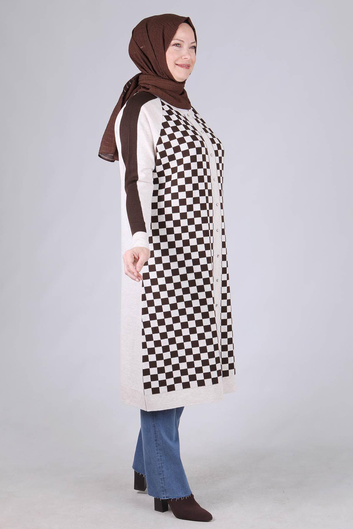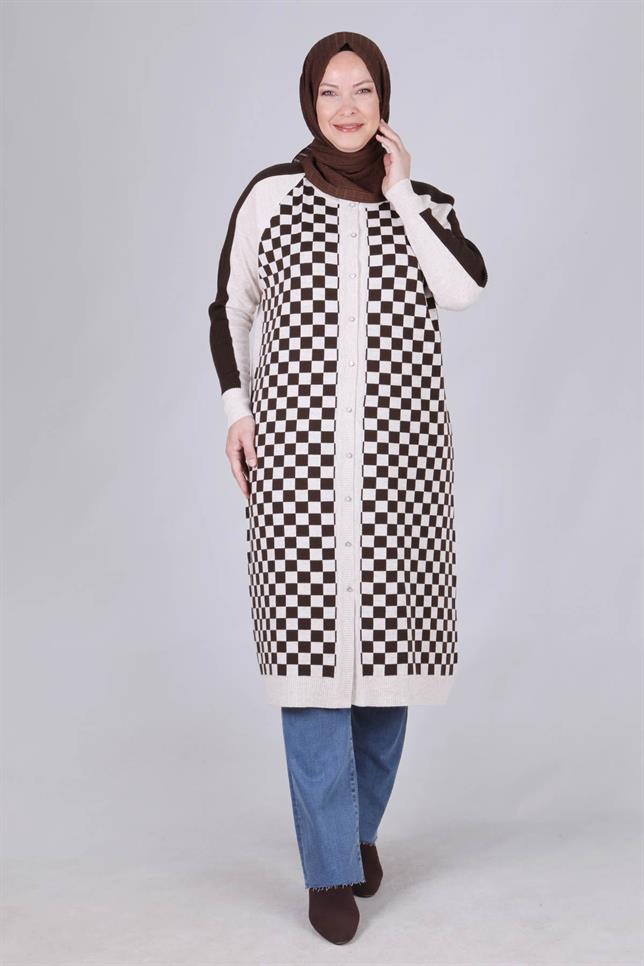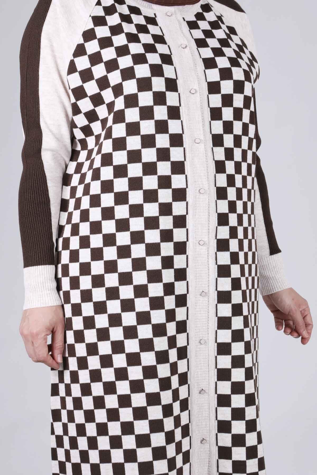 Ürün Detayları: Bisiklet yaka önden düğmeli triko ceket modelimiz dama desenlidir.