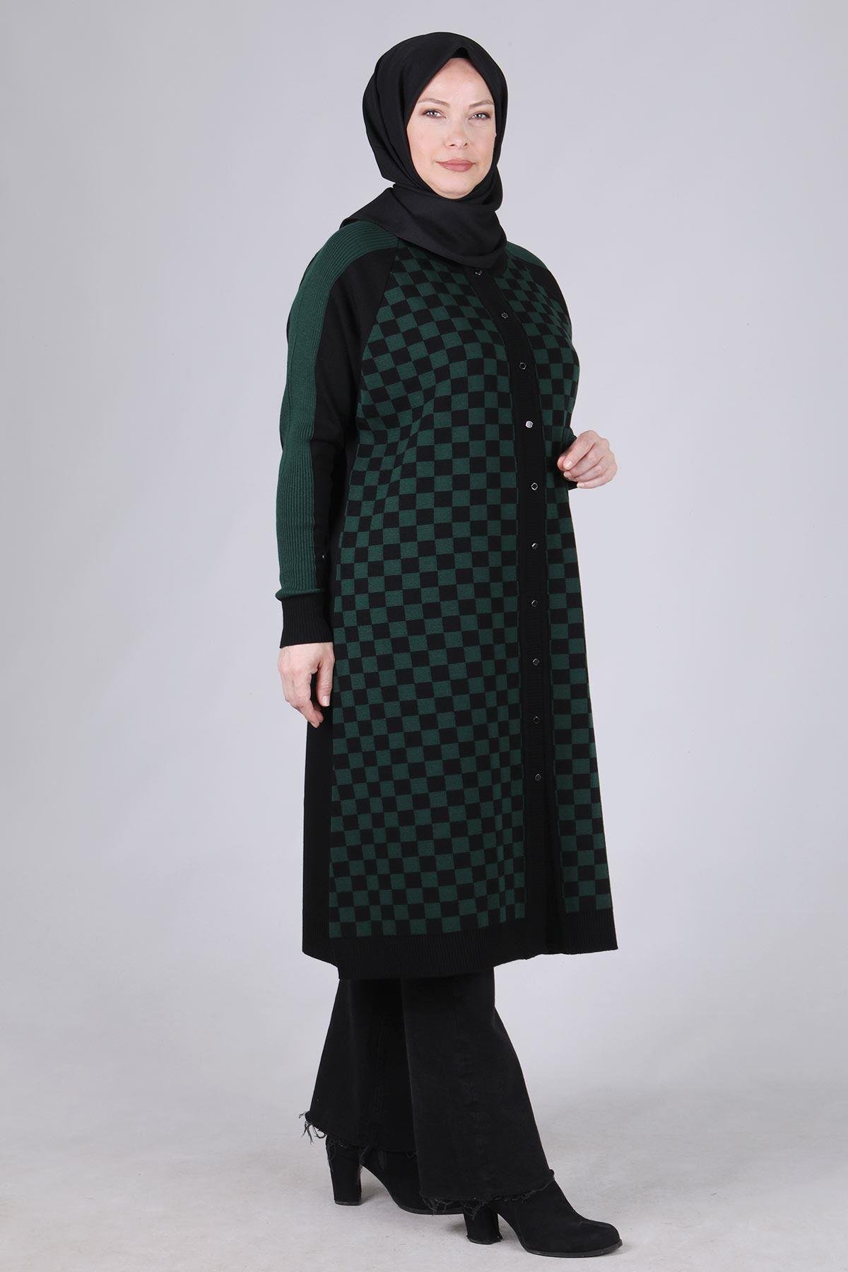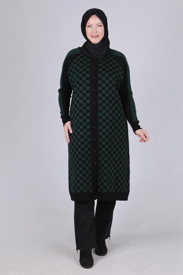 Ürün Detayları: Bisiklet yaka önden düğmeli triko ceket modelimiz dama desenlidir.