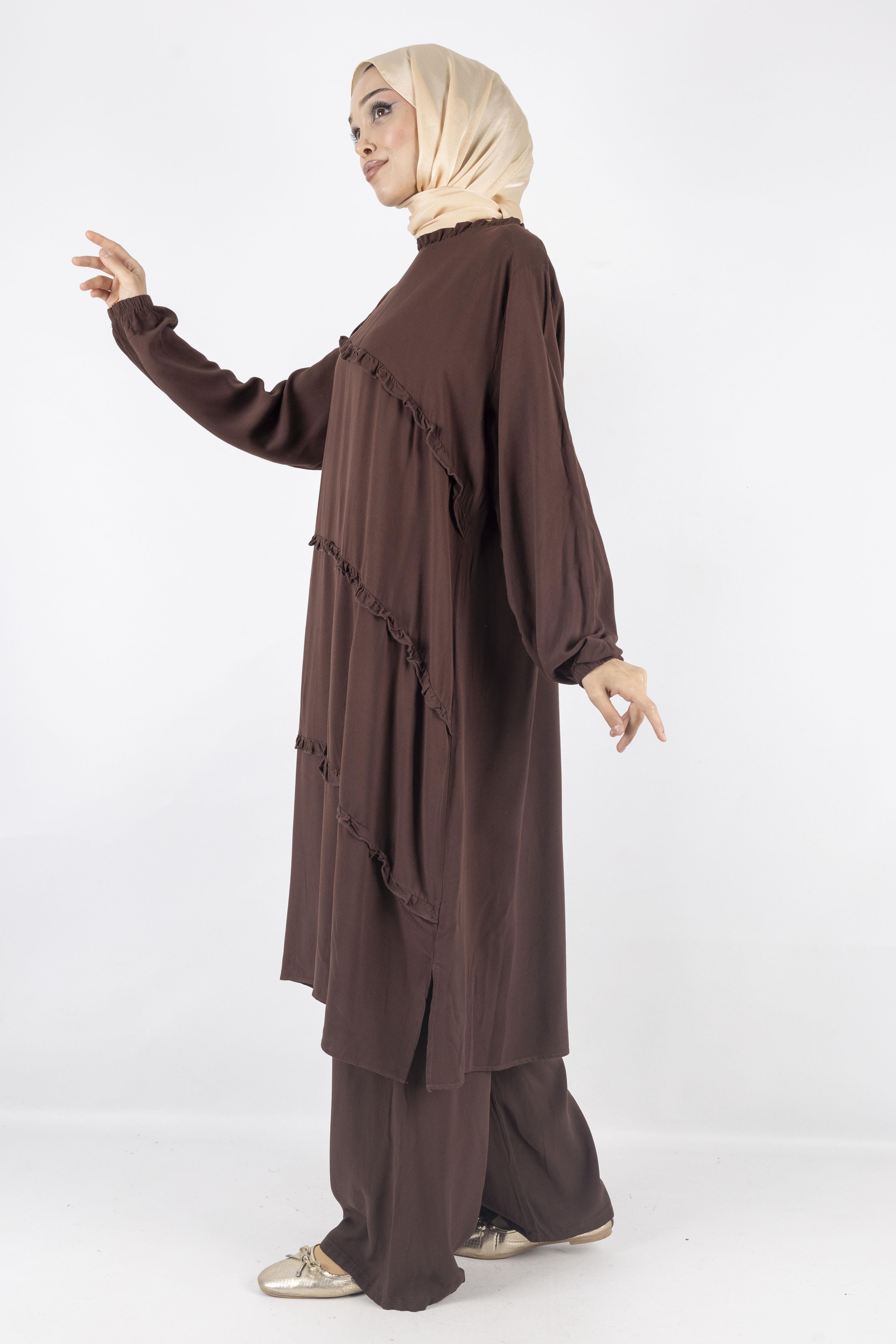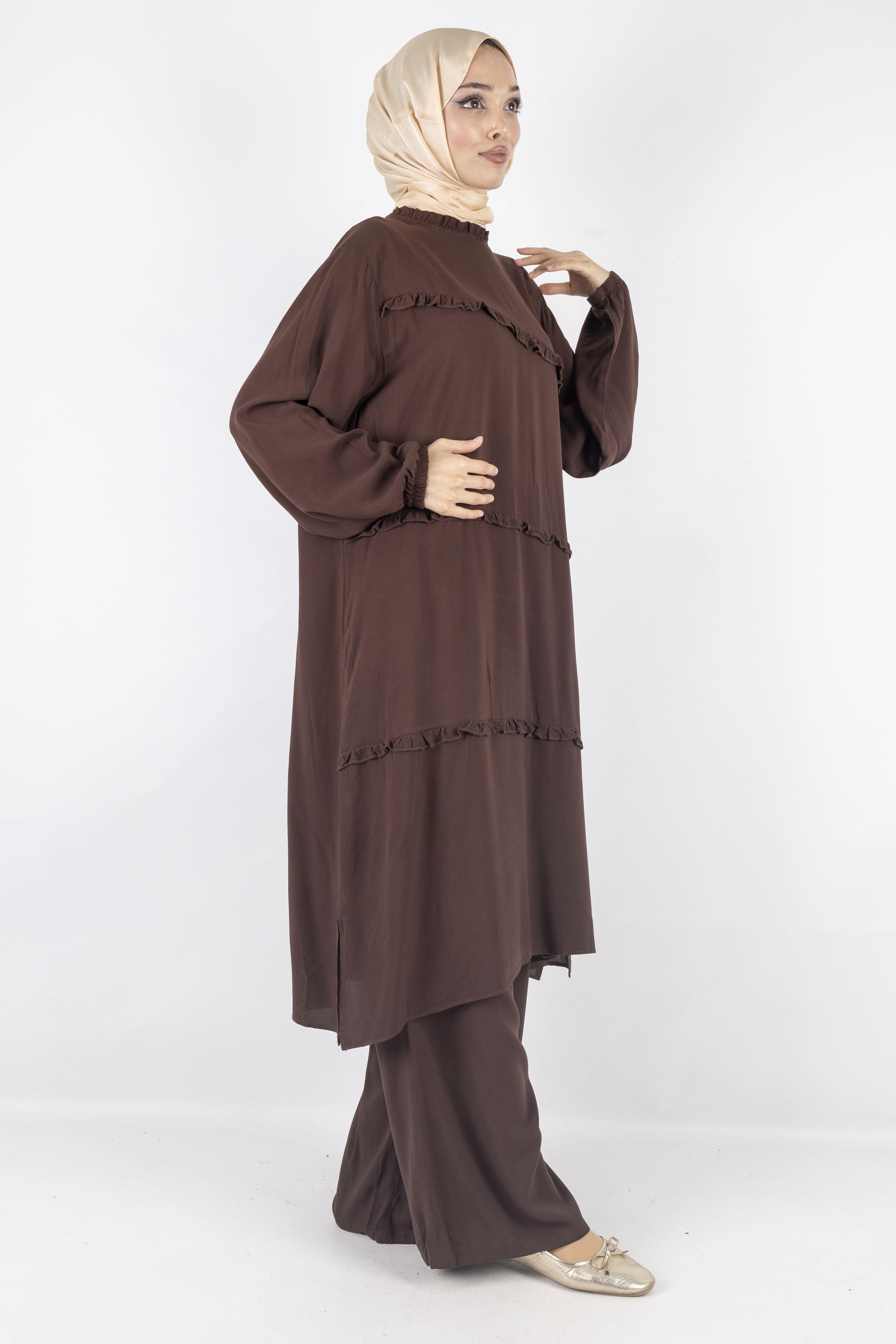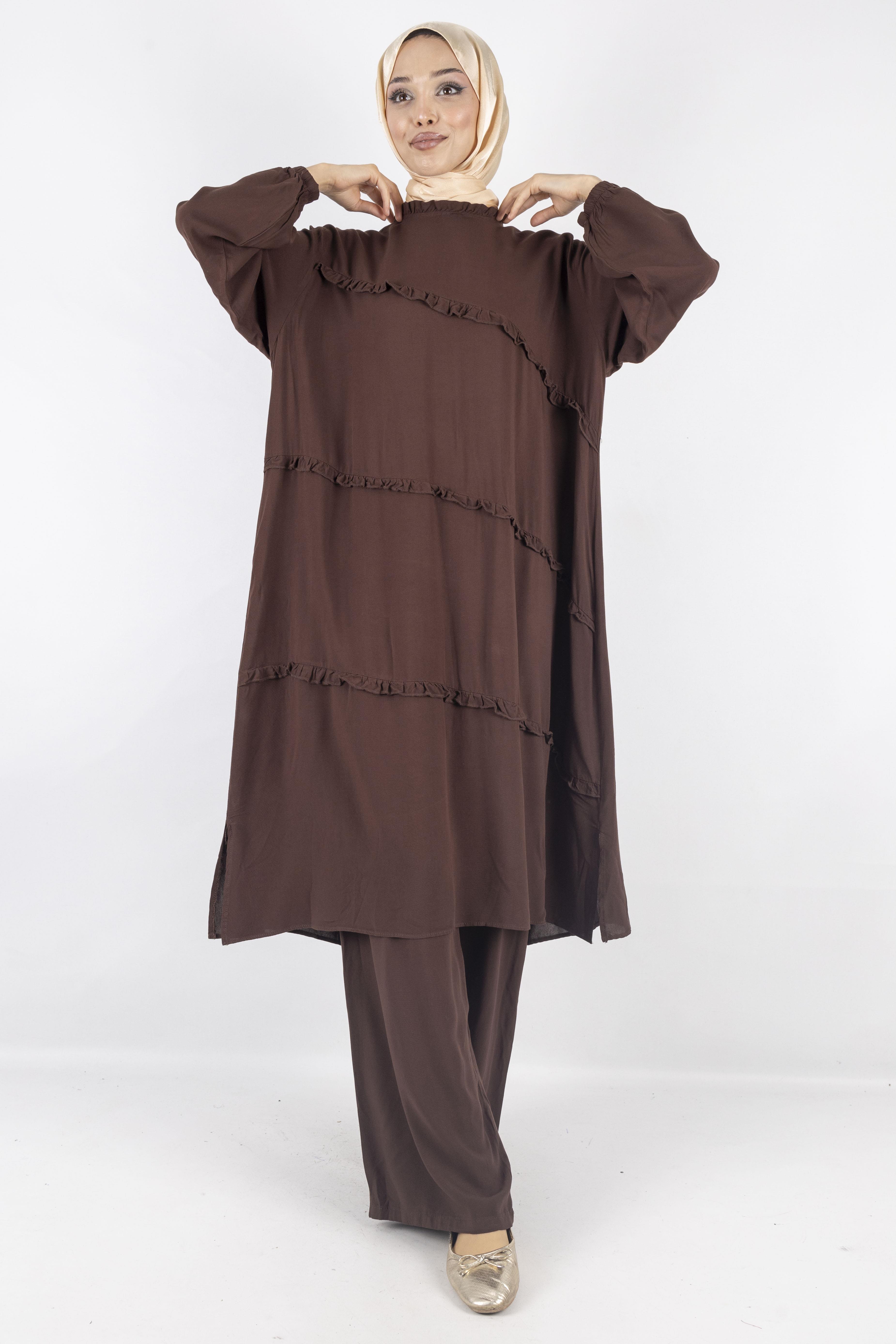 Rahatlığı ve şıklığı bir araya getiren fırfır detaylı kahverengi ikili takım, 38-52 beden aralığında geniş kalıp seçeneğiyle konforlu bir kullanım sunar. Uzun ve dökümlü tuniği zarif fırfır detaylarıyla modern bir hava katarken, bol paça pantolonu gün boyu rahatlık sağlar. Günlük kombinlerden özel davetlere kadar her ortamda tercih edilebilecek zamansız bir modeldir.