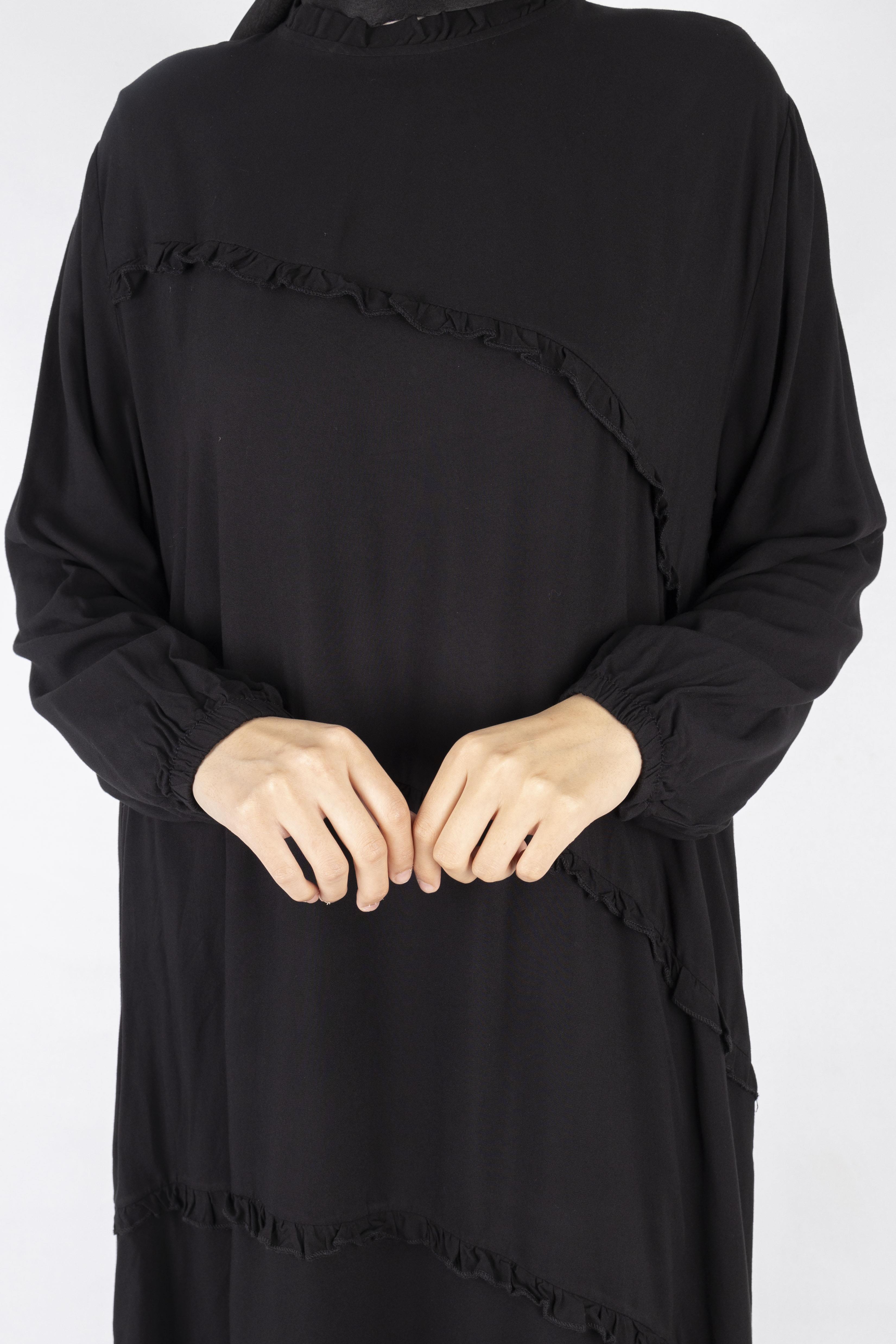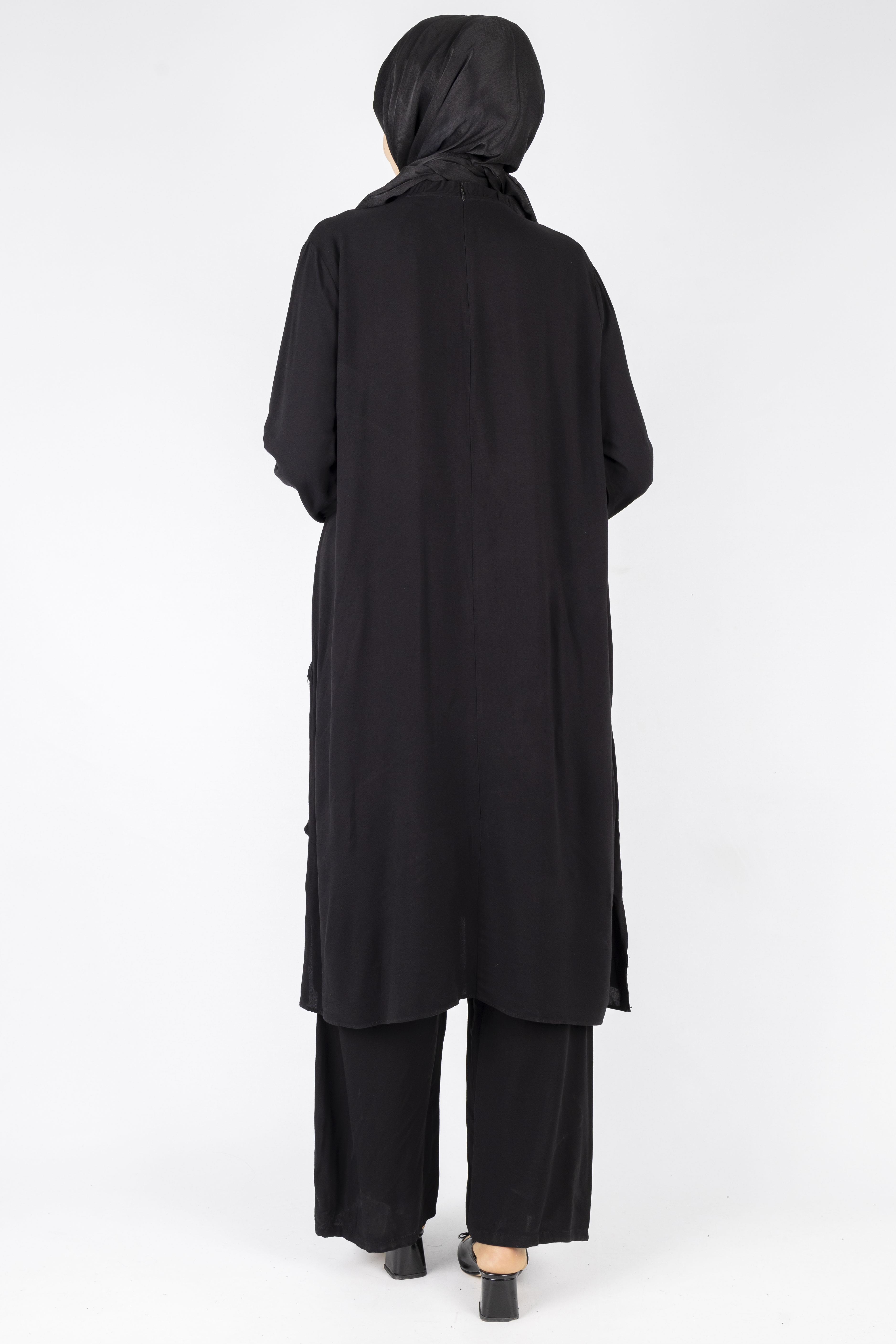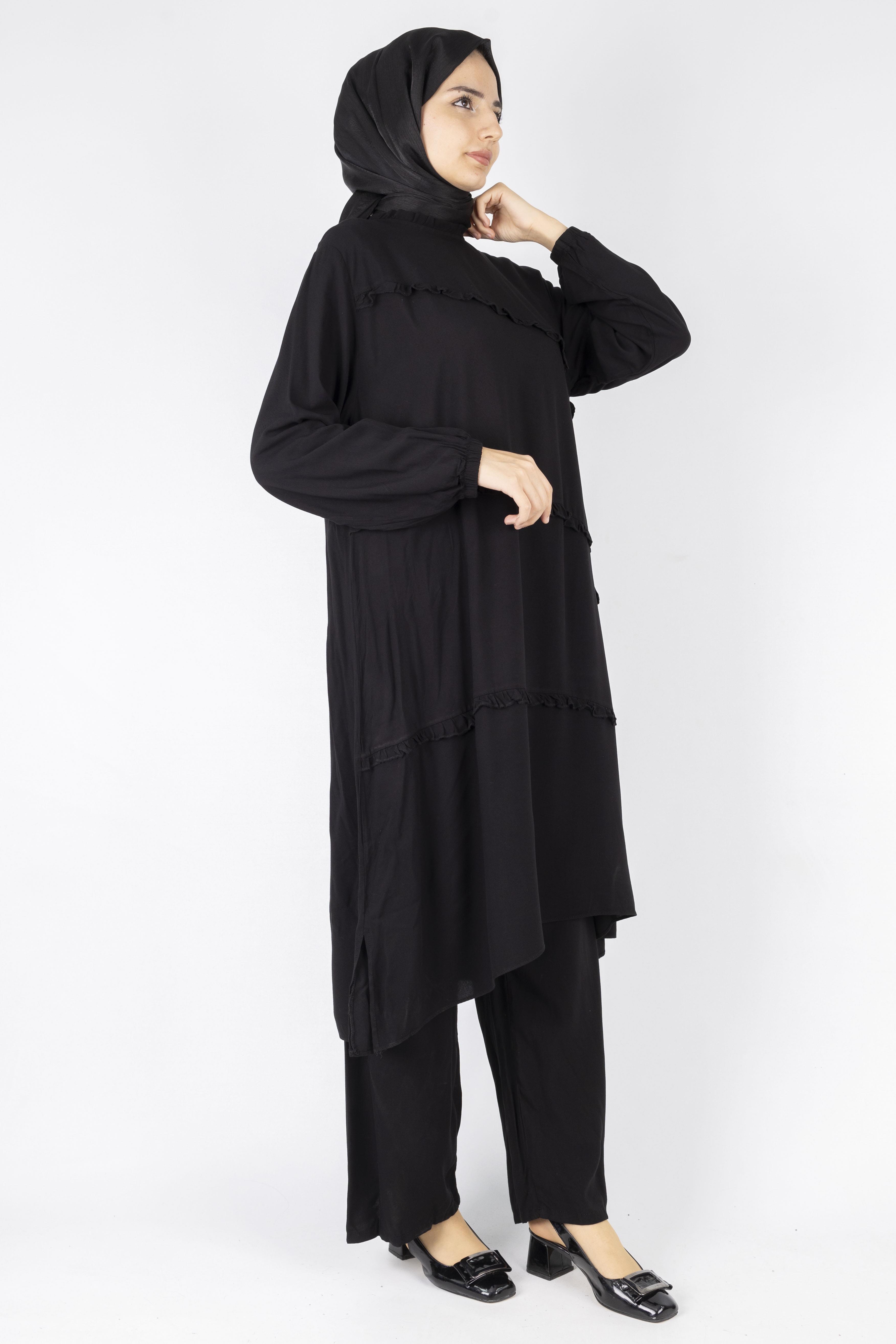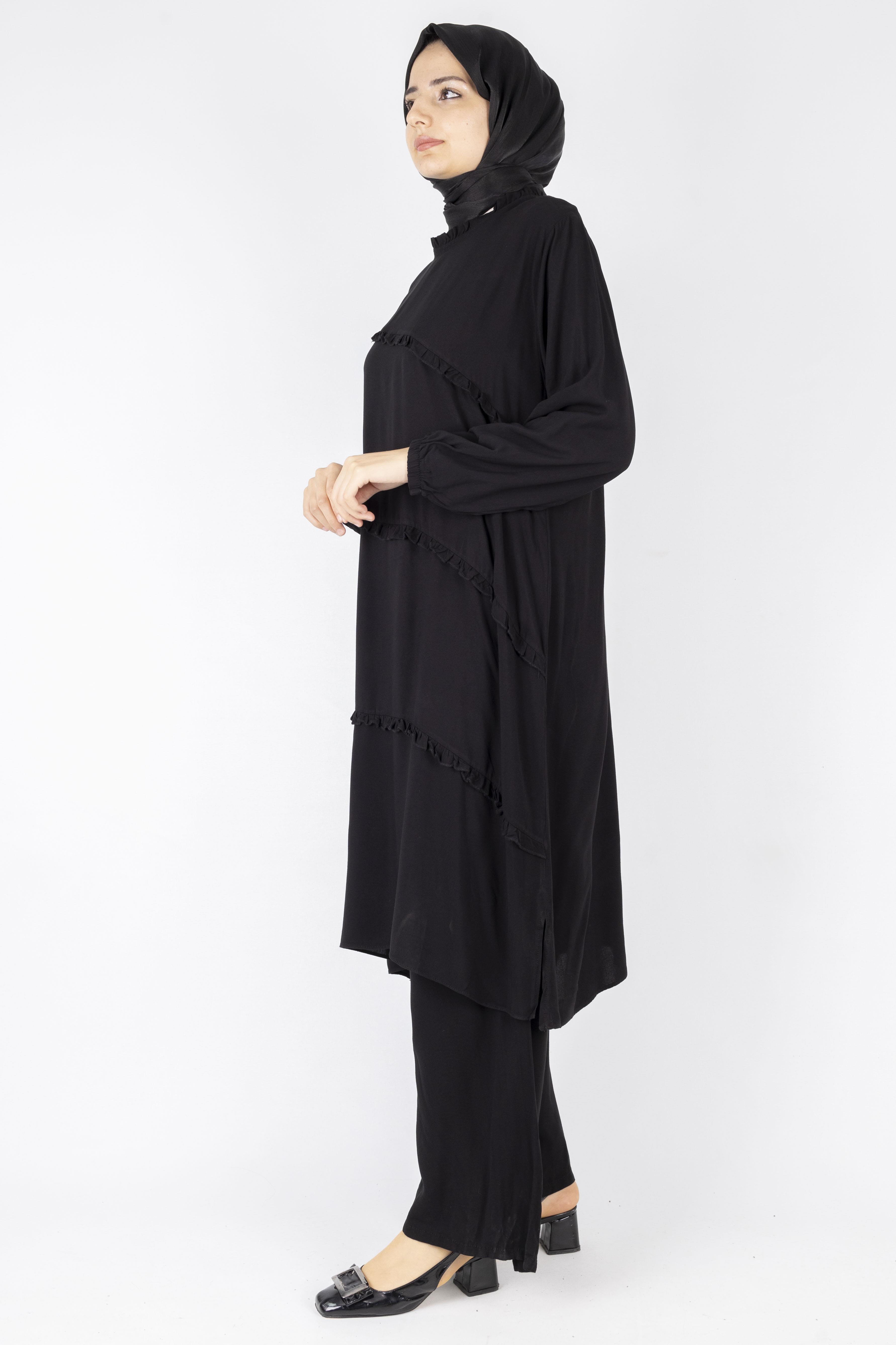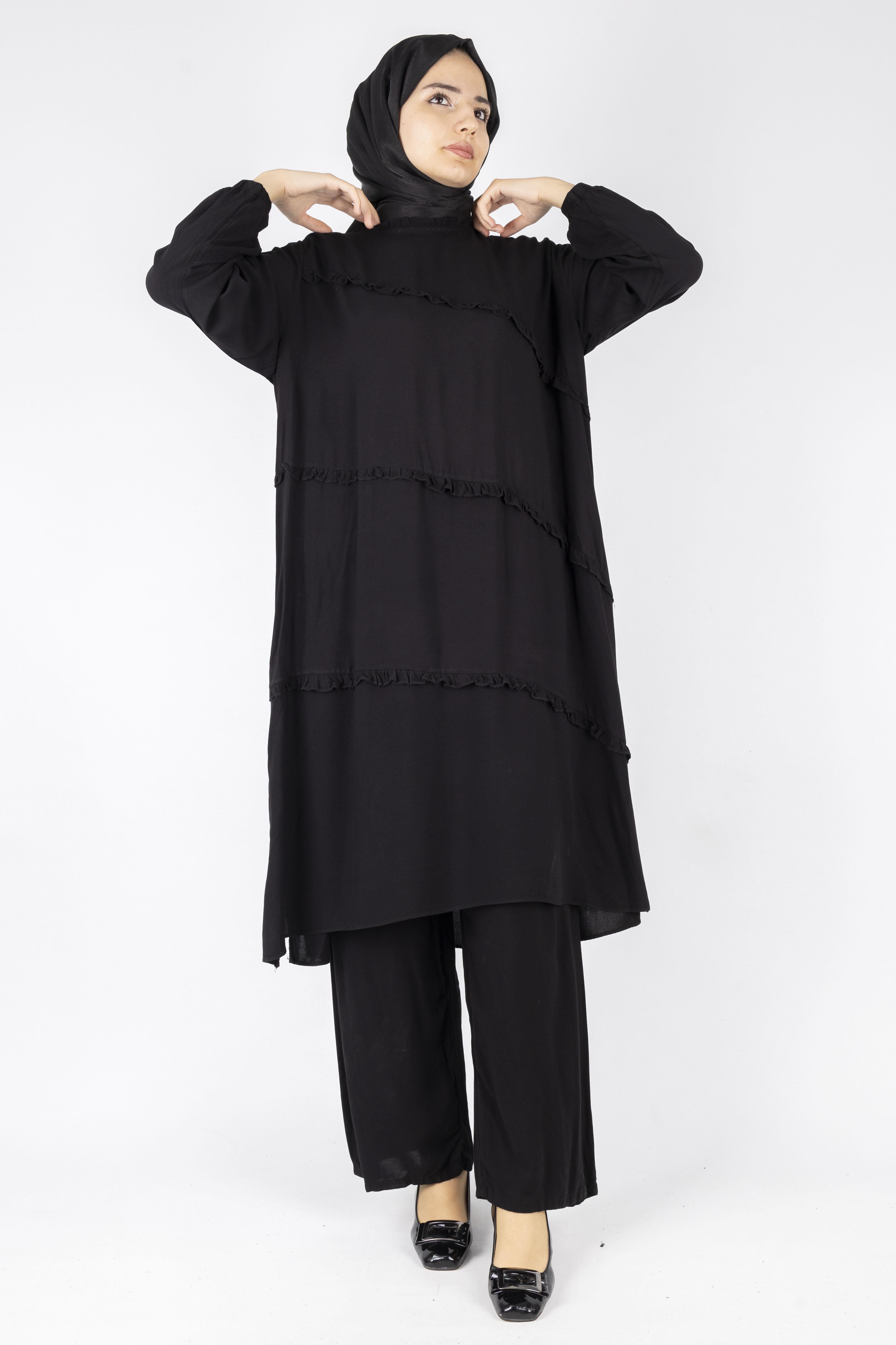 Rahatlığı ve şıklığı bir araya getiren fırfır detaylı kahverengi ikili takım, 38-52 beden aralığında geniş kalıp seçeneğiyle konforlu bir kullanım sunar. Uzun ve dökümlü tuniği zarif fırfır detaylarıyla modern bir hava katarken, bol paça pantolonu gün boyu rahatlık sağlar. Günlük kombinlerden özel davetlere kadar her ortamda tercih edilebilecek zamansız bir modeldir.