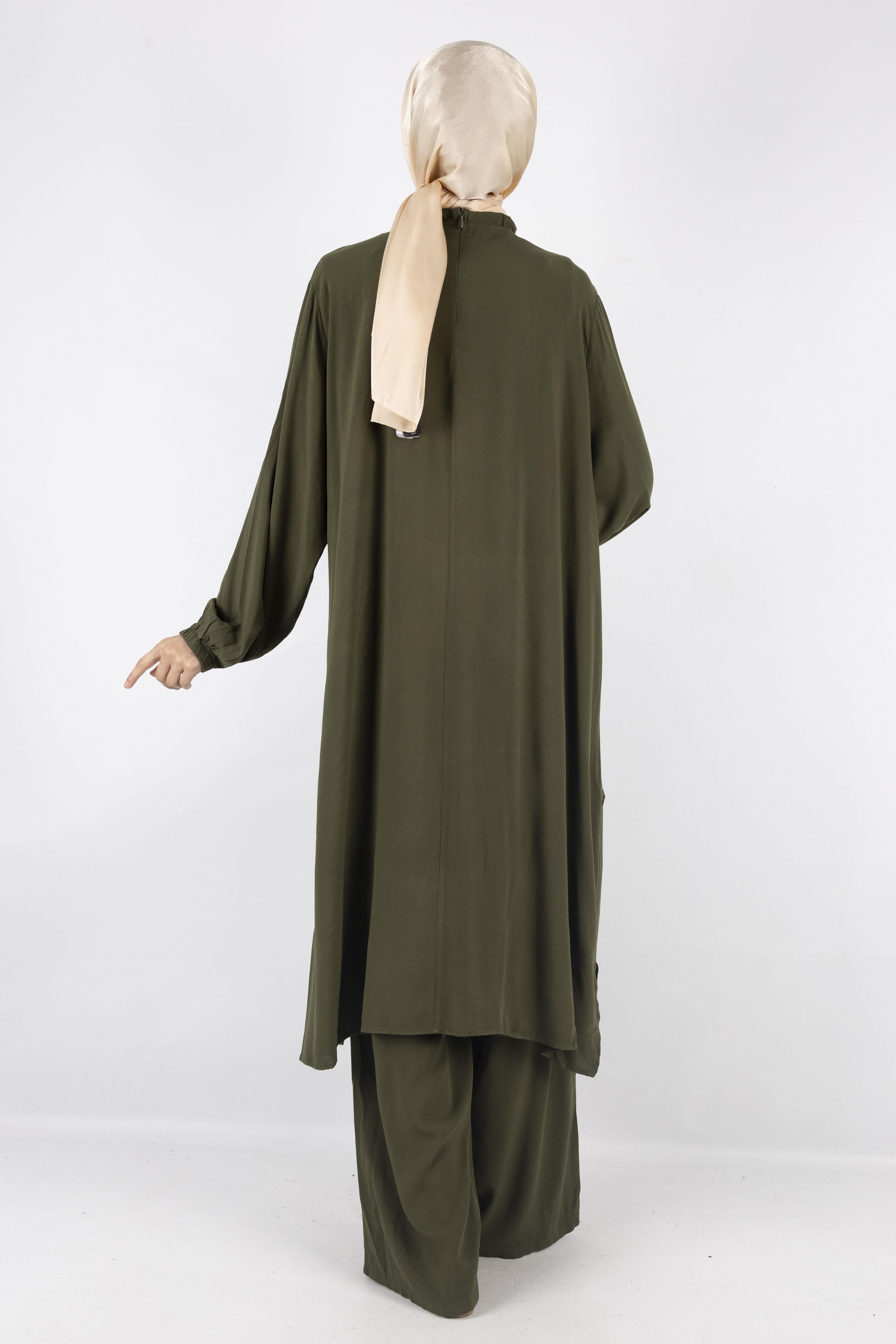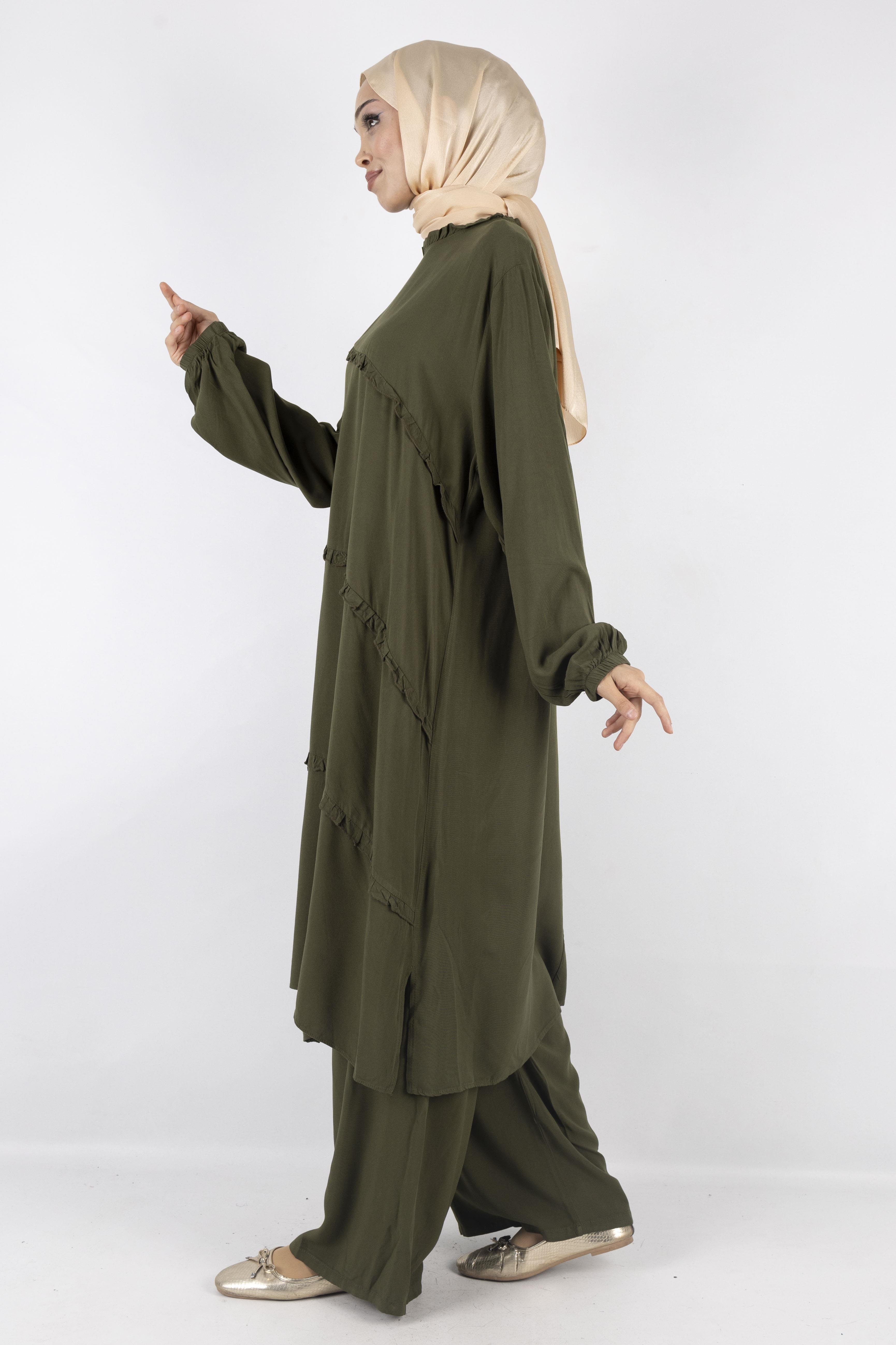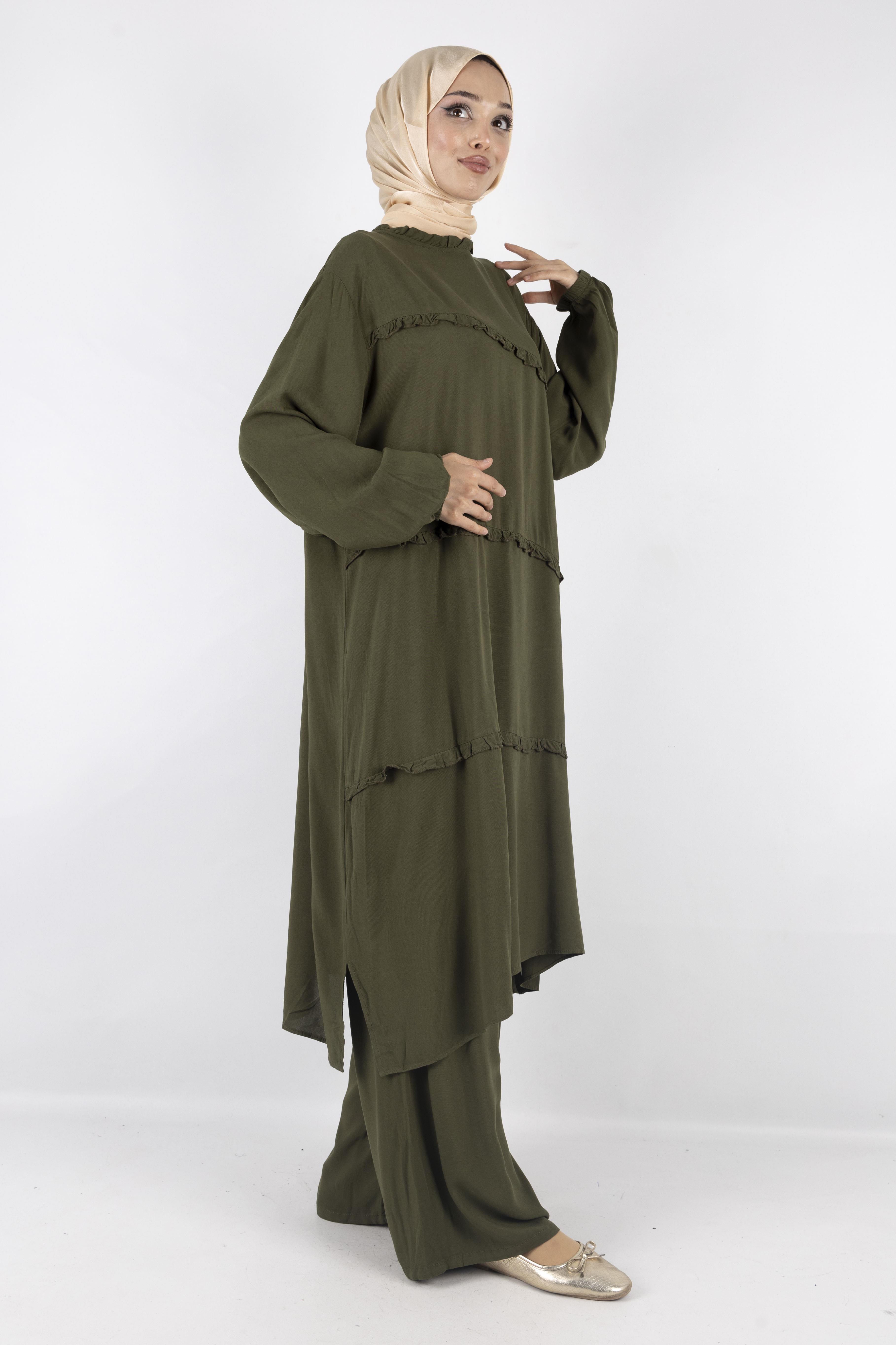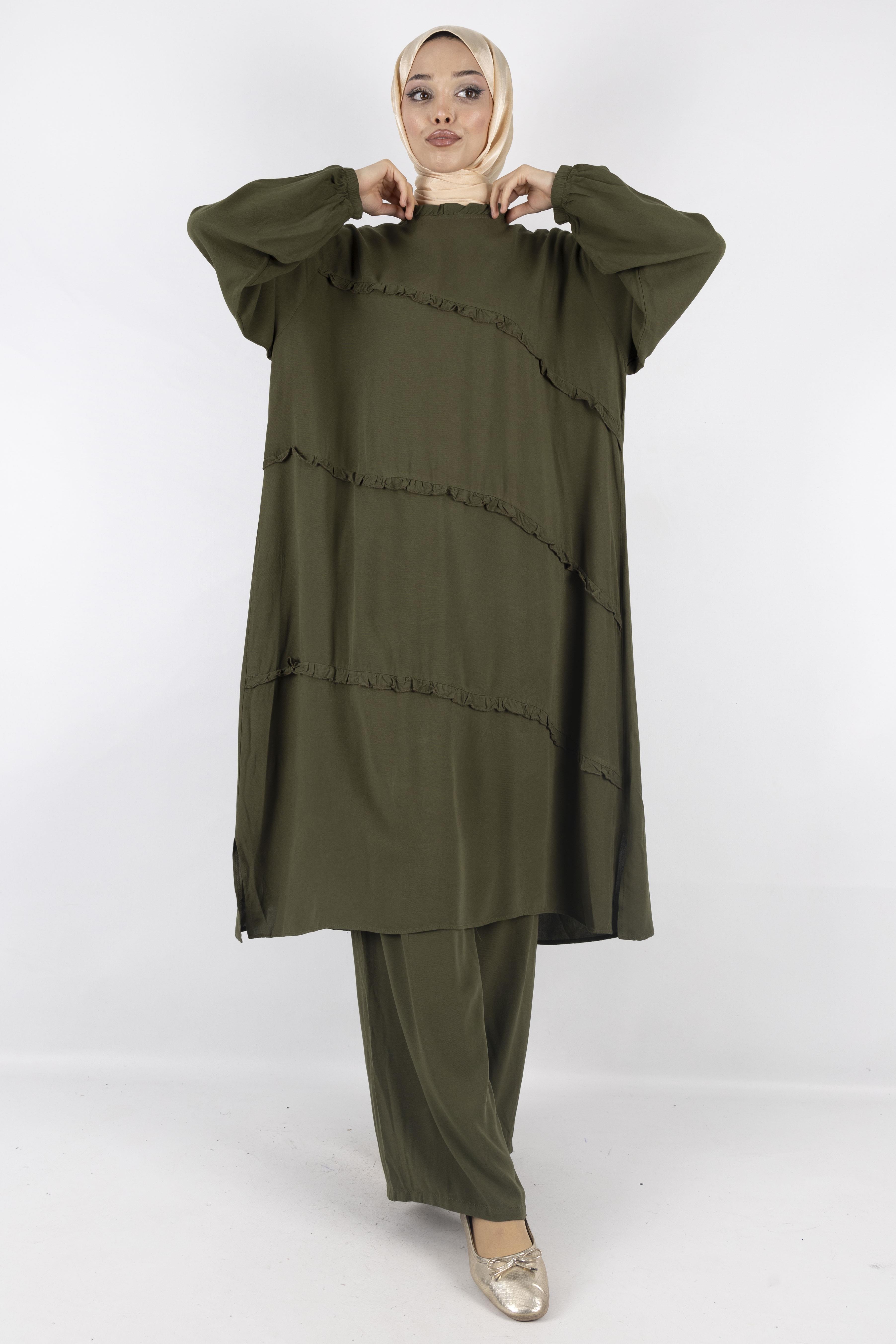 Rahatlığı ve şıklığı bir araya getiren fırfır detaylı kahverengi ikili takım, 38-52 beden aralığında geniş kalıp seçeneğiyle konforlu bir kullanım sunar. Uzun ve dökümlü tuniği zarif fırfır detaylarıyla modern bir hava katarken, bol paça pantolonu gün boyu rahatlık sağlar. Günlük kombinlerden özel davetlere kadar her ortamda tercih edilebilecek zamansız bir modeldir.