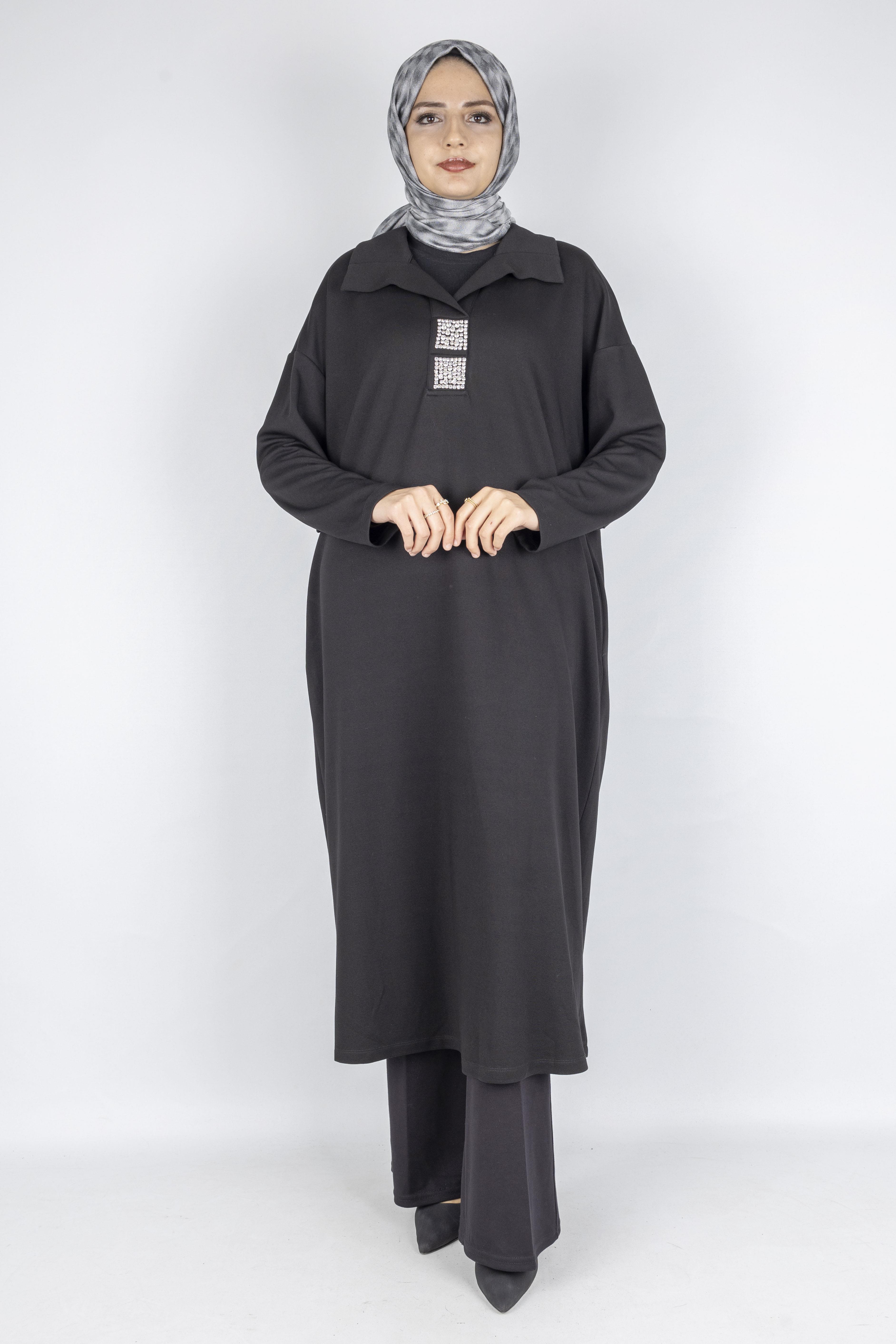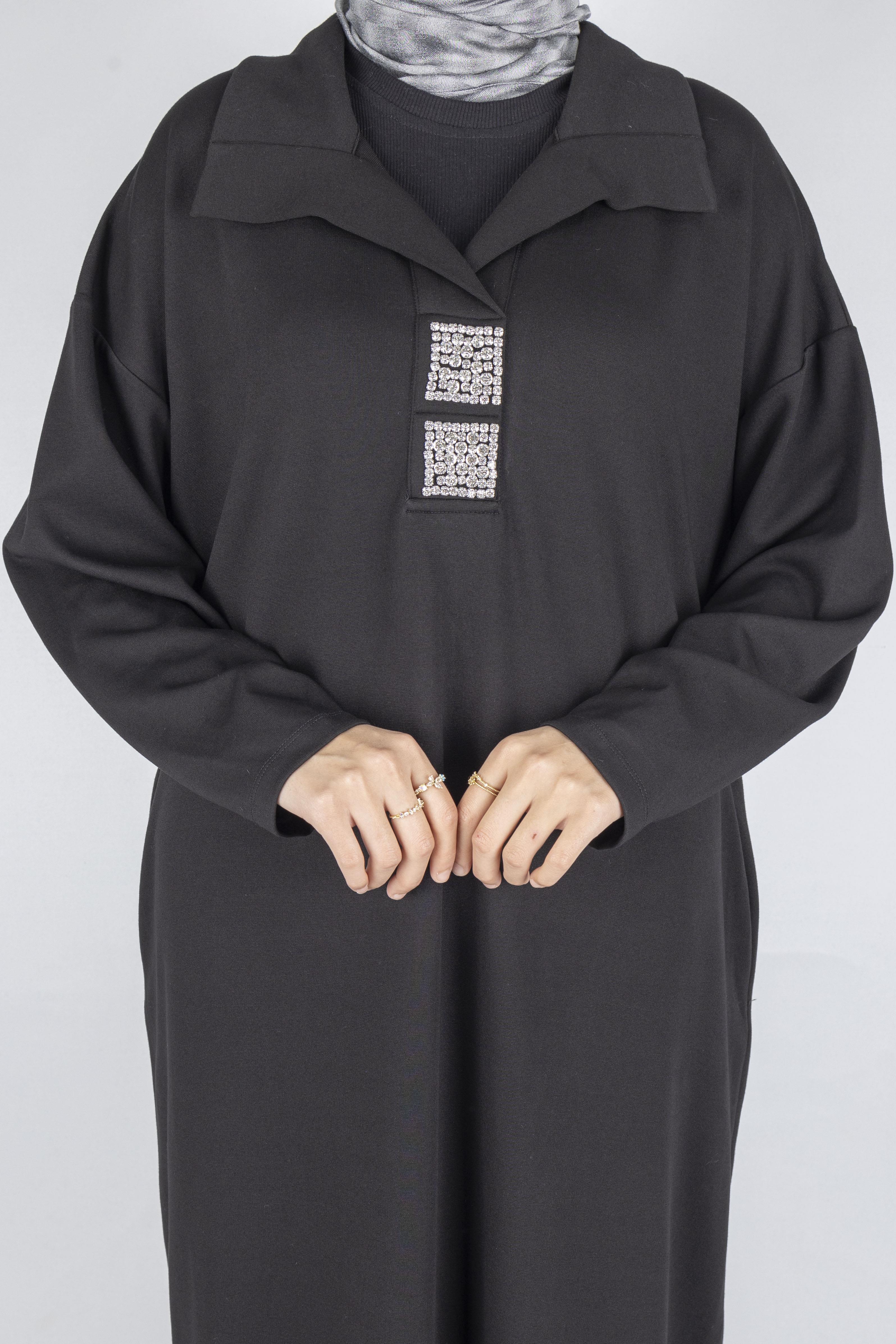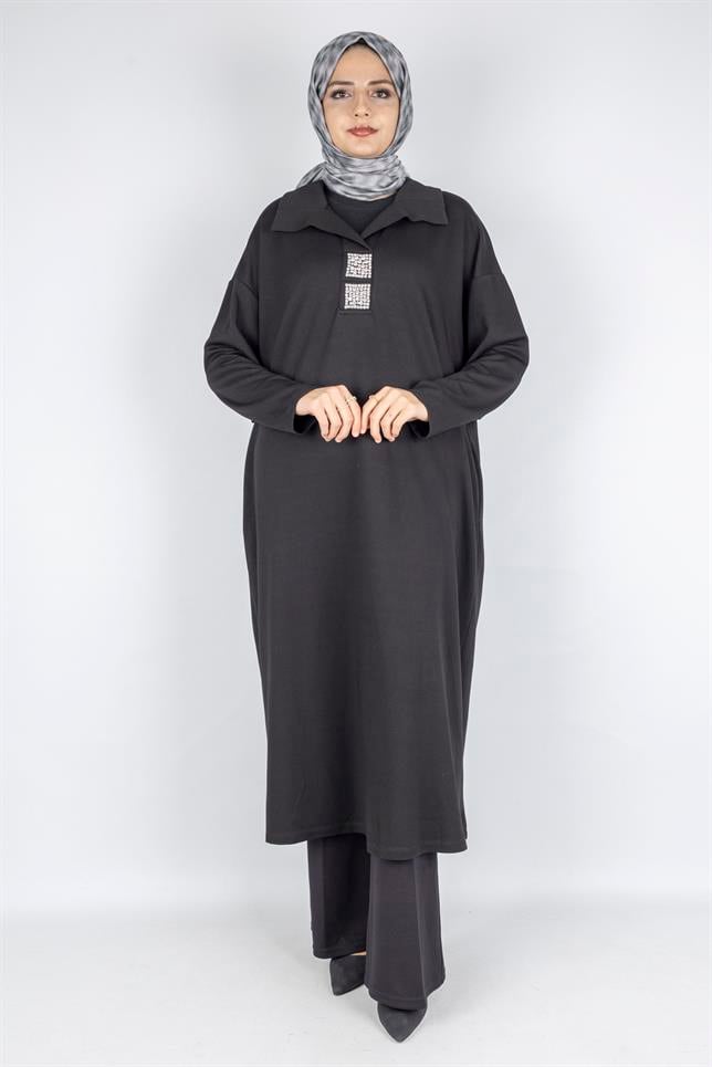 Çelik Örme Büyük Beden Taş Detaylı Elbise Siyah OTW7804
