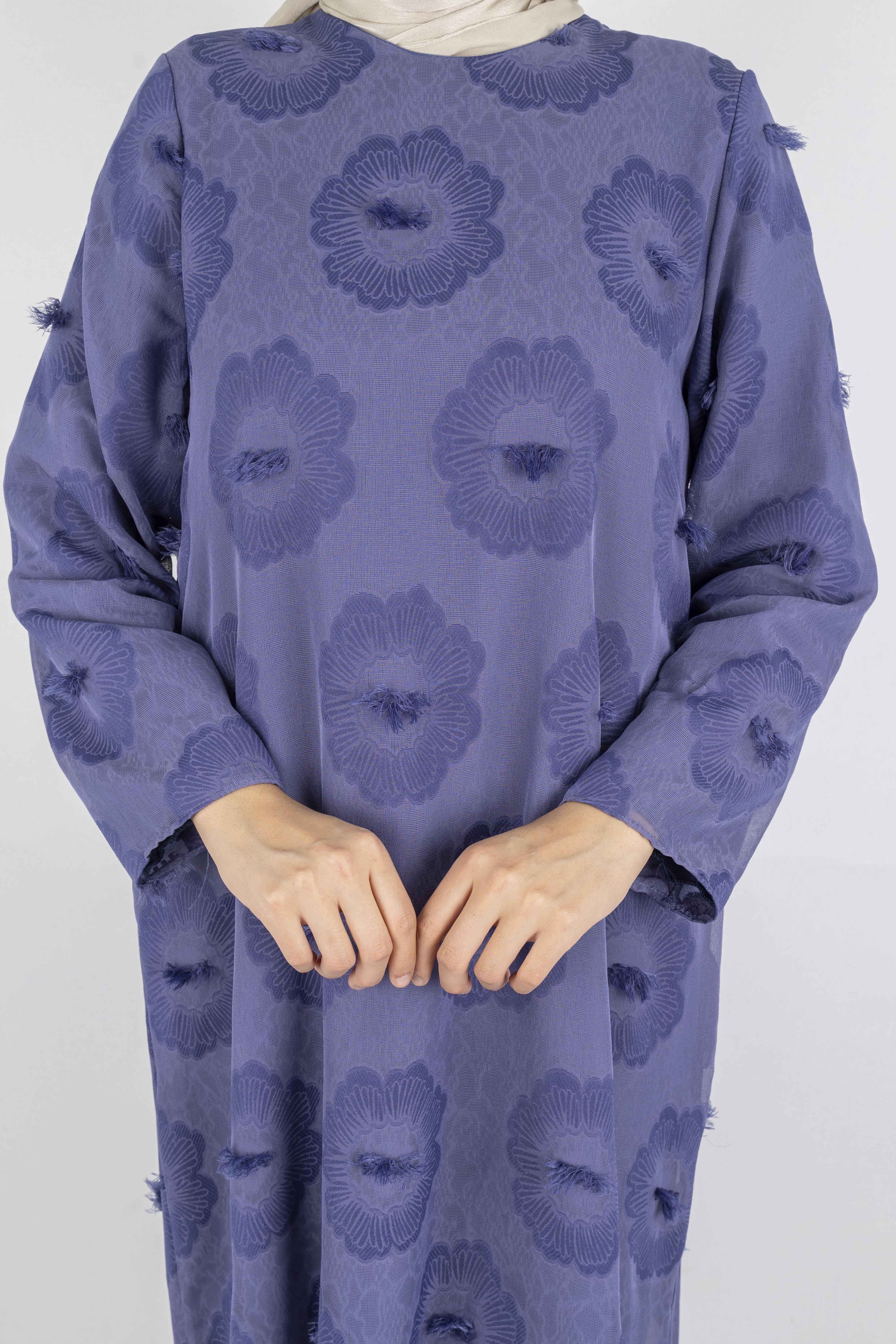 Dule Astarlı Çiçek Desenli Pliseli Tesettür Elbise İndigo OTW936