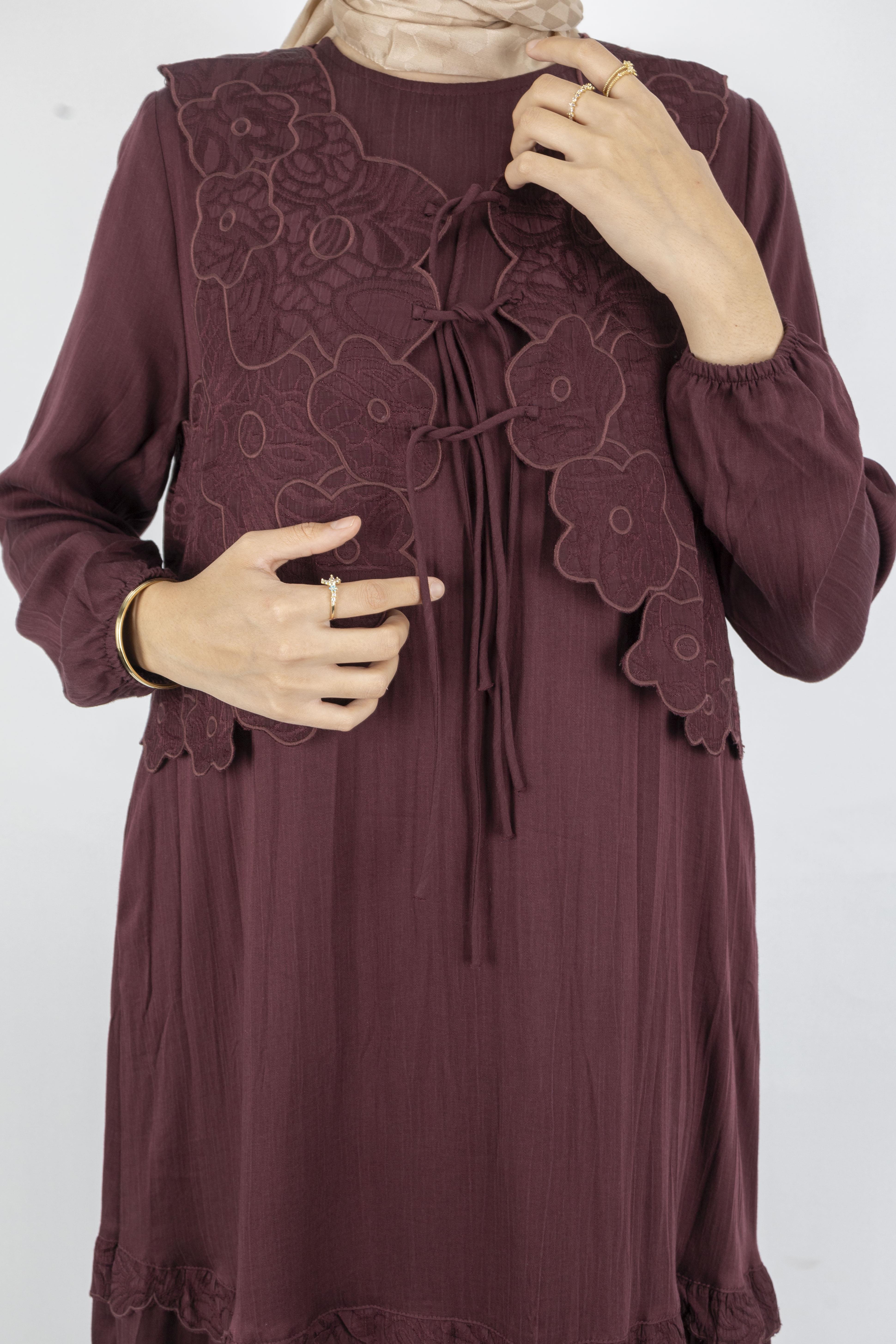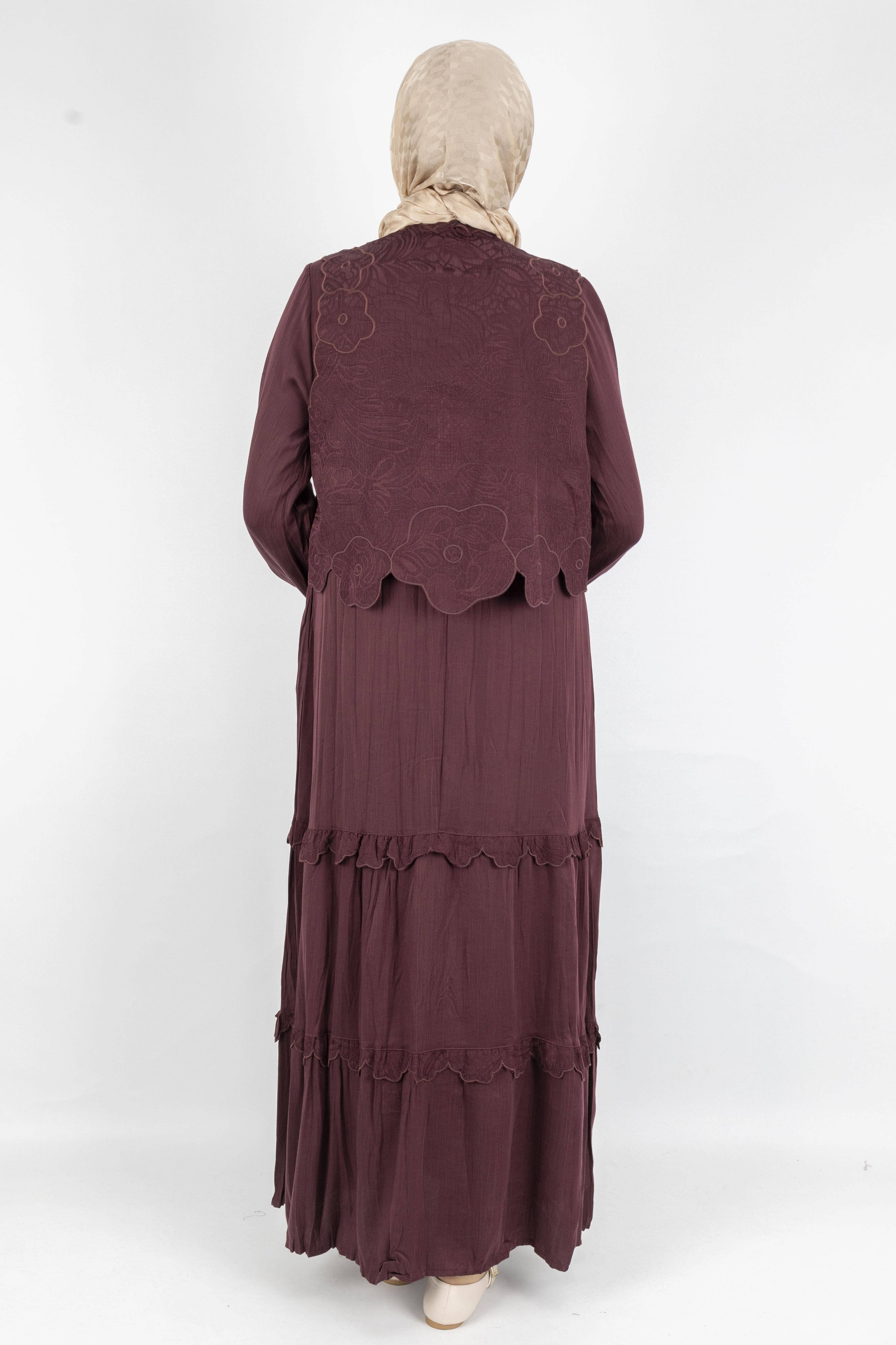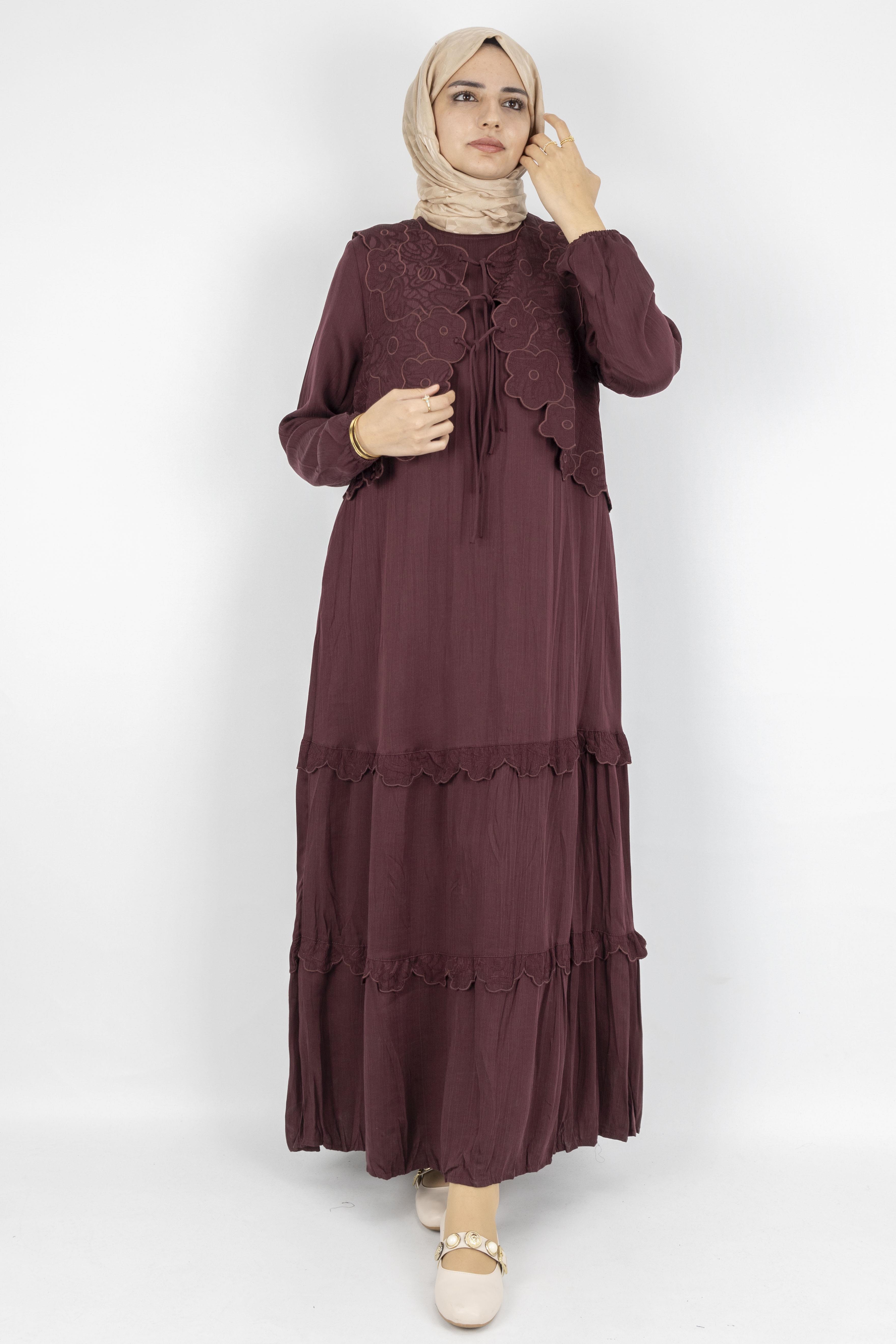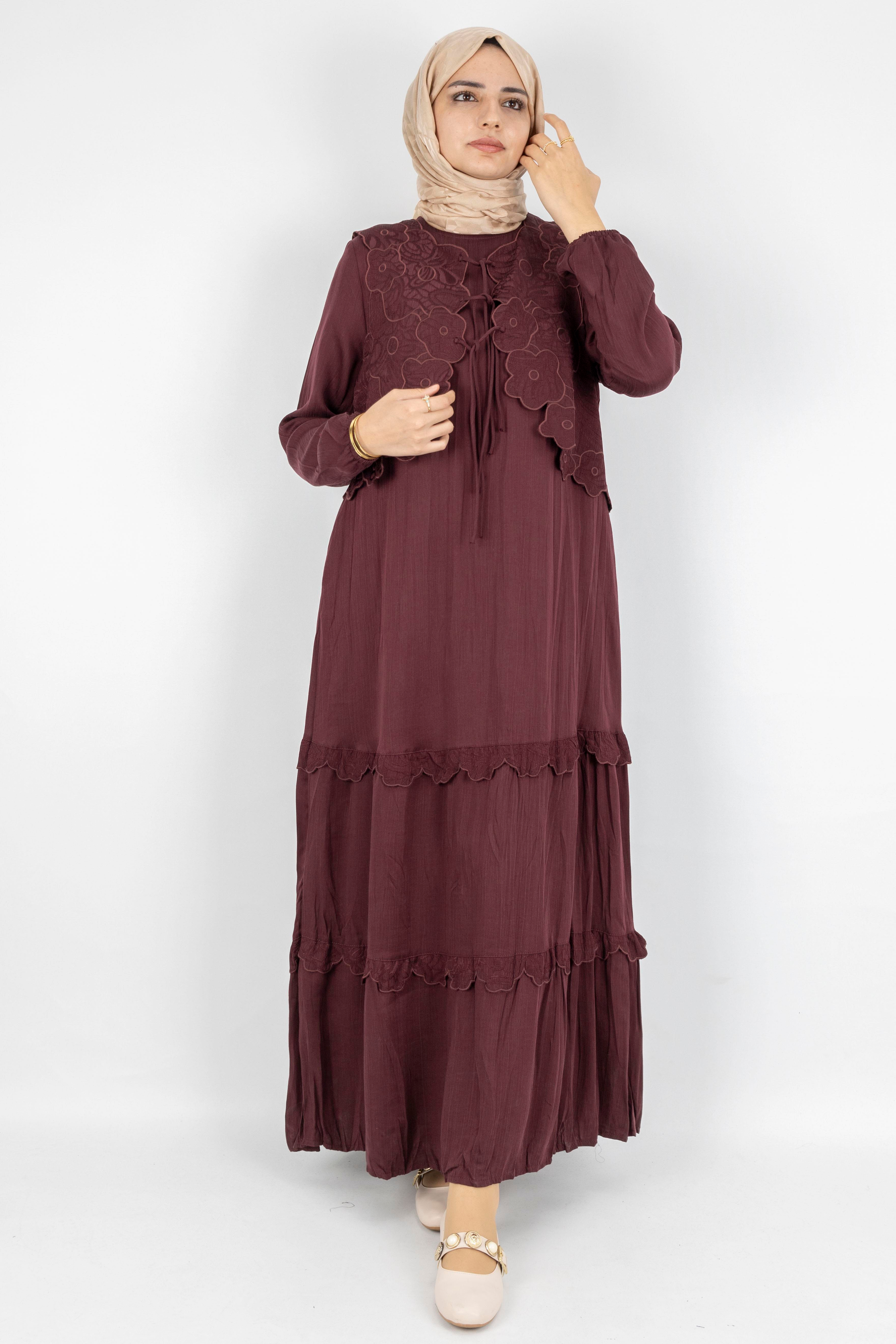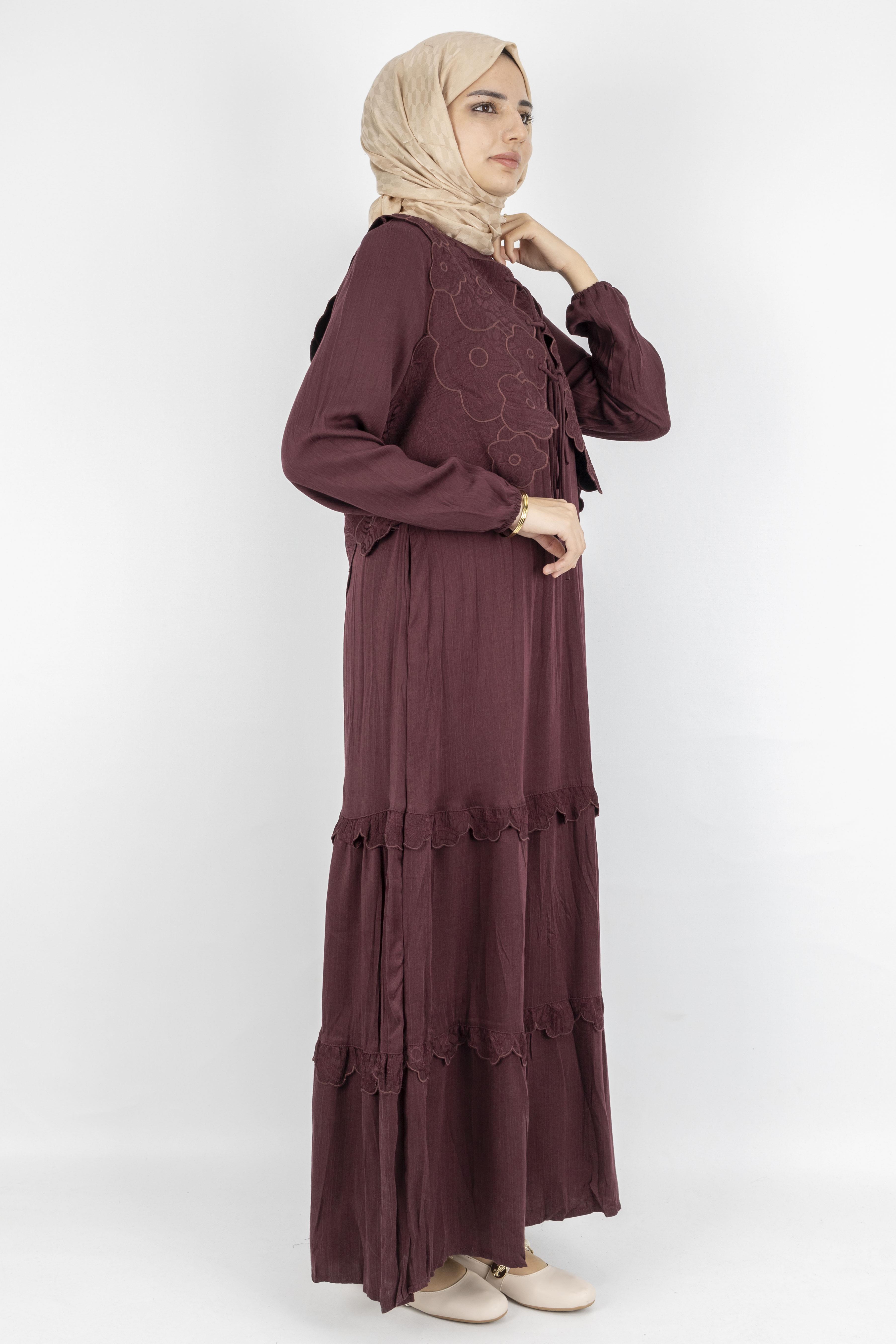 Çiçek Güpür Yelekli Uzun Tesettür Elbise Bordo OTW6047