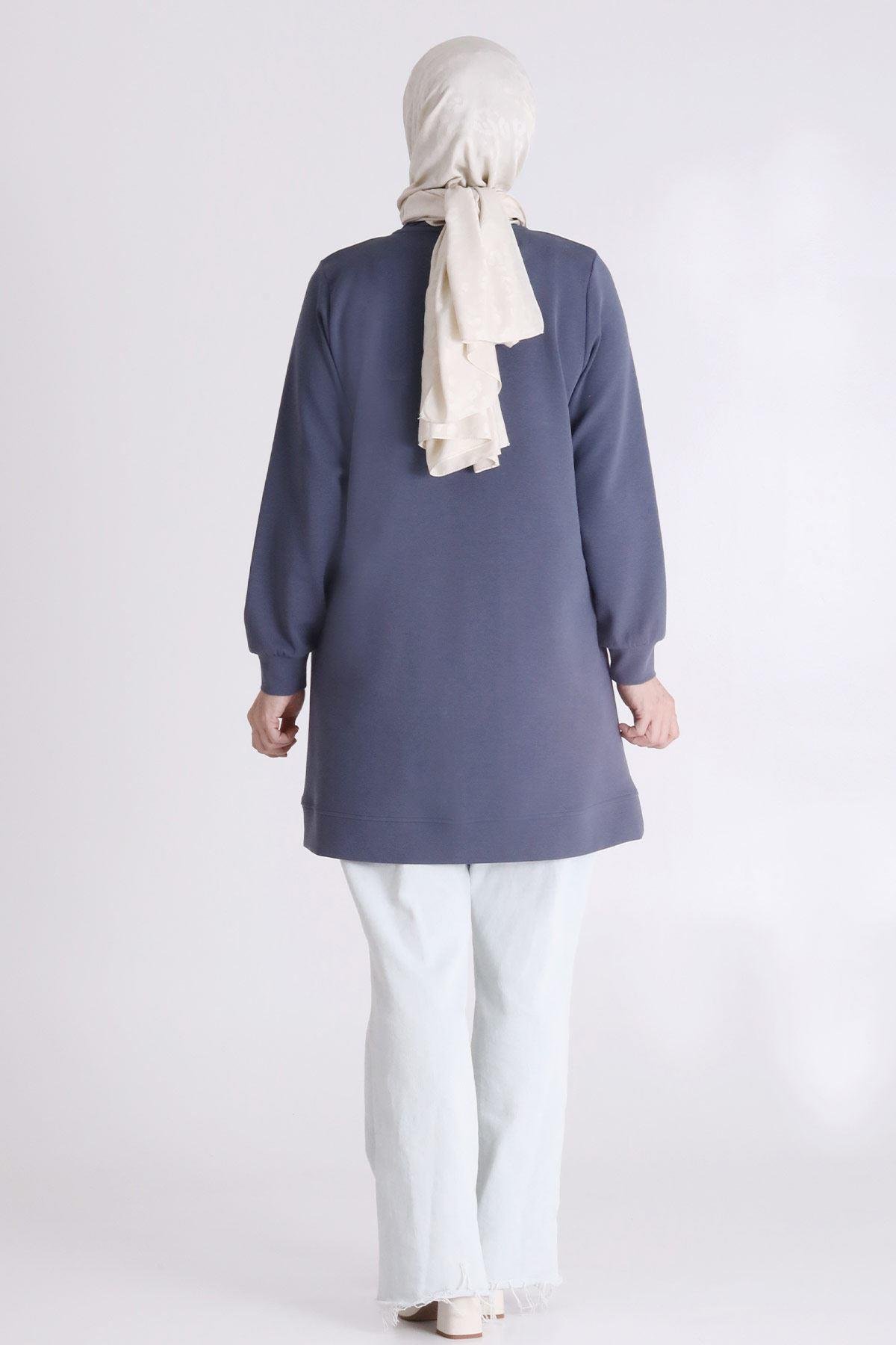 Çiçek İşlemeli Rahat Kesim Büyük Beden Tunik Duman Mavi OTW20126