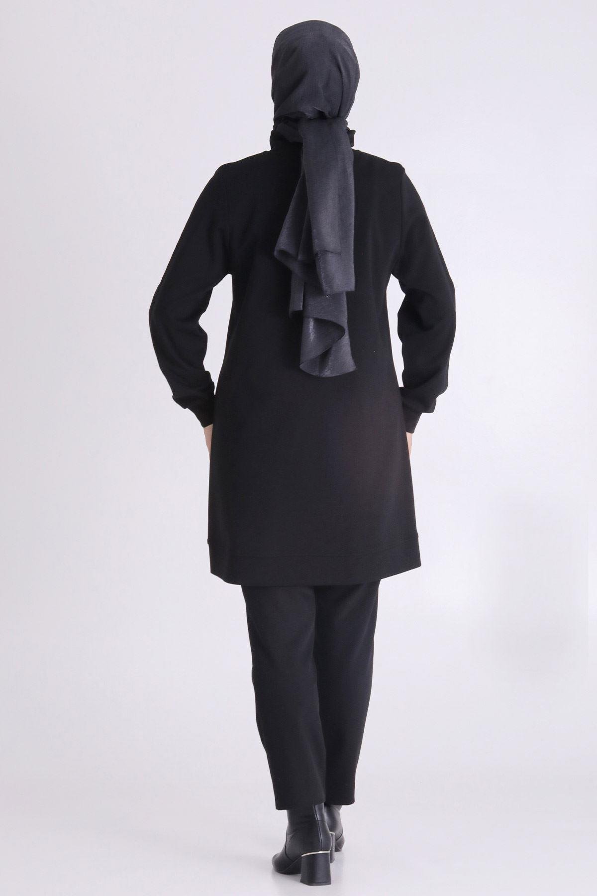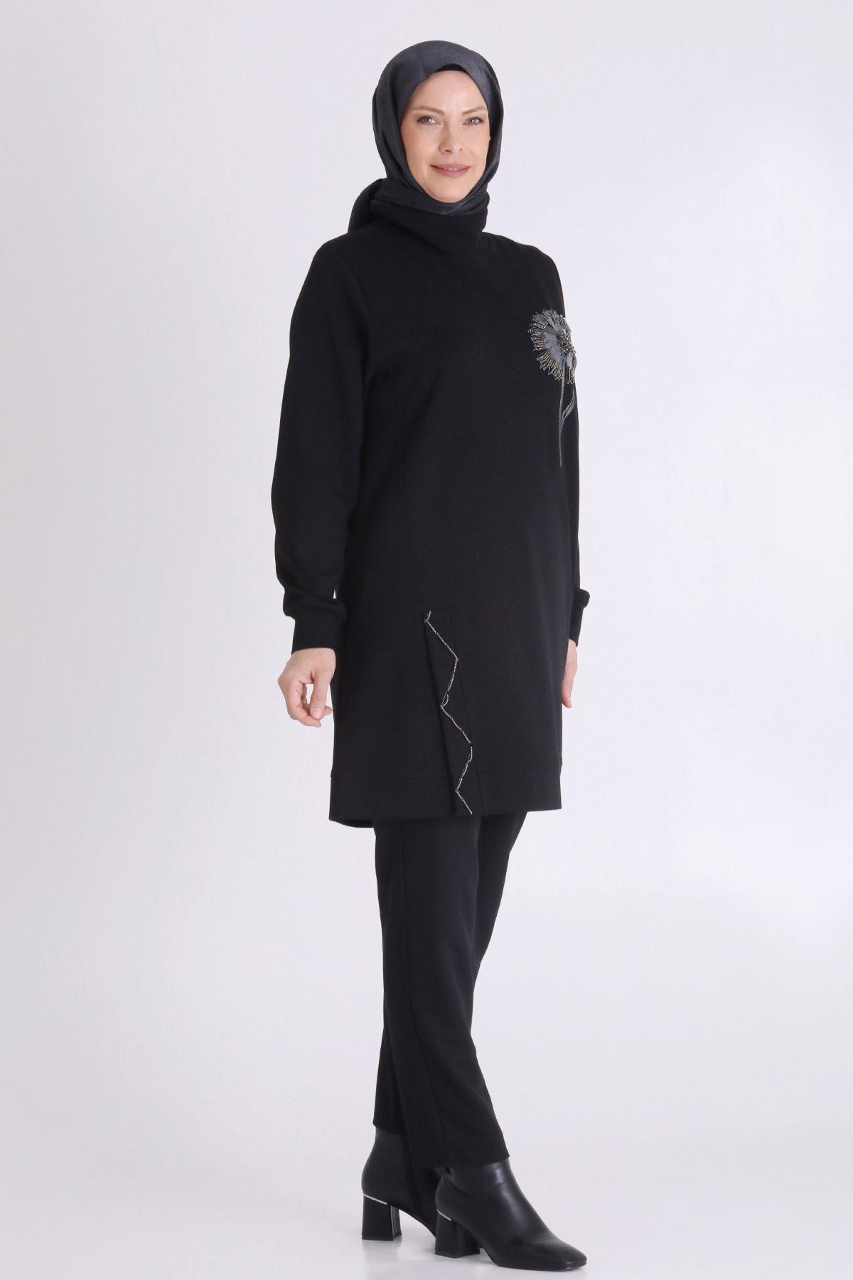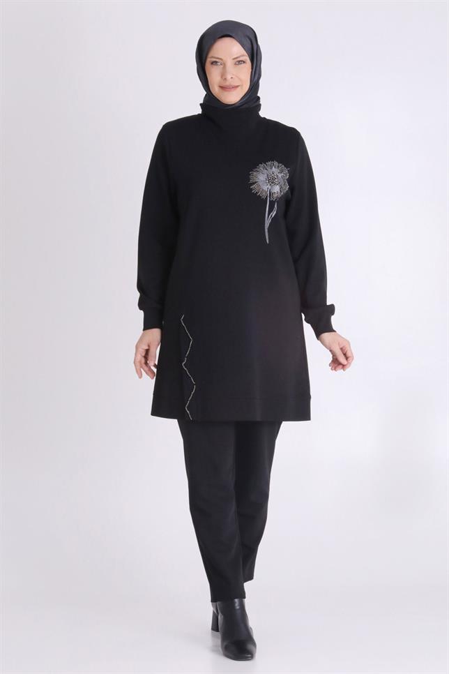 Çiçek İşlemeli Rahat Kesim Büyük Beden Tunik Siyah OTW20126