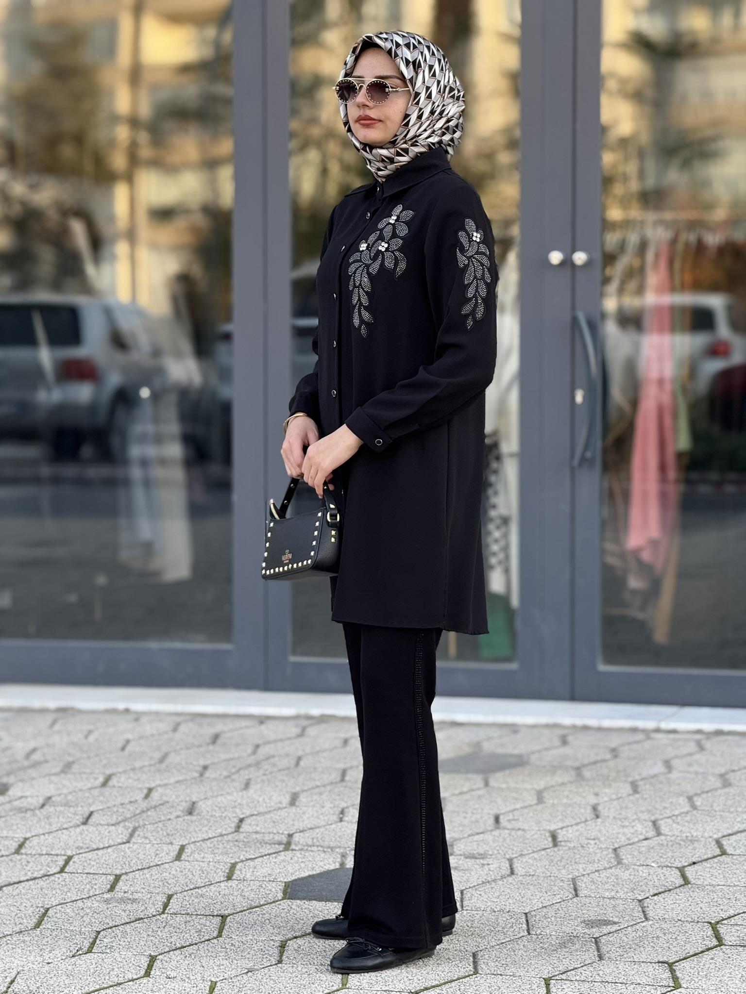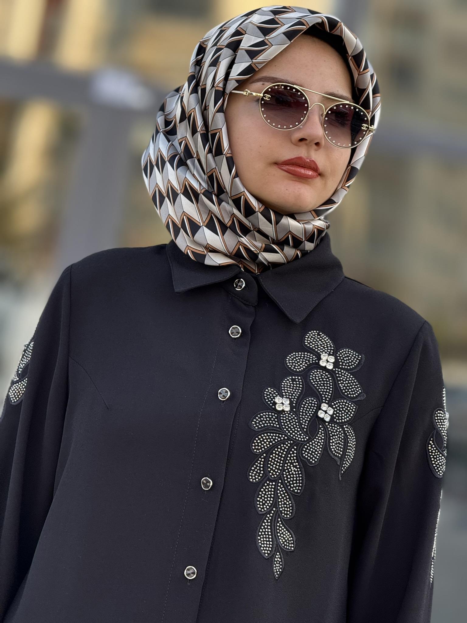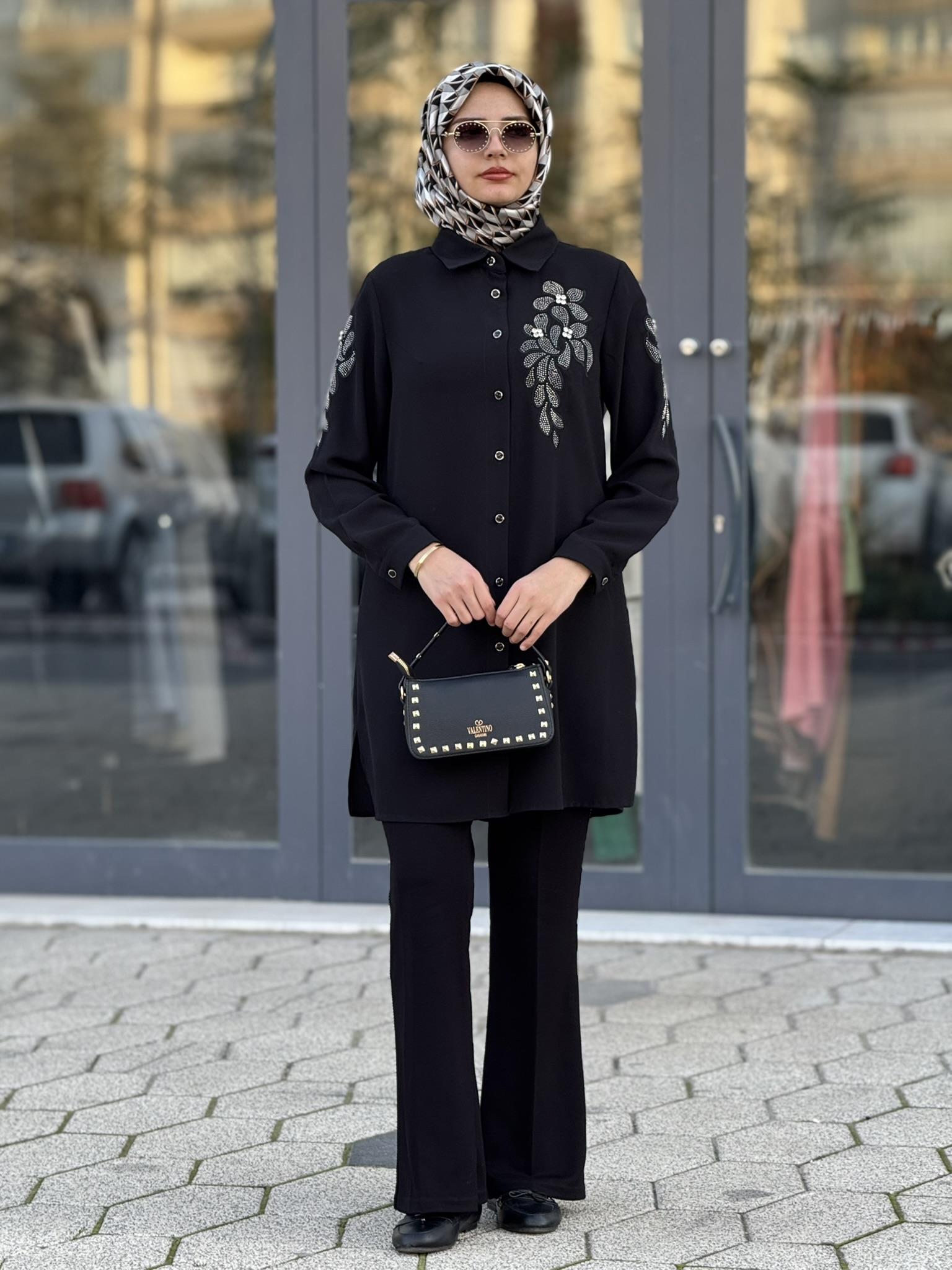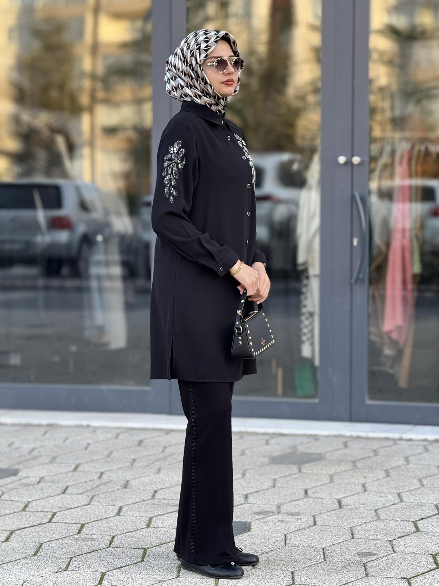 Taş işlemeli zarif detaylarıyla öne çıkan bu tunik, krep kumaşın dökümlü ve tok duruşuyla birleşerek modern ve şık bir silüet sunar. Göğüs ve kol bölgesindeki çiçek formundaki taşlar ışığı zarifçe yansıtarak kombininize elegant bir dokunuş kazandırır. Rahat kalıbı, düğmeli önü ve nefes alabilen kumaşı ile hem günlük hem özel davet stillerinde konforlu bir şıklık sağlar.
