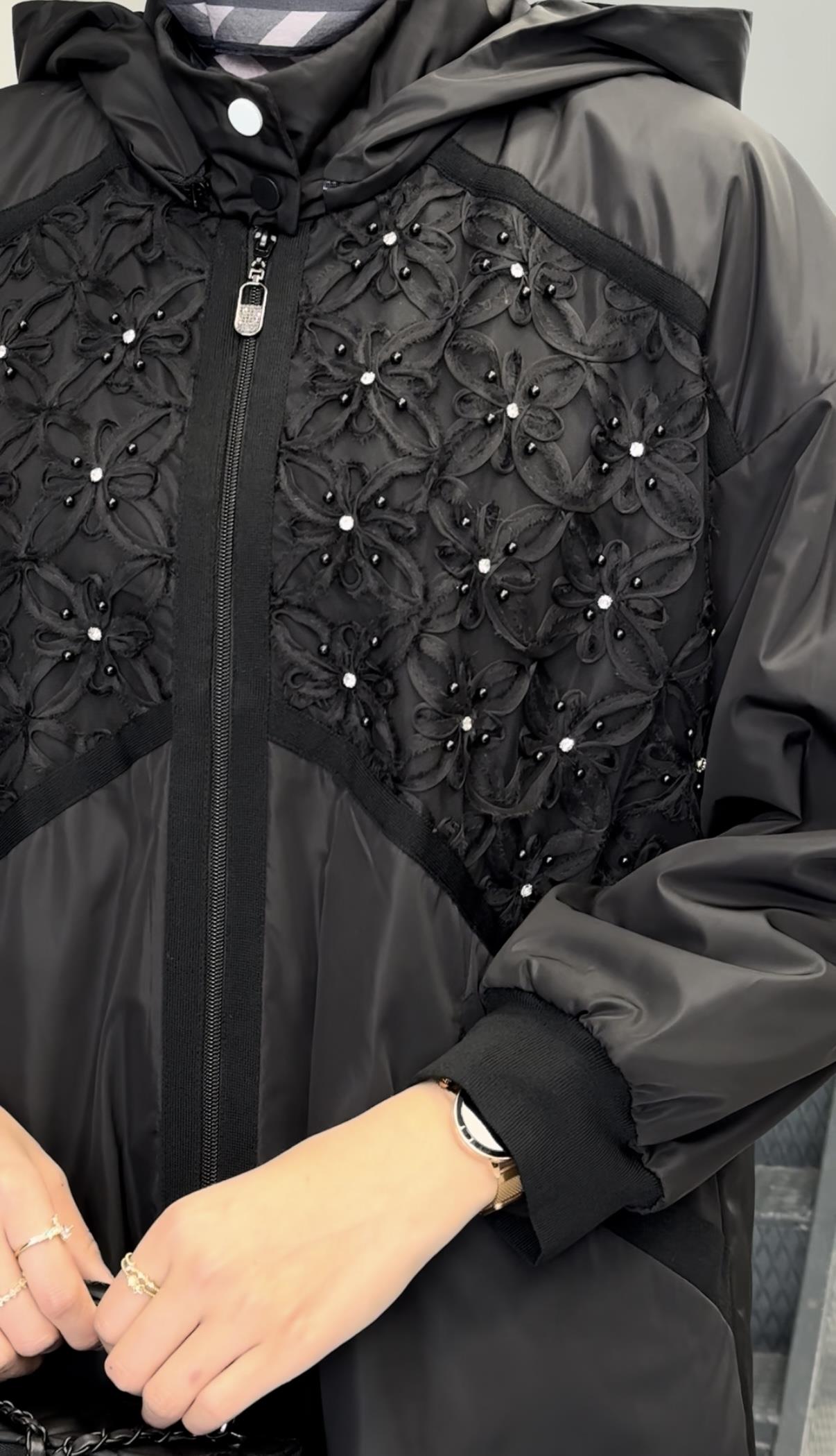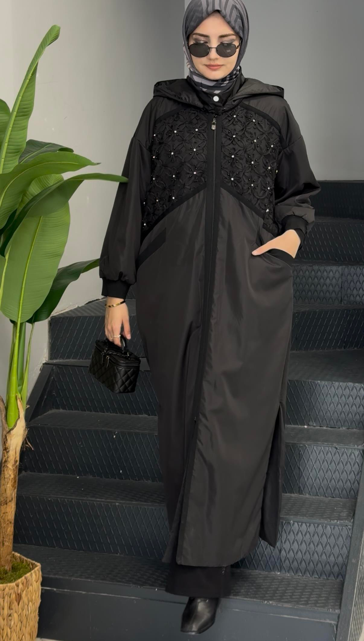Dantel ve Taş Detaylı Kapüşonlu Spor Ferace Siyah OTW50801