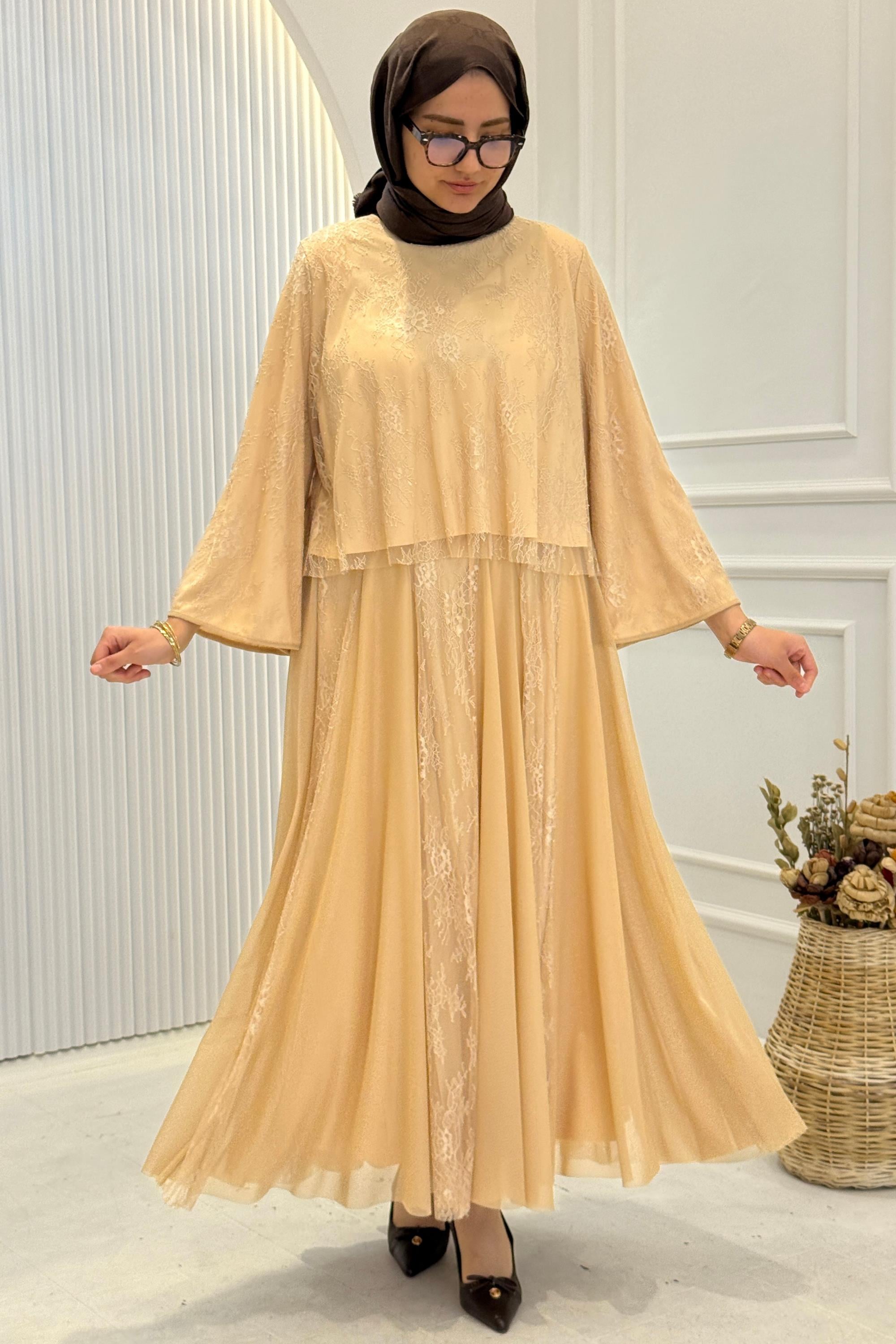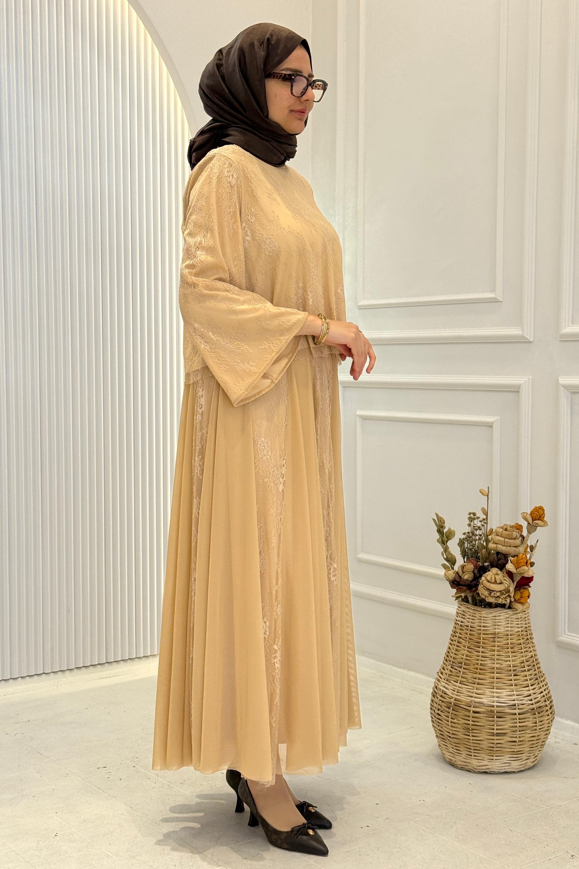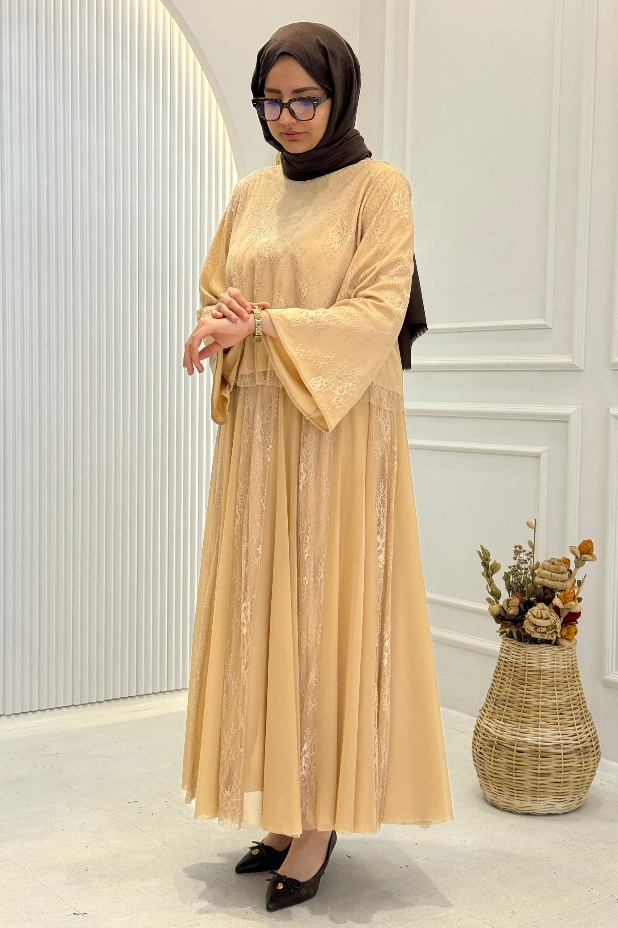 Dantelli Şifon Etekli Tesettür Takım Bej OTW8624